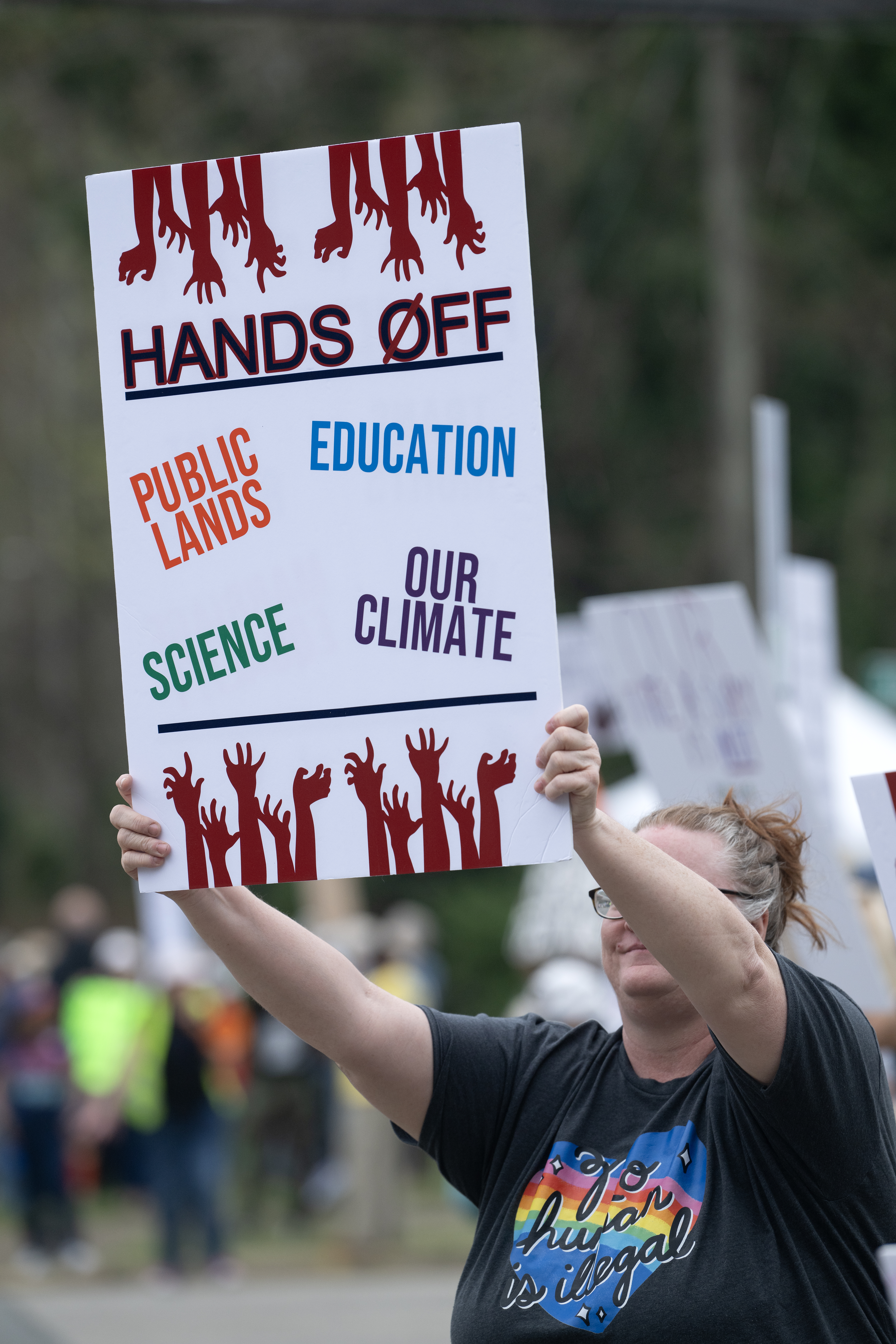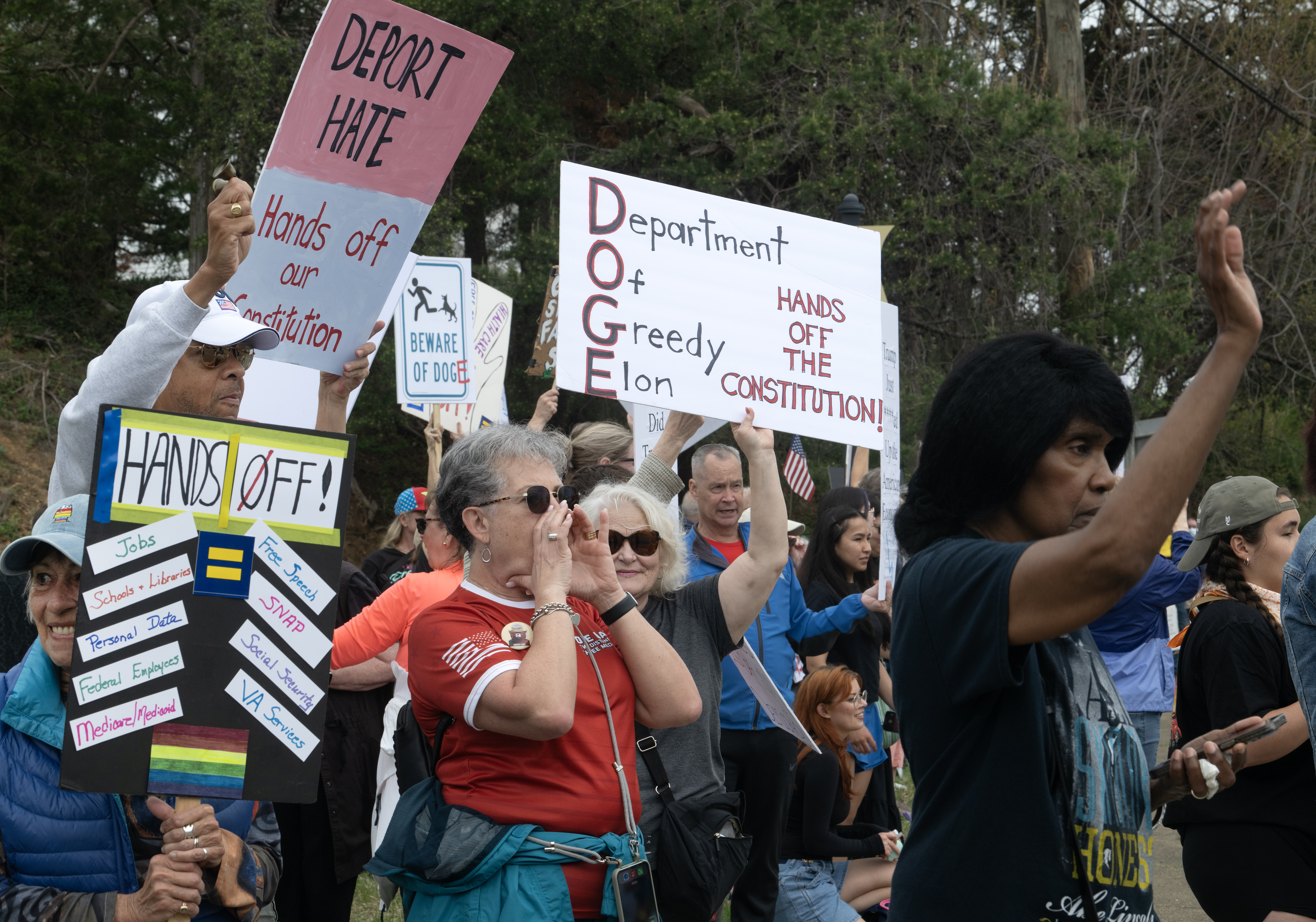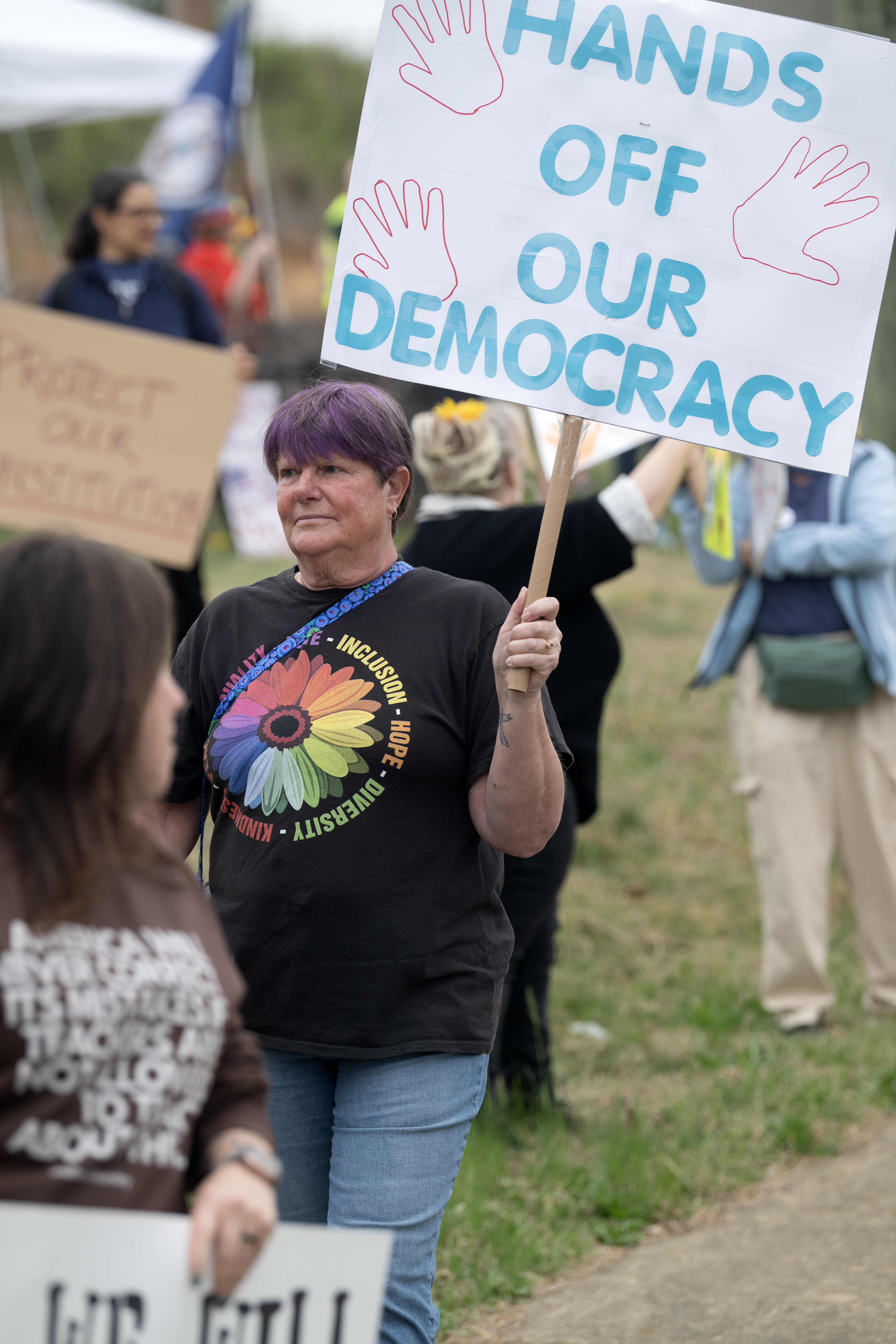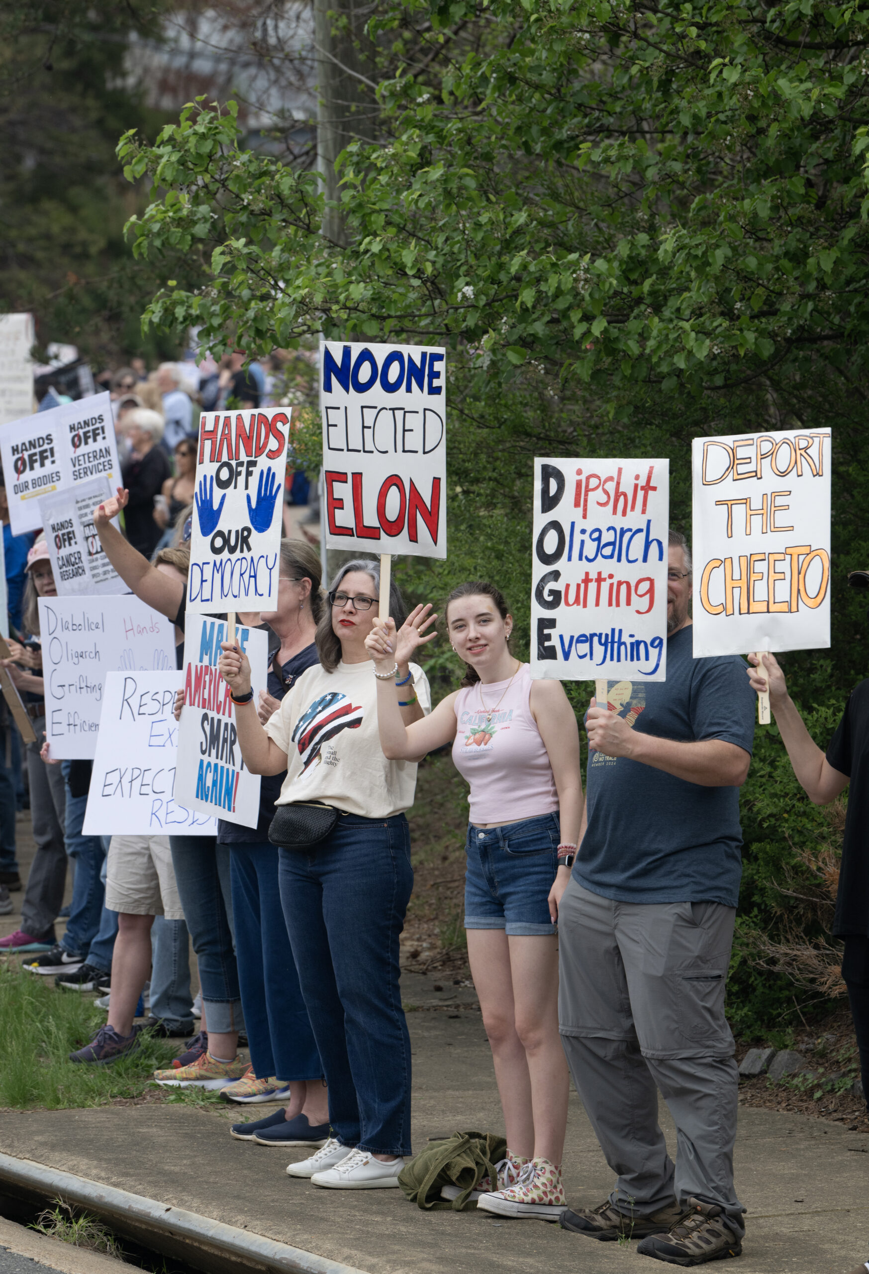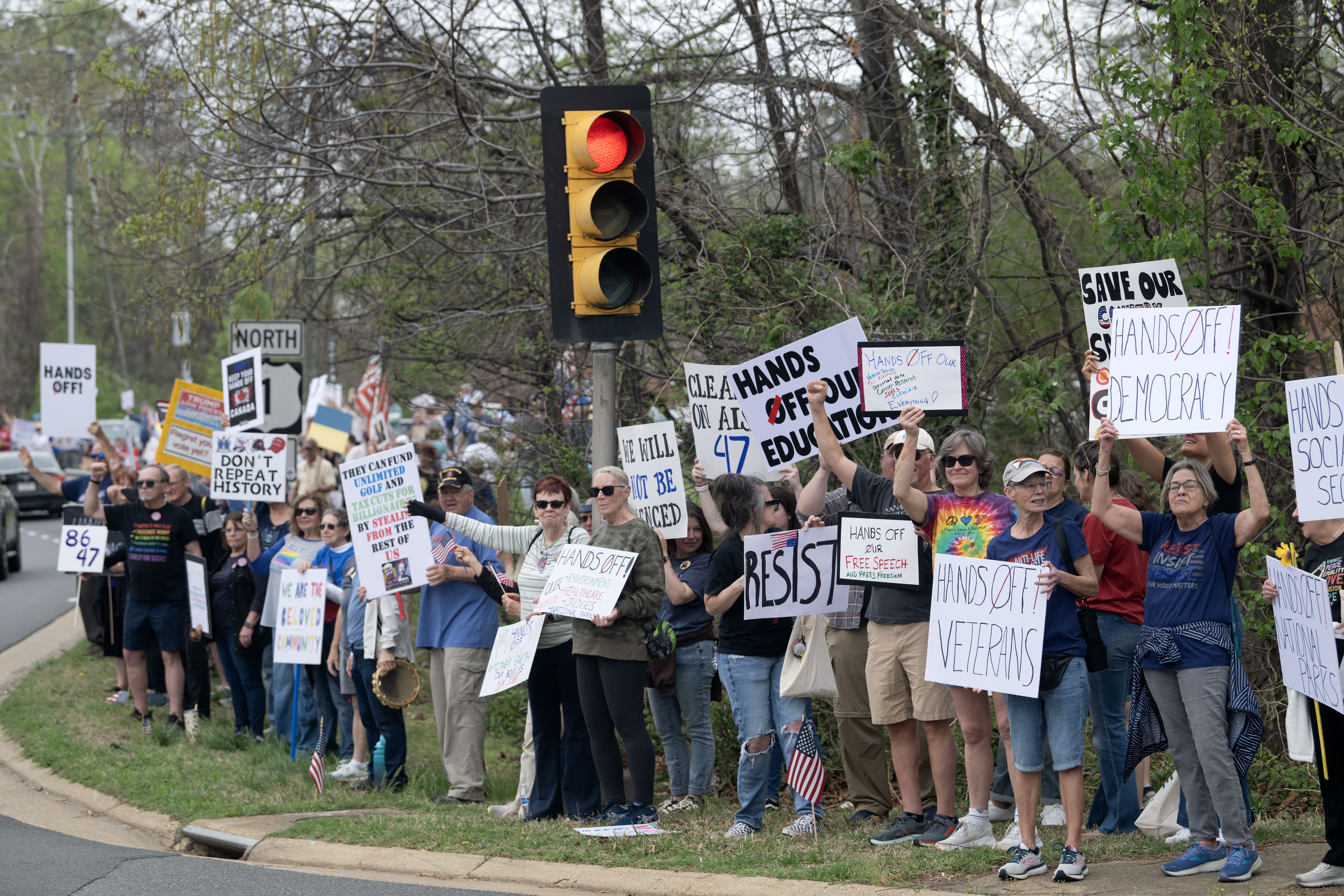 Members of the community gather during the “Hands Off” rally to protest President Donald Trump and Elon Musk’s agendas Saturday April 5, 2025. Photo by Jeff Kearney.