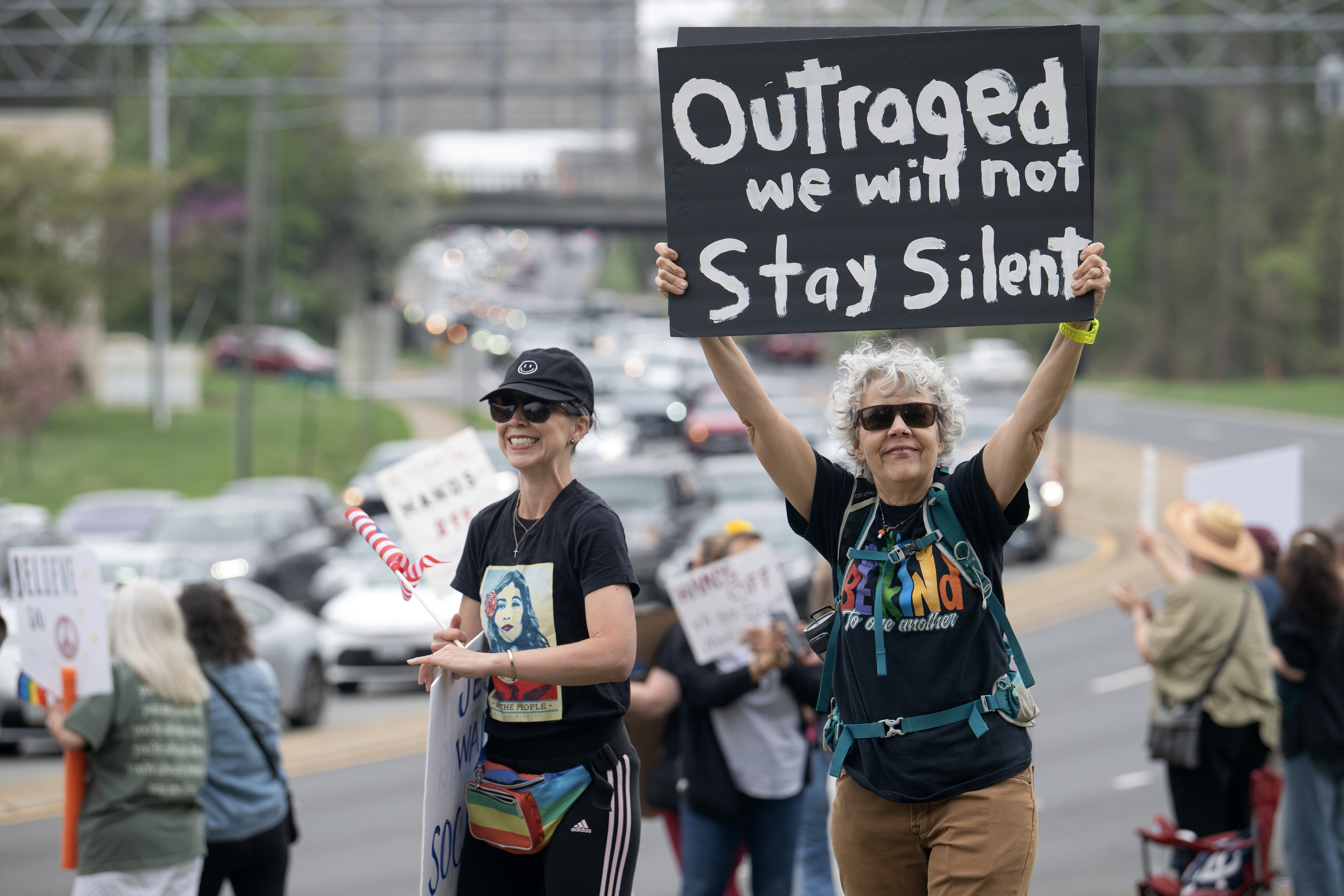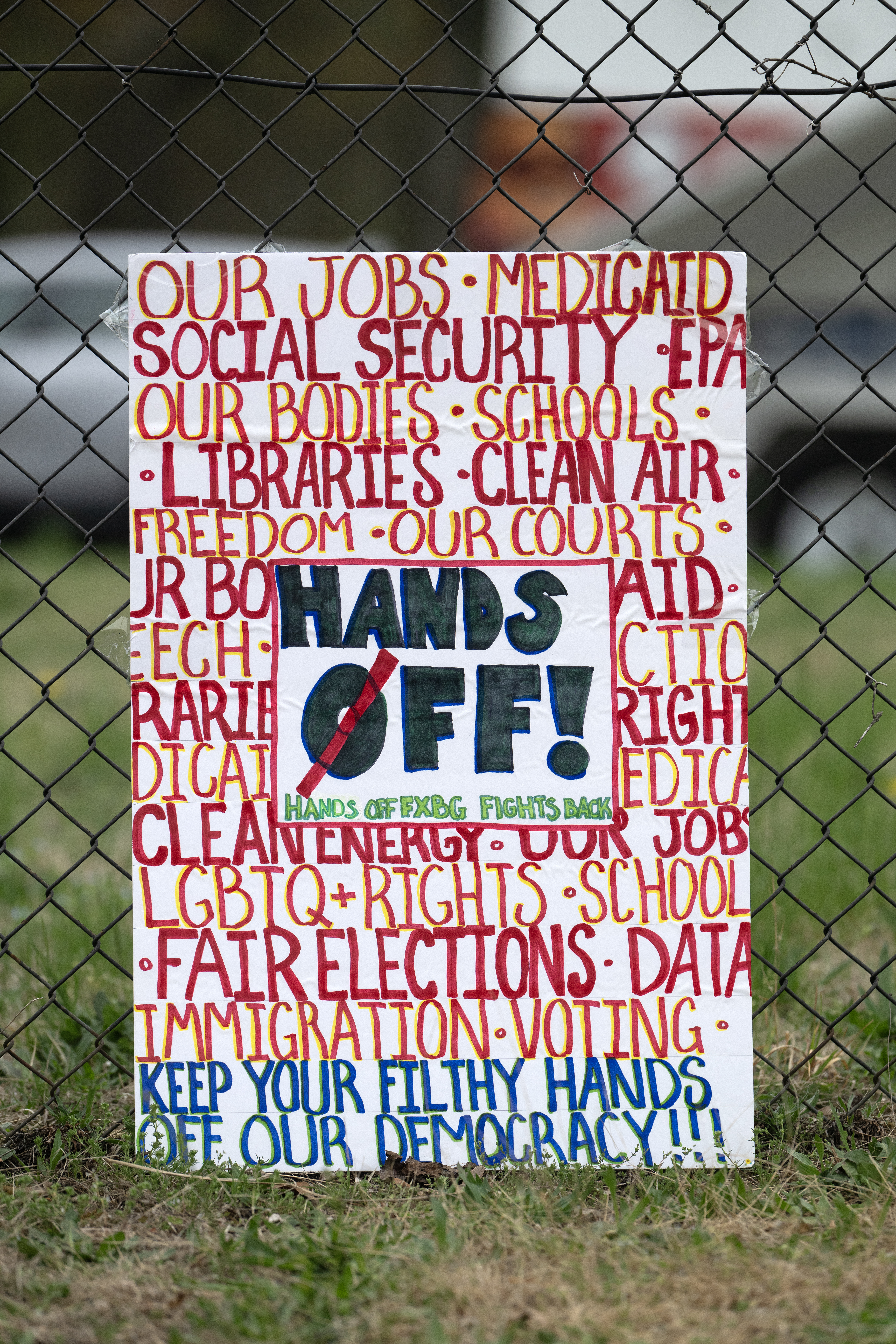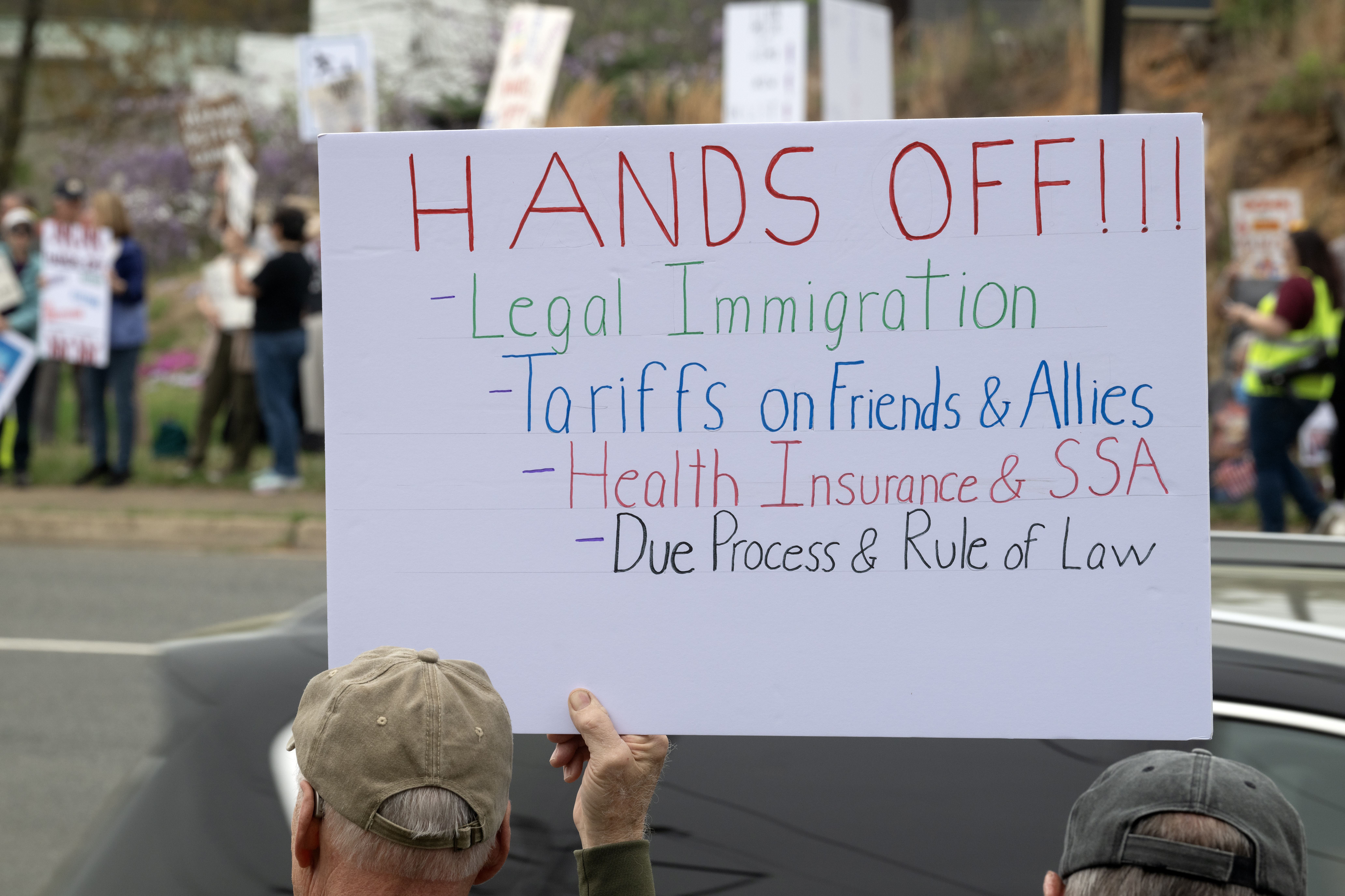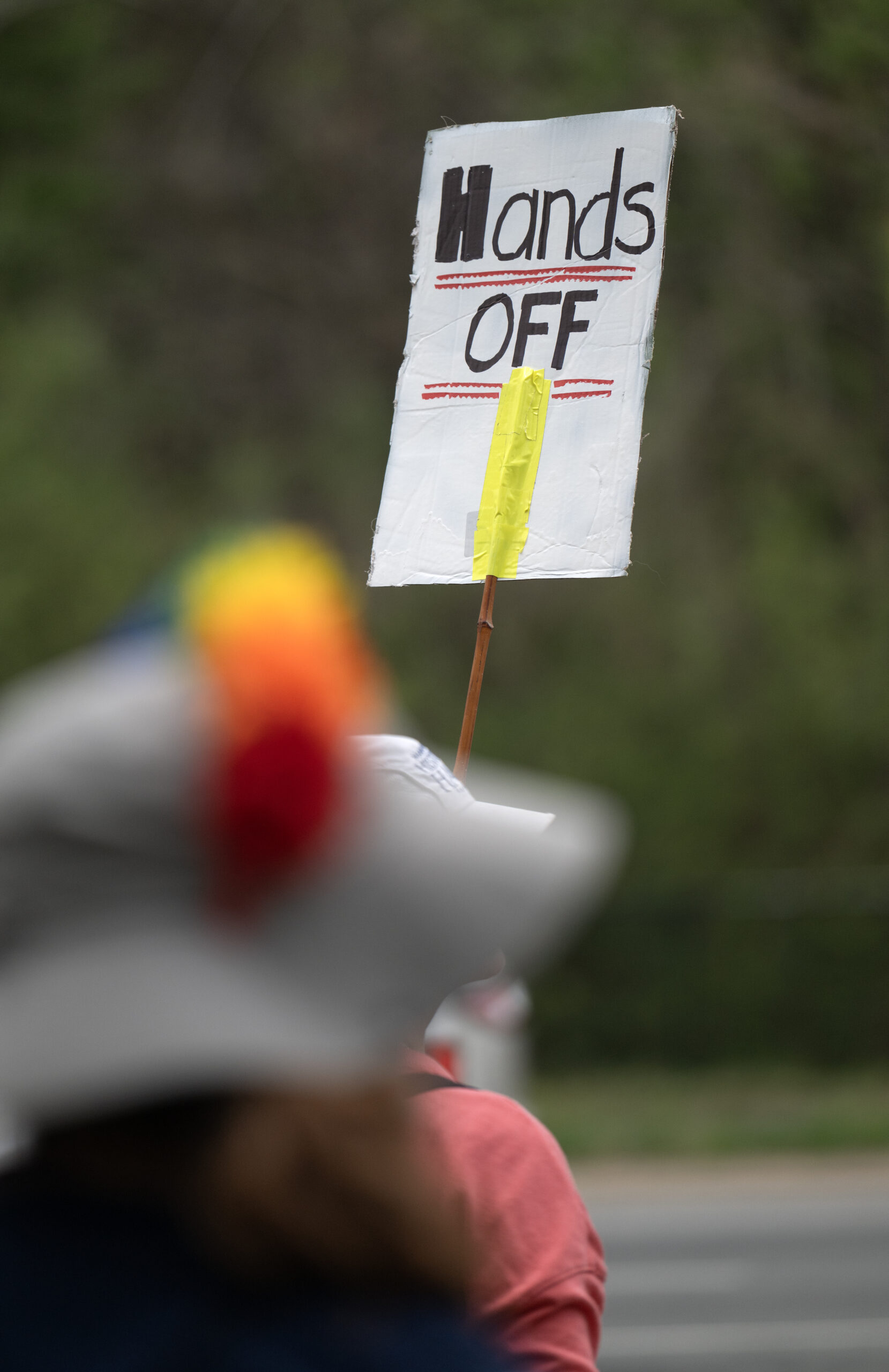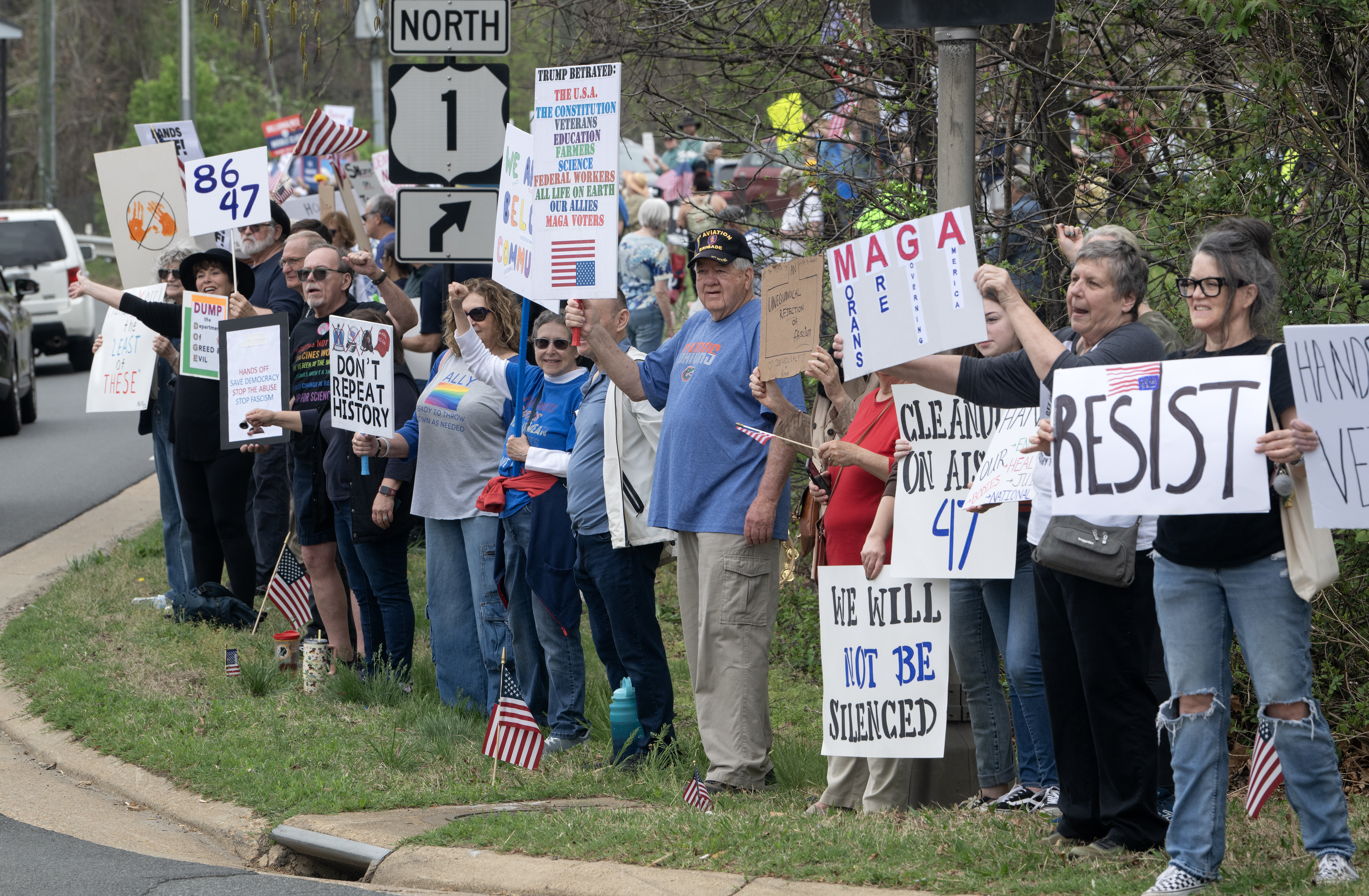 Members of the community gather during the “Hands Off” rally to protest President Donald Trump and Elon Musk’s agendas Saturday April 5, 2025. Photo by Jeff Kearney.