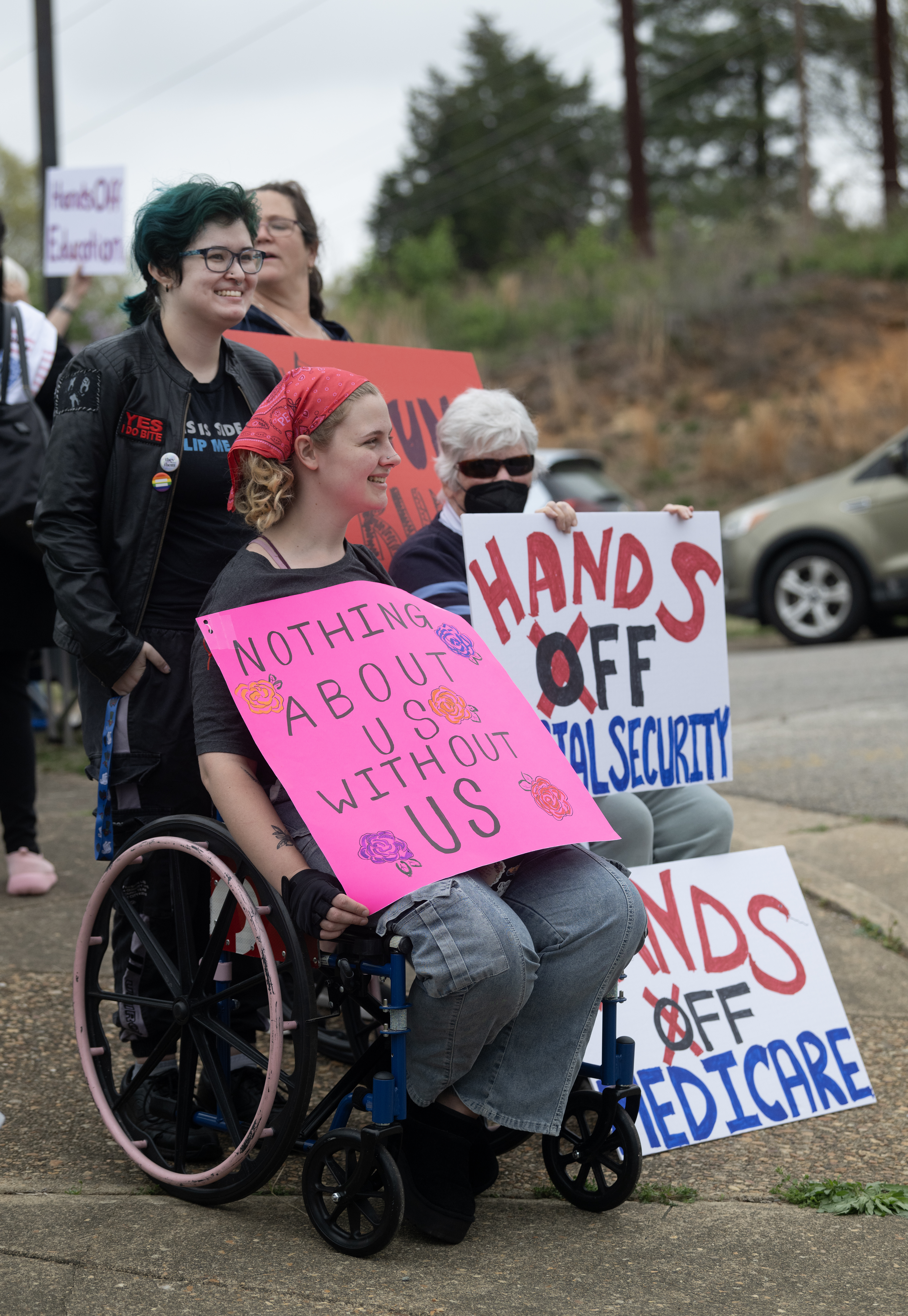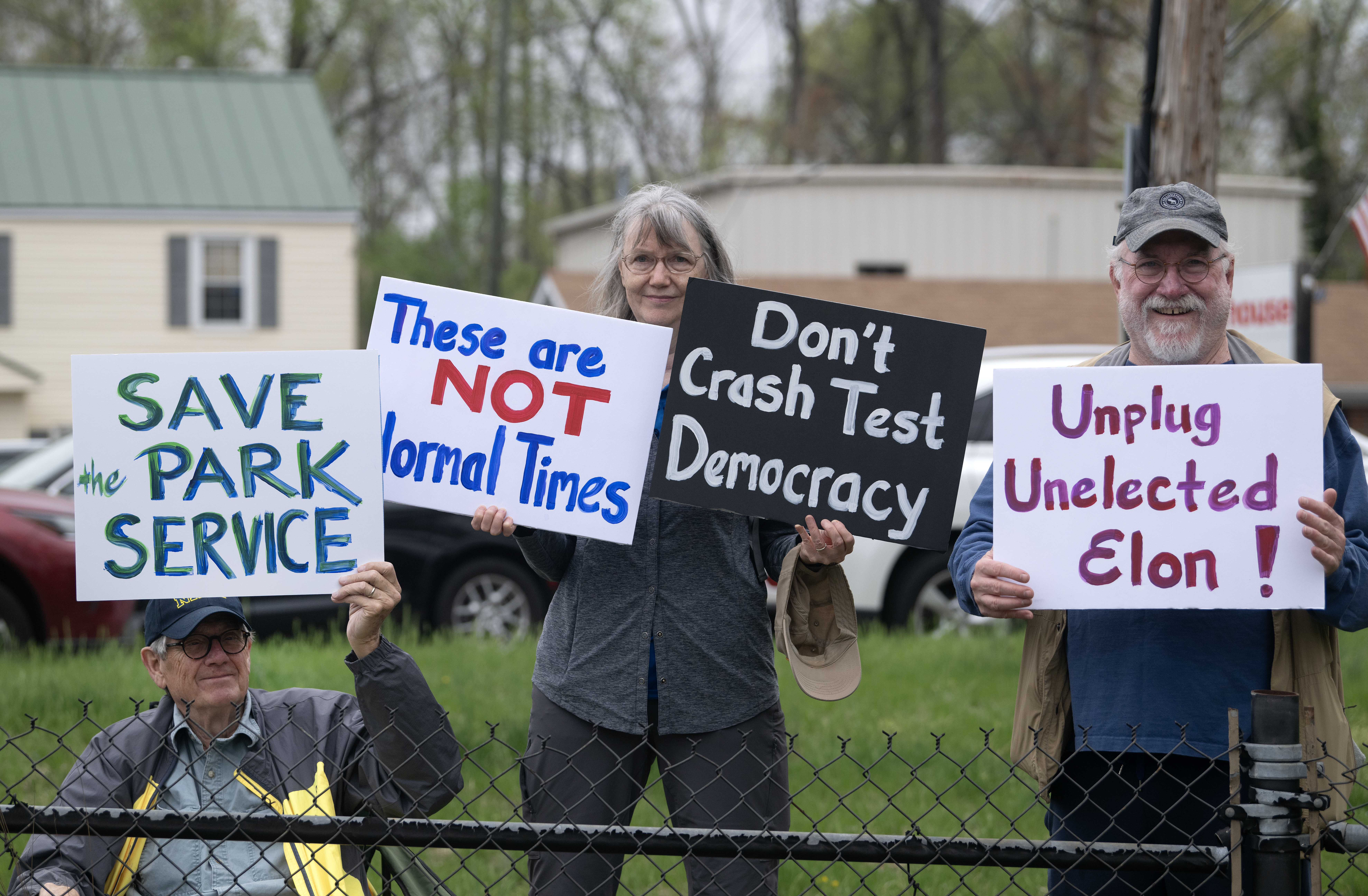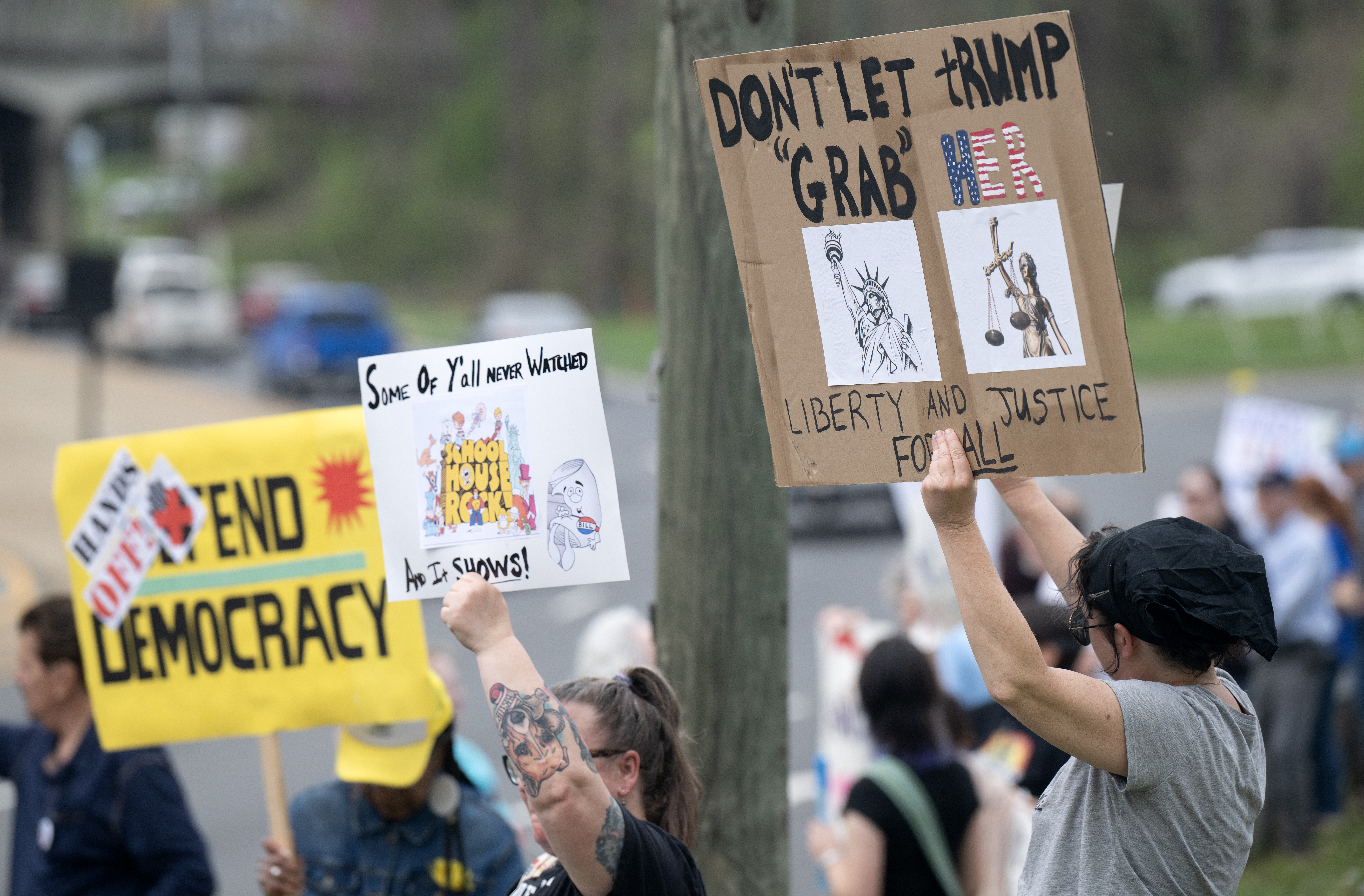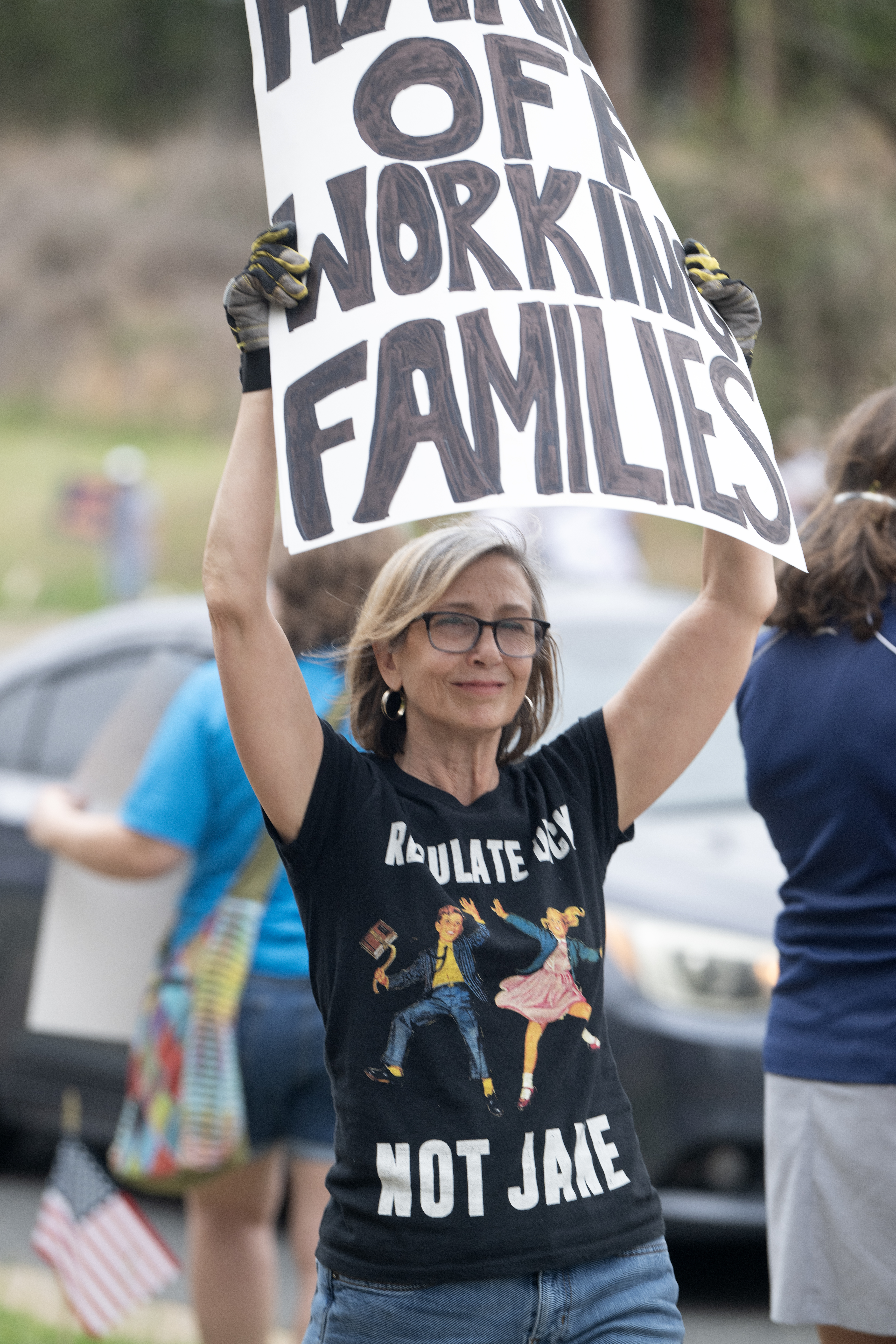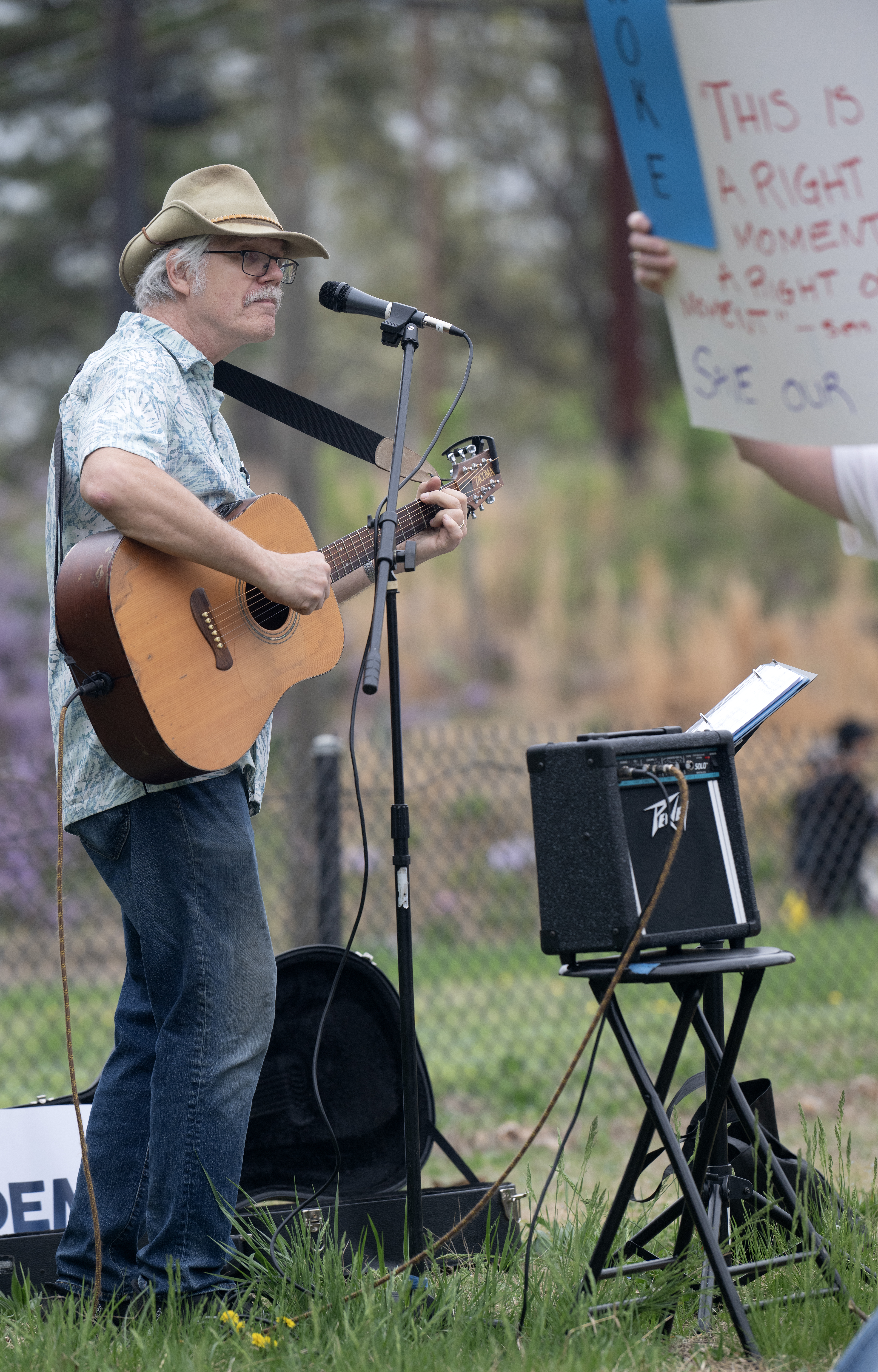 Members of the community gather during the “Hands Off” rally to protest President Donald Trump and Elon Musk’s agendas Saturday April 5, 2025. Photo by Jeff Kearney.