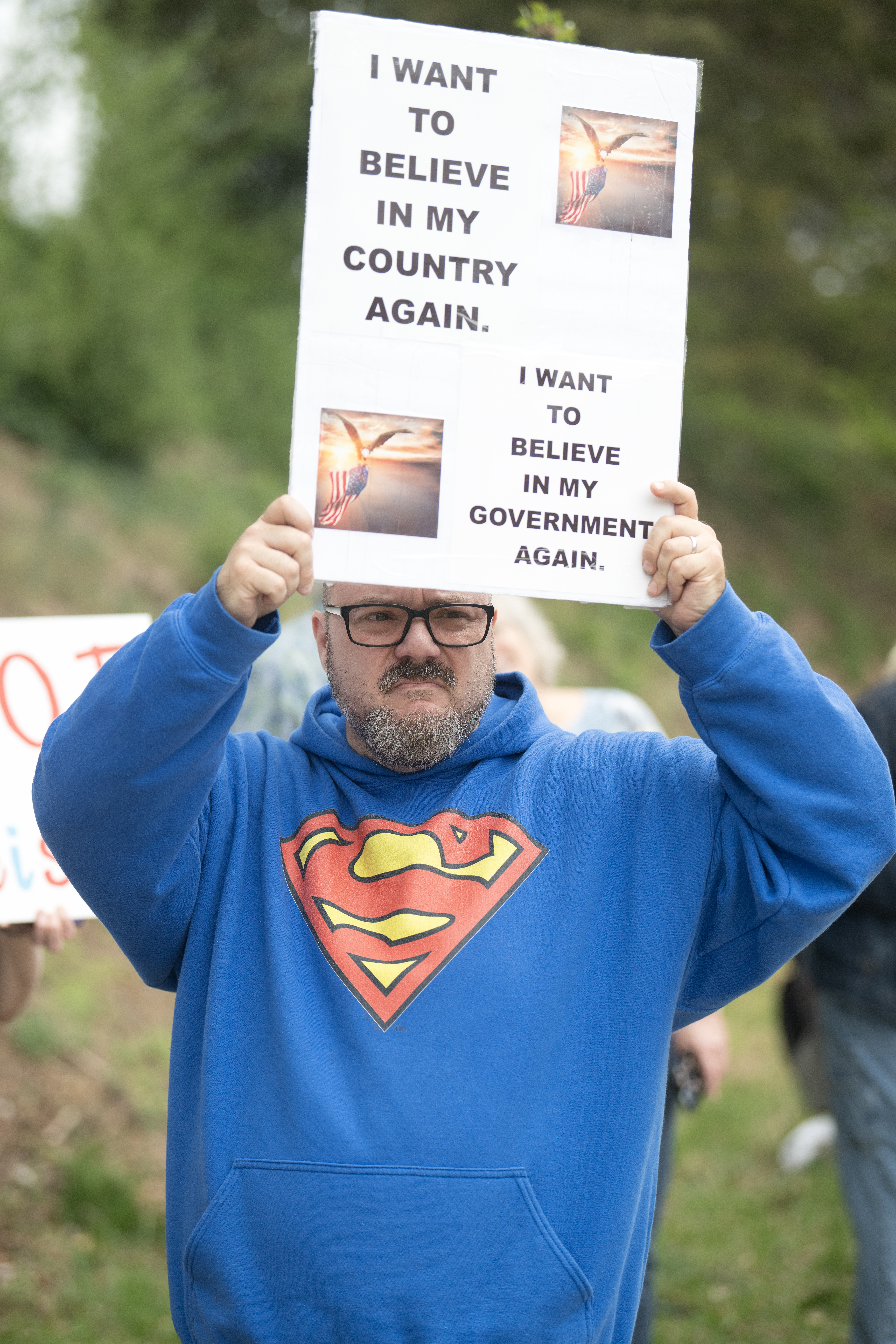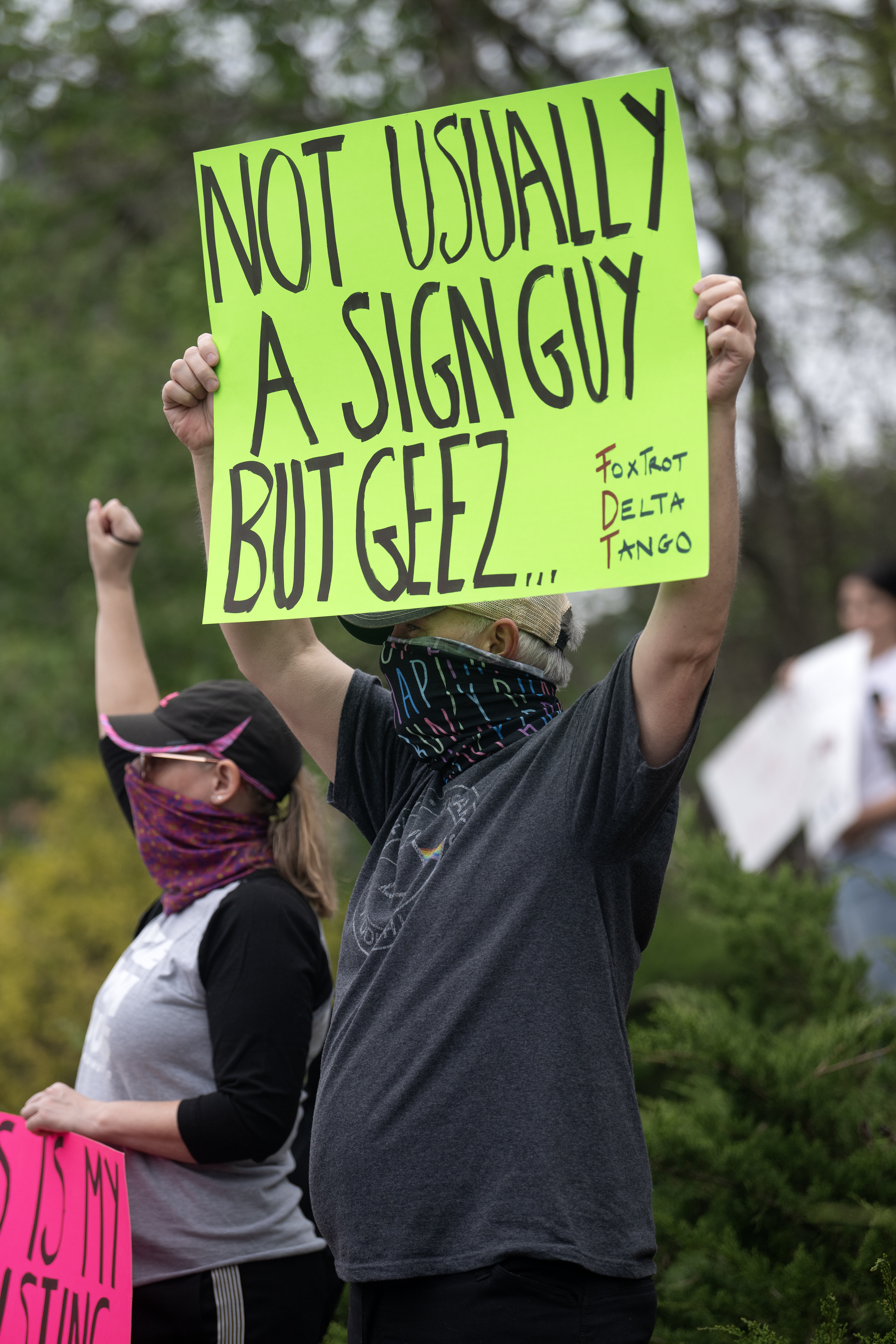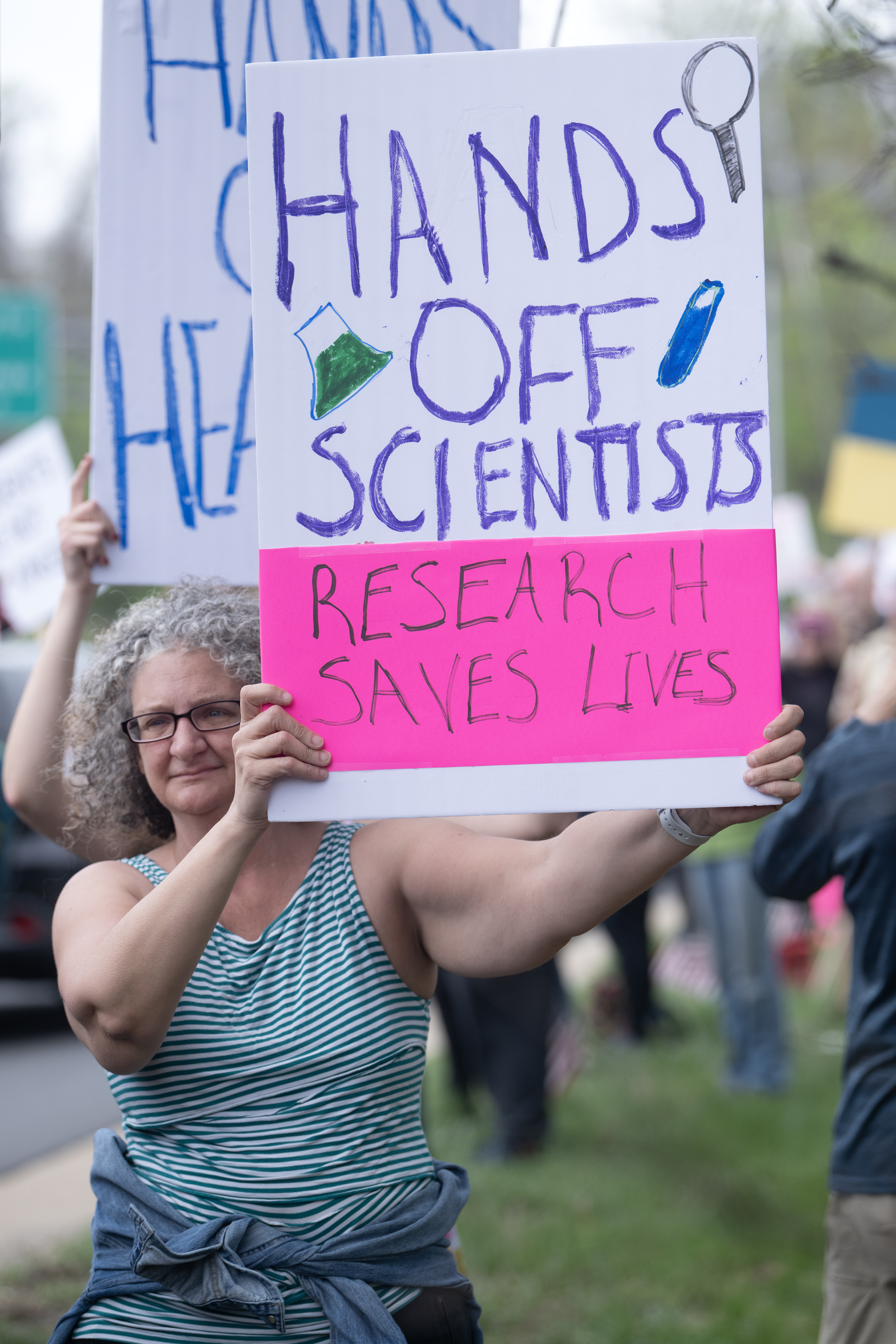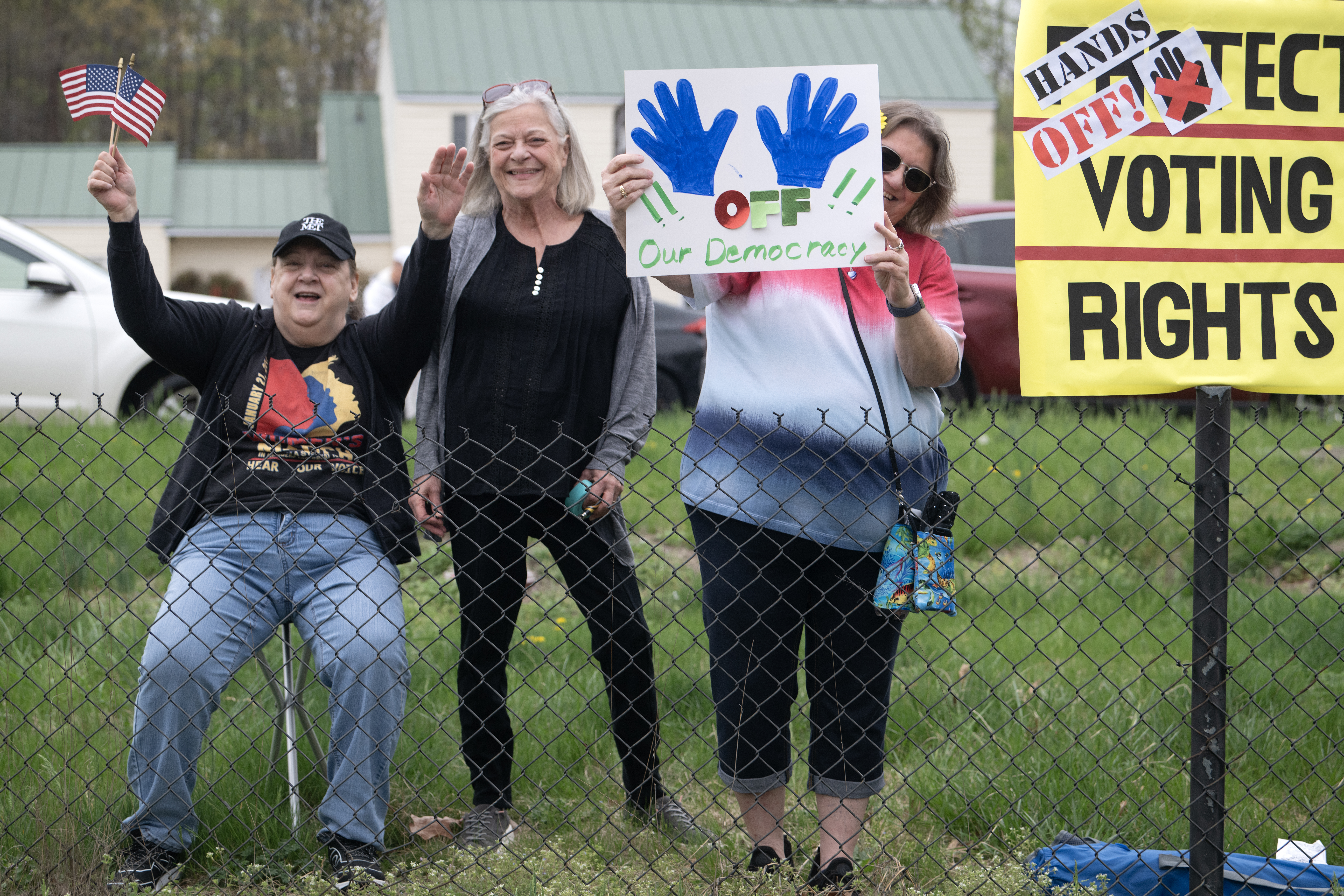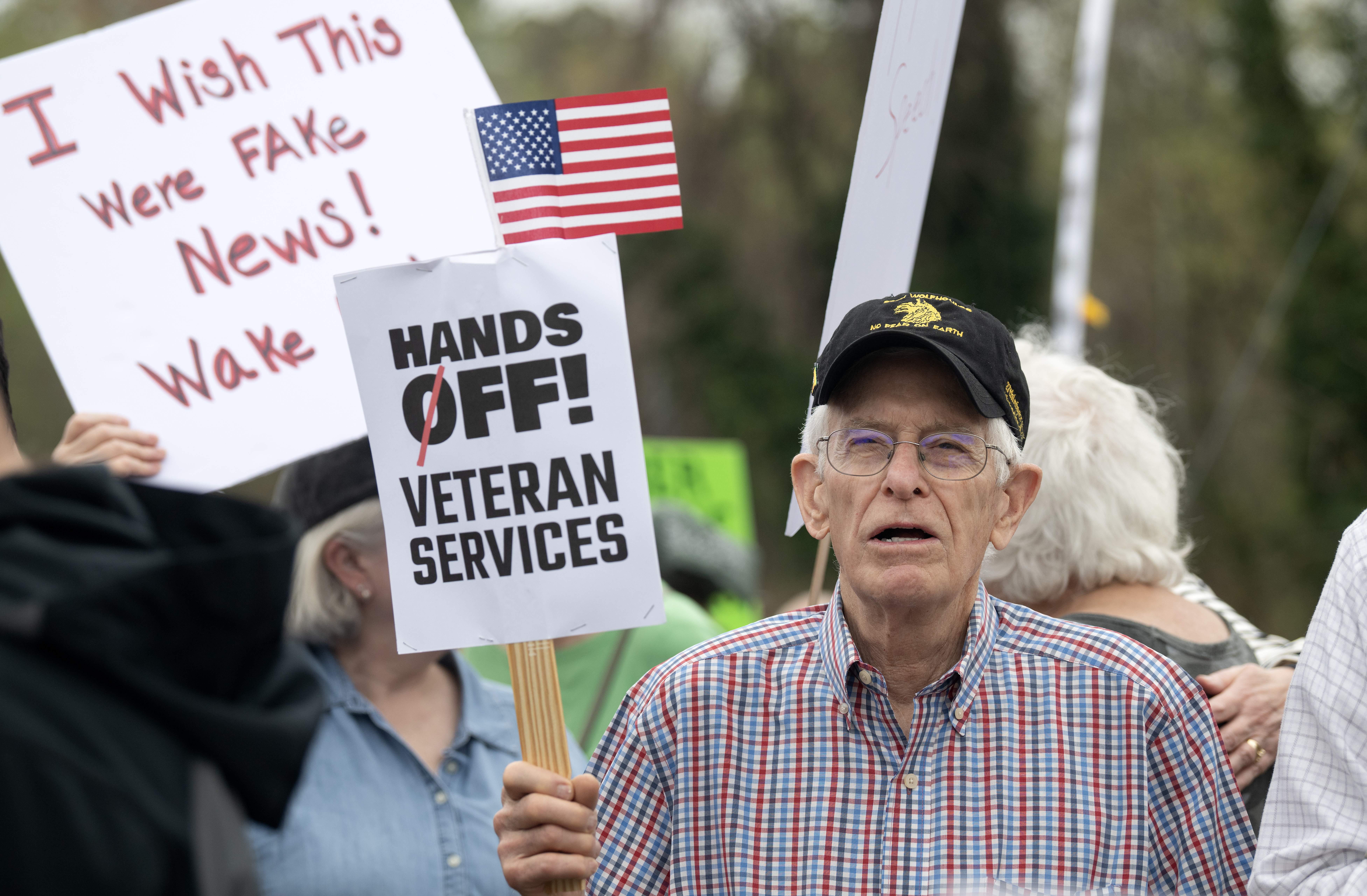 Members of the community gather during the “Hands Off” rally to protest President Donald Trump and Elon Musk’s agendas Saturday April 5, 2025. Photo by Jeff Kearney.