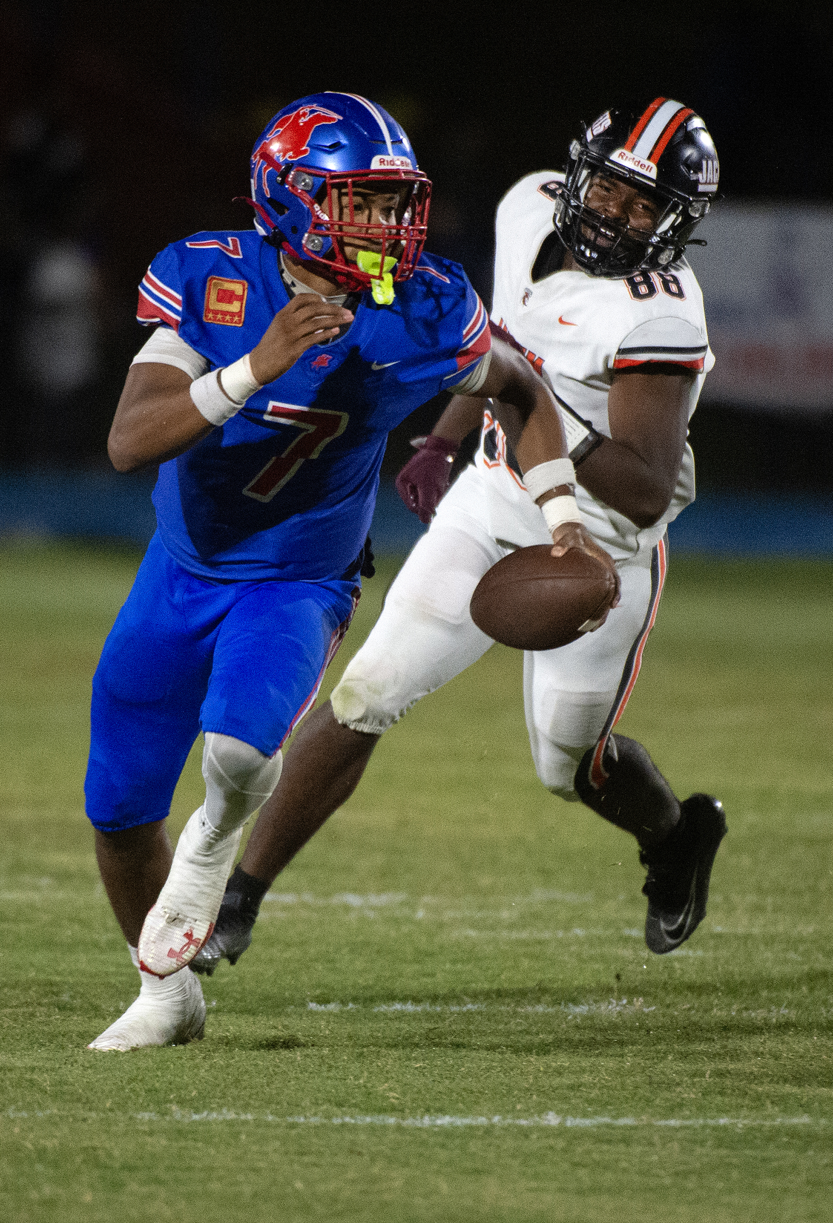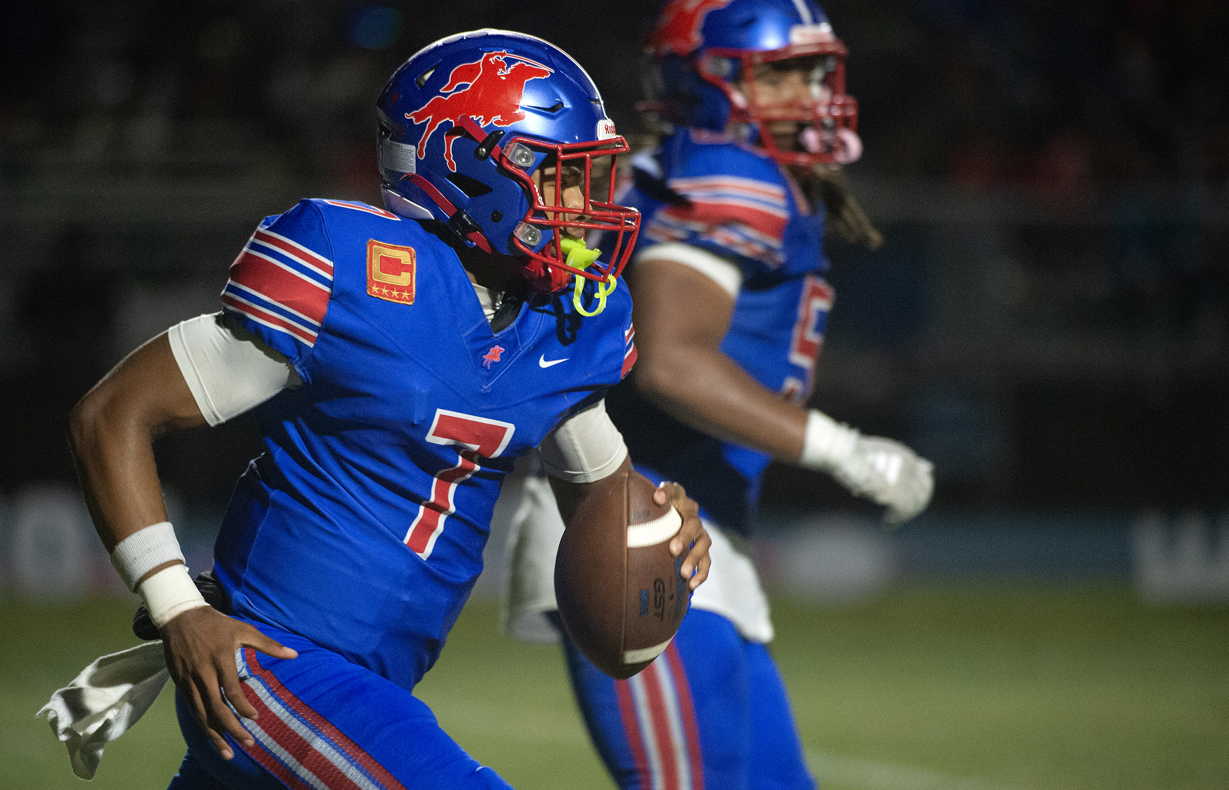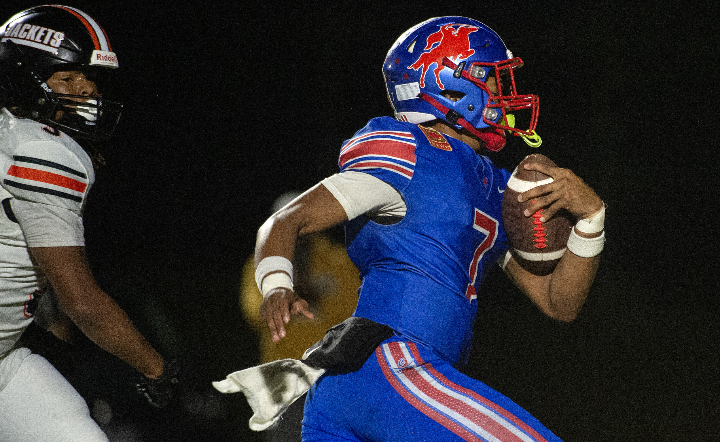Cavalier QB Blake Morris (7) makes his way downfield towards the end zone as Caroline goes on to defeat James Monroe 42 to 7 Friday October 3, 2025. Photo by Jeff Kearney.