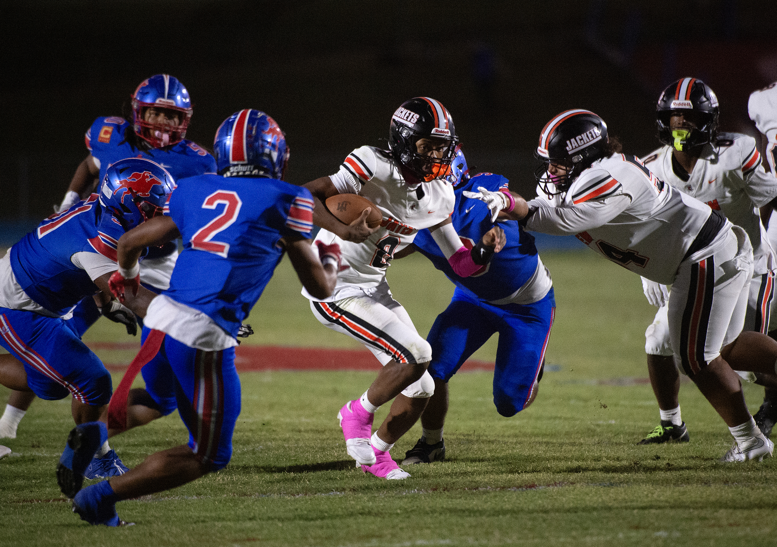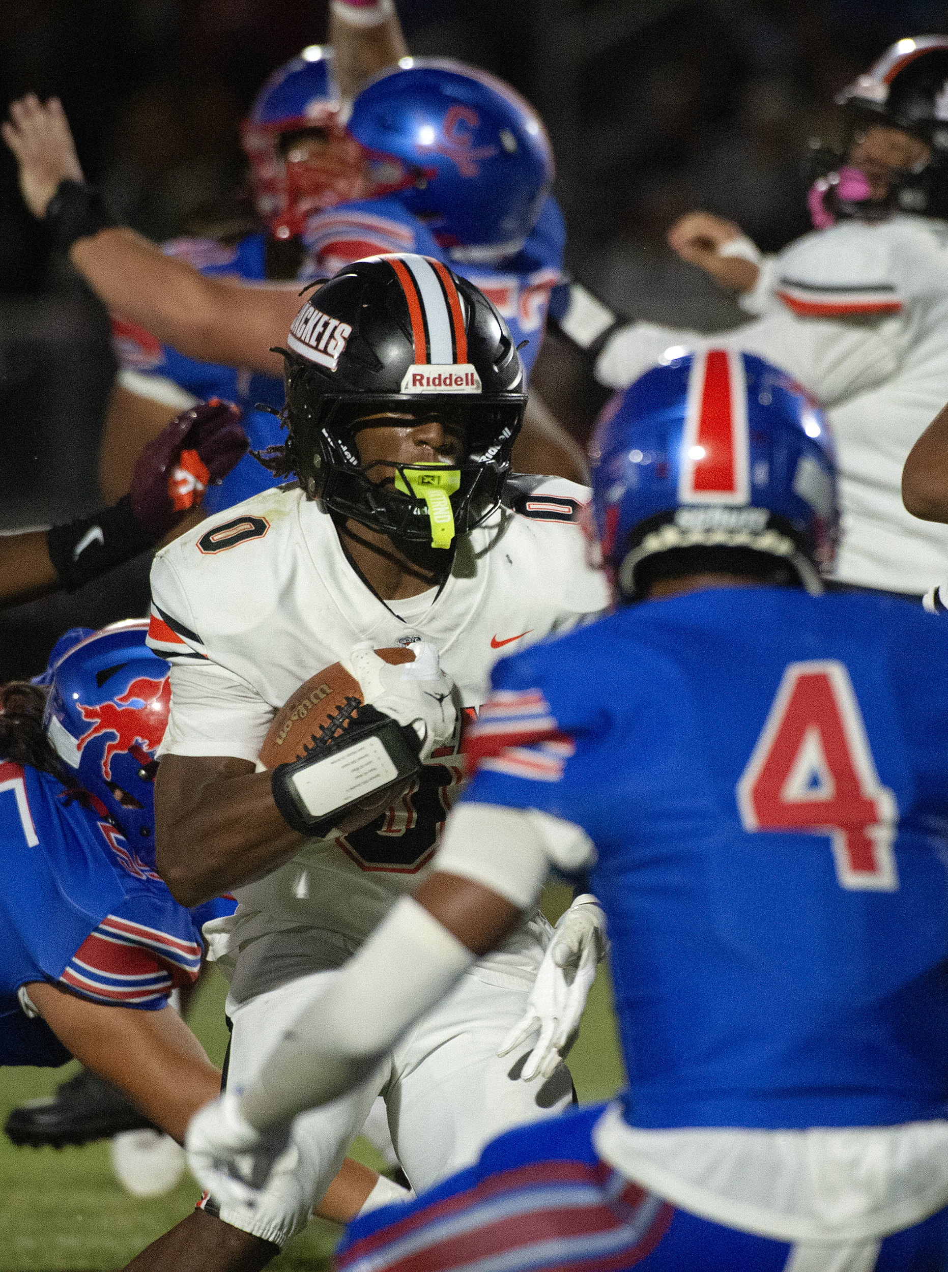 With Cavaliers and Yellow Jackets swirling all around Jayem’s Kamrin Kea (0) looks to find a way past Blair Morris (4) as Caroline goes on to win 42 to 7 Friday October 3, 2025. Photo by Jeff Kearney.
