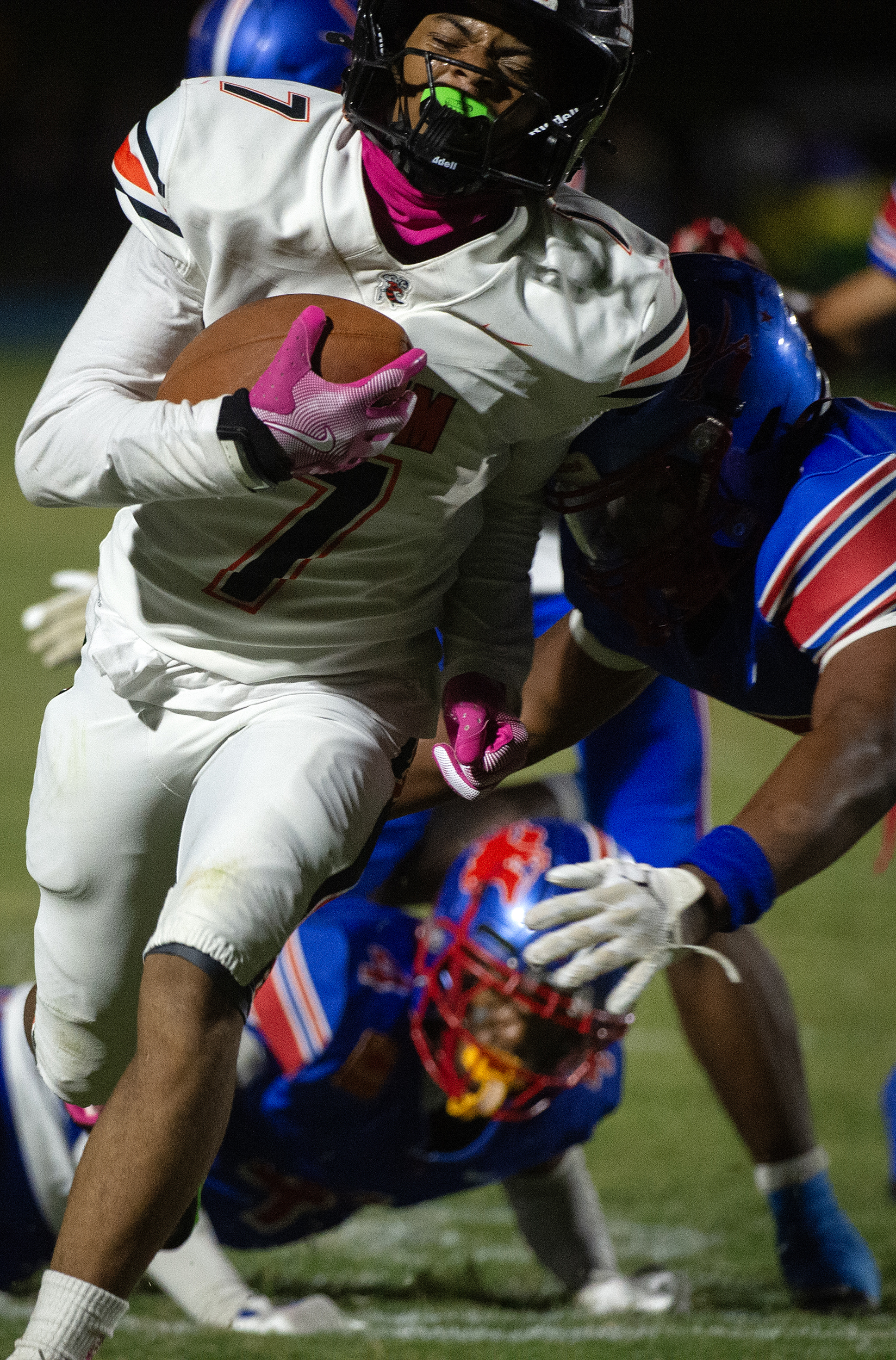 Yellow Jacket Kamarie Randall (5) meets Cavalier Tre Cloes (5) at the line of scrimmage as James Monroe loses to Caroline 42 to 7 Friday October 3, 2025. Photo by Jeff Kearney.