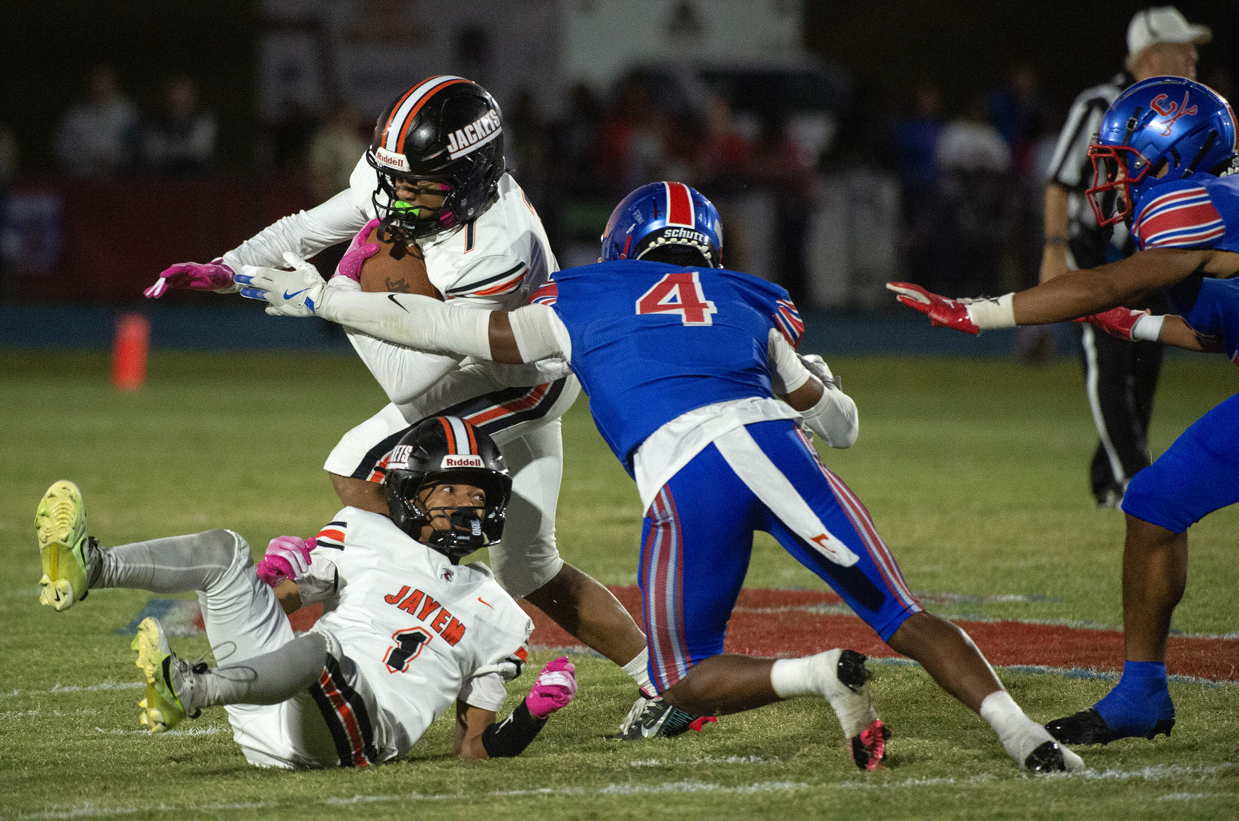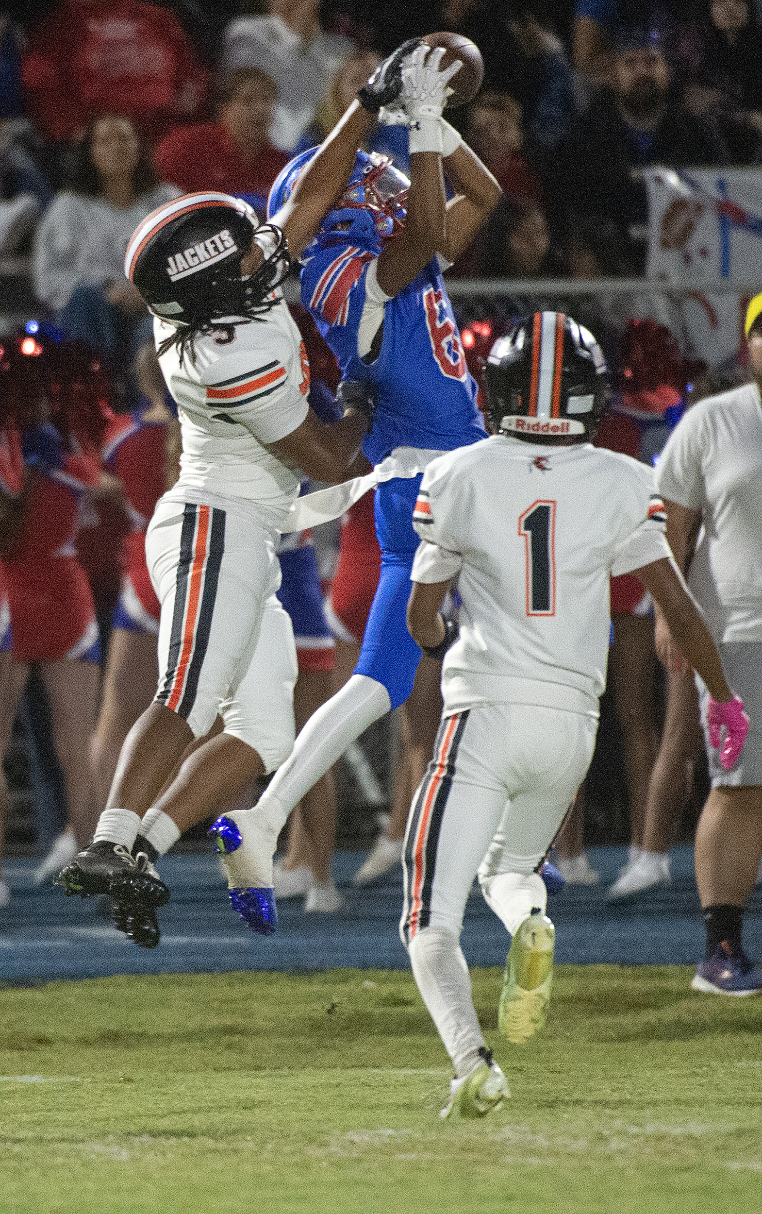 Caroline’s Xavier Pryor’s (6) under pressure catch against Jayem’s Jordon Juggins (3) and Jaylin Morgan (1) gets brought back on an offensive interference call during the Cavaliers win over the Yellow Jackets Friday October 3, 2025. Photo by Jeff Kearney.