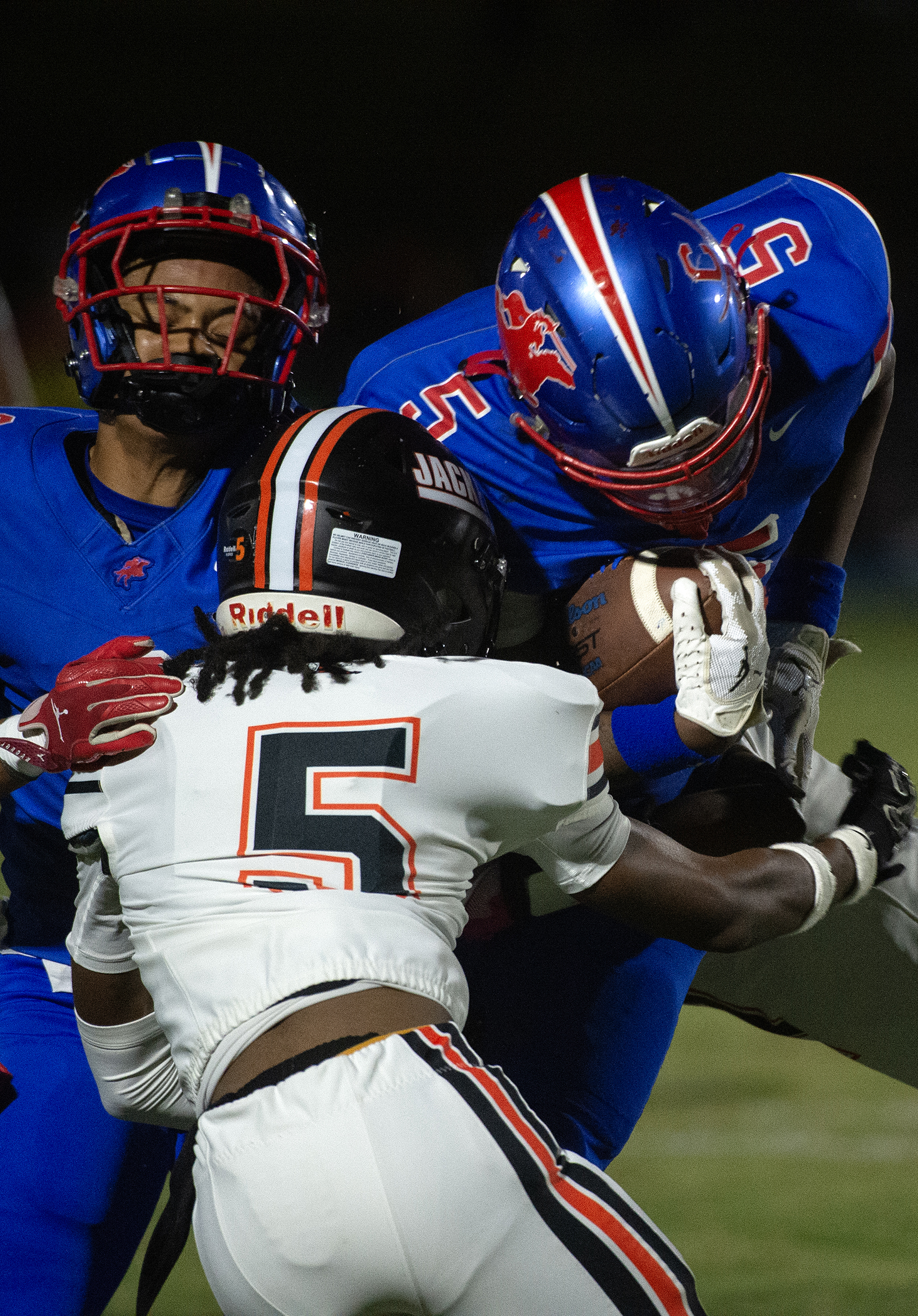 As Jayem’s Jakhi Hayden (7) rushes forward he’s met by Cavaliers Jordan Reynolds (15) and Gaivon Chenault (9) during the Yellow Jackets 42 – 7 loss to Caroline Friday October 3, 2025. Photo by Jeff Kearney.