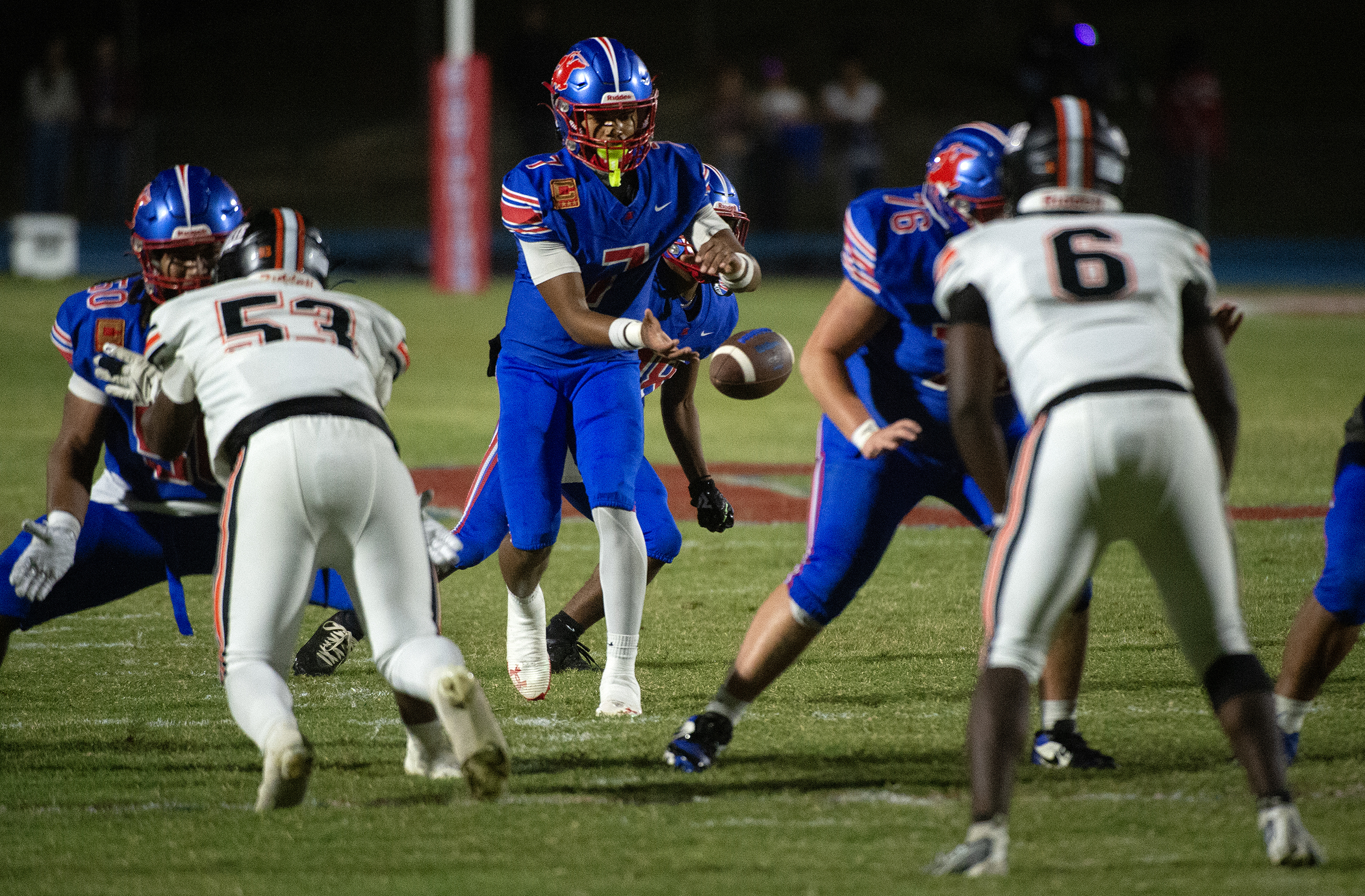 Cavalier QB Blake Morris (7) takes the snap against Jayem as Caroline defeats the Yellow Jackets Friday October 3, 2025. Photo by Jeff Kearney.