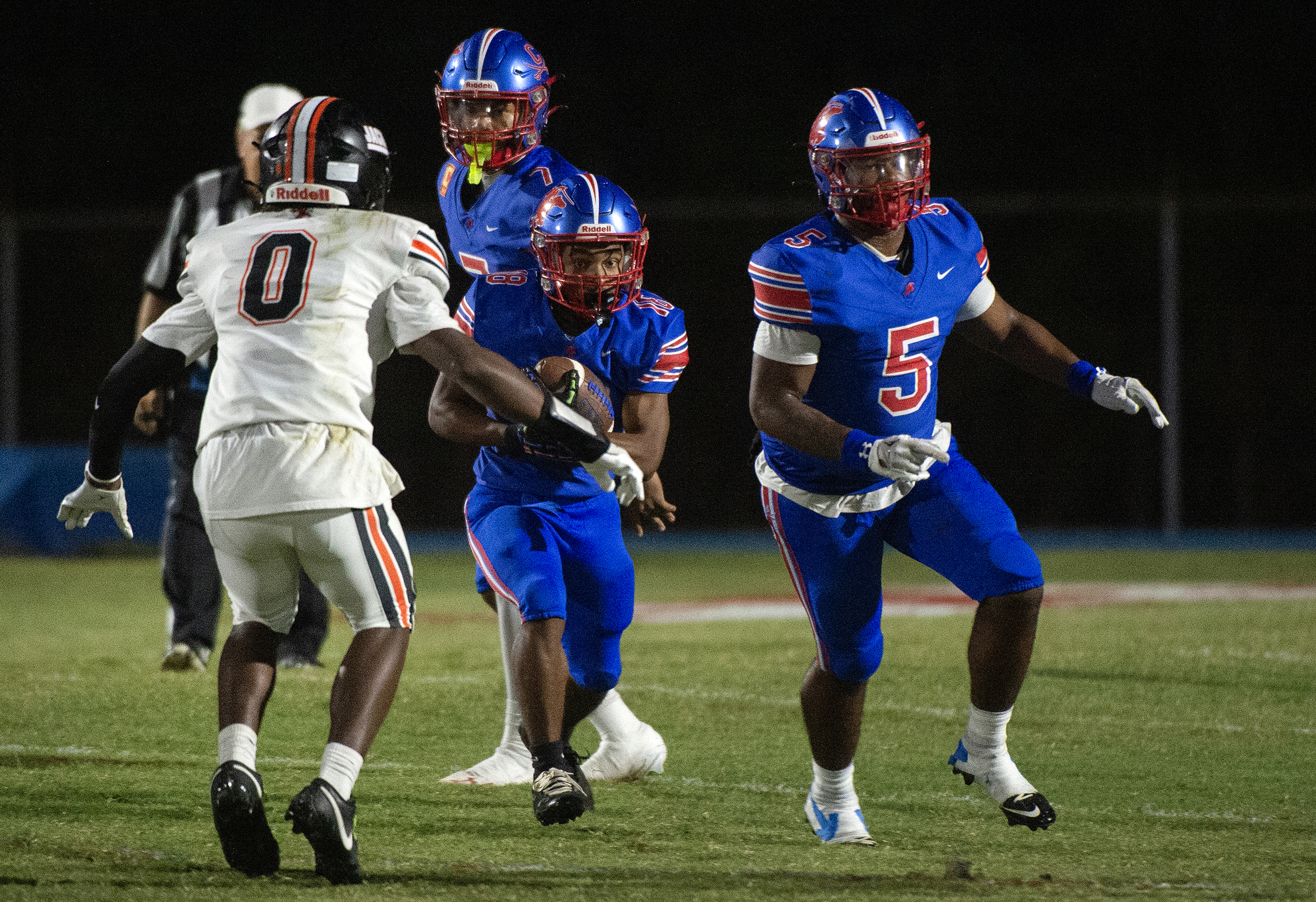 Cavaliers Blake Morris (7), Dre Coleman (18) and Tre Coles (5) move together with precision while keeping Jayem’s Kamrin Kea (0) on his toes as Caroline defeats the Yellow Jackets Friday October 3, 2025. Photo by Jeff Kearney.