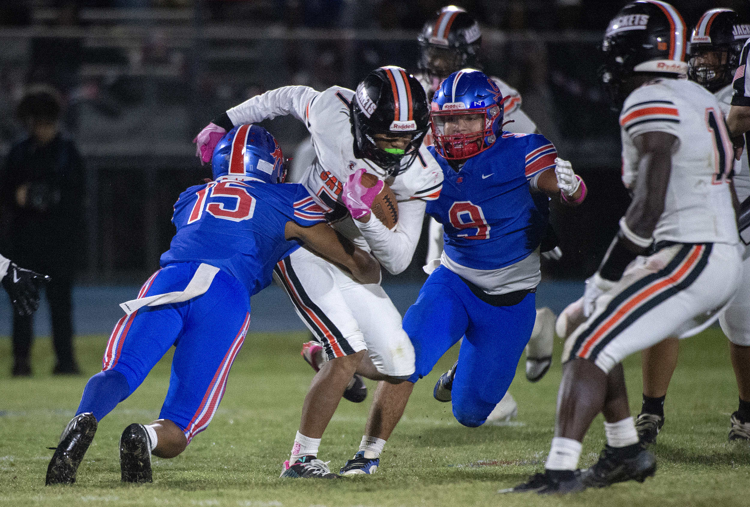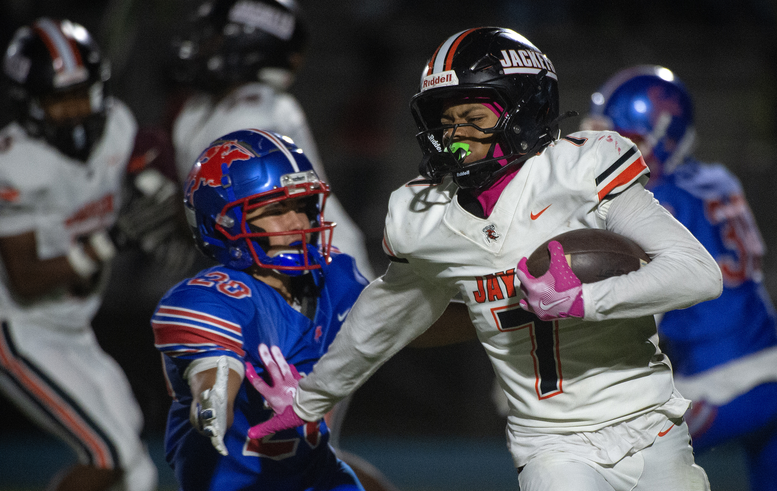 As teammate Jaylin Morgan (1) looks on from below Yellow Jacket Jakhi Hayden (7) tries to turn the corner on Cavalier Blair Morris (4) during Jayem’s 42 – 7 loss to Caroline Friday October 3, 2025. Photo by Jeff Kearney.