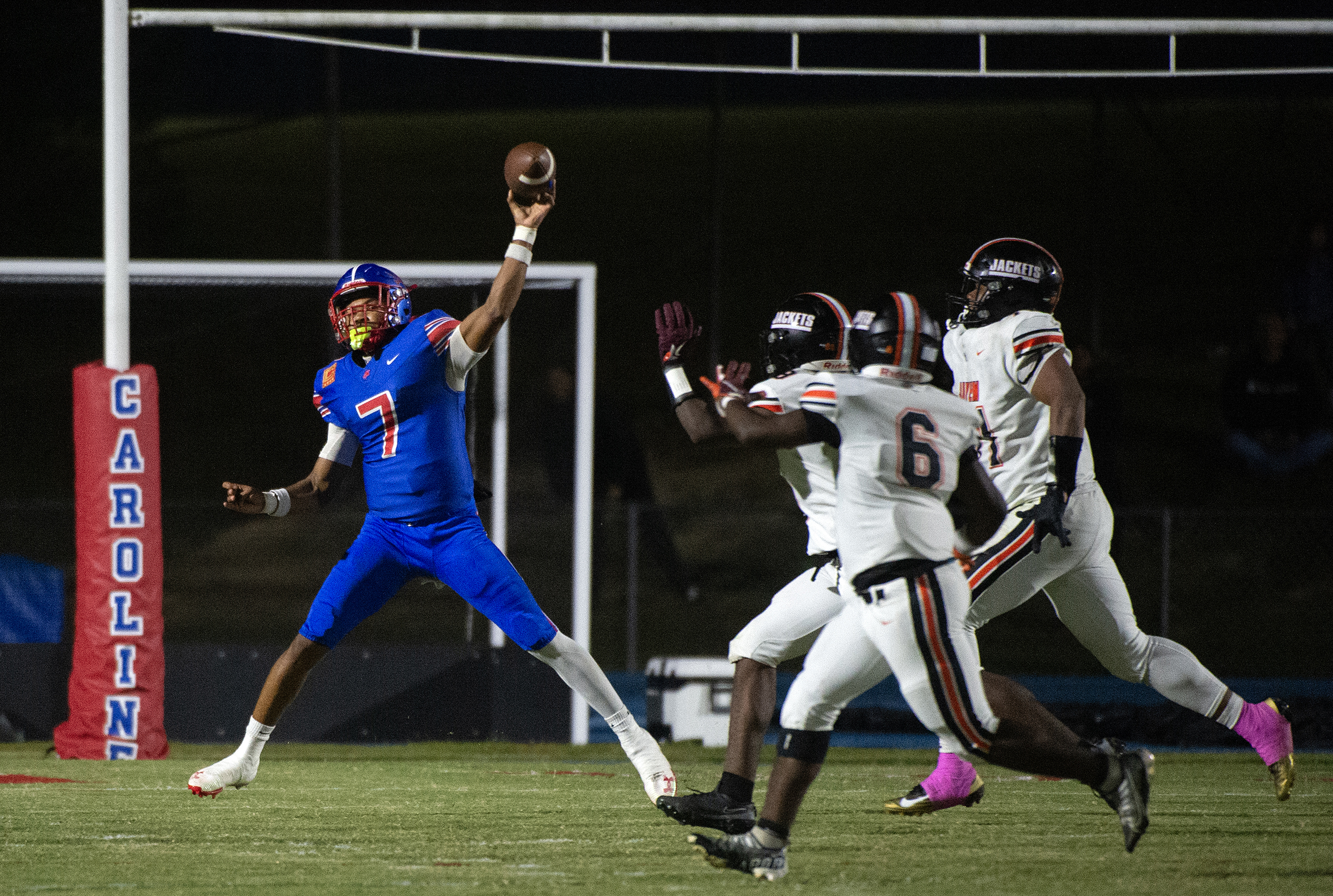 Under pressure from a trio of Yellow Jackets Caroline QB Blake Morris (7) throws on the fly during the Cavaliers 42 – 7 victory over Jayem Friday October 3, 2025. Photo by Jeff Kearney.