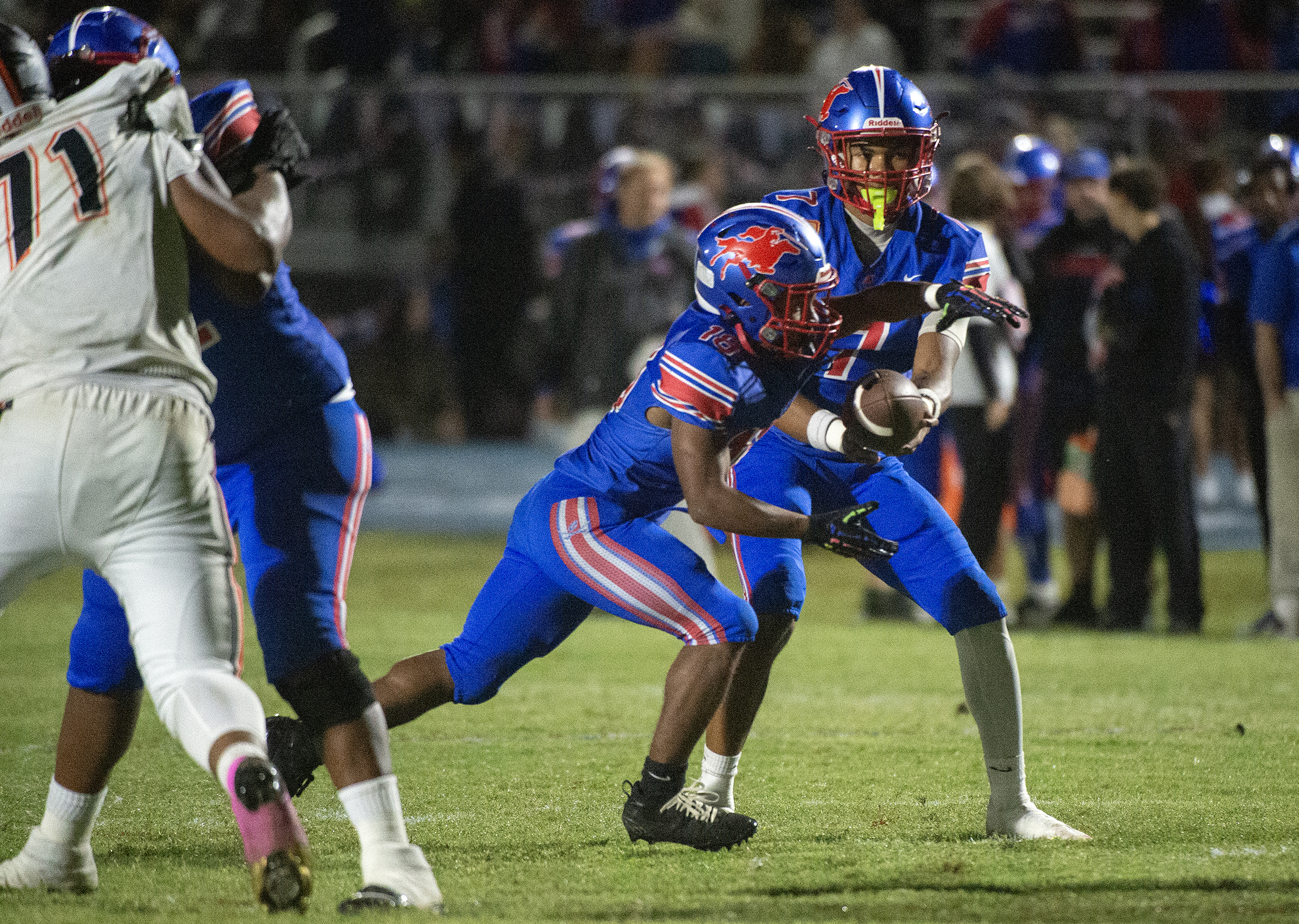 Caroline QB Blake Morris (7) hands the ball off to Dre Coleman (18) who then takes it into the end zone against the Yellow Jackets during the Cavaliers 42 to 7 victory over James Monroe Friday October 3, 2025. Photo by Jeff Kearney.