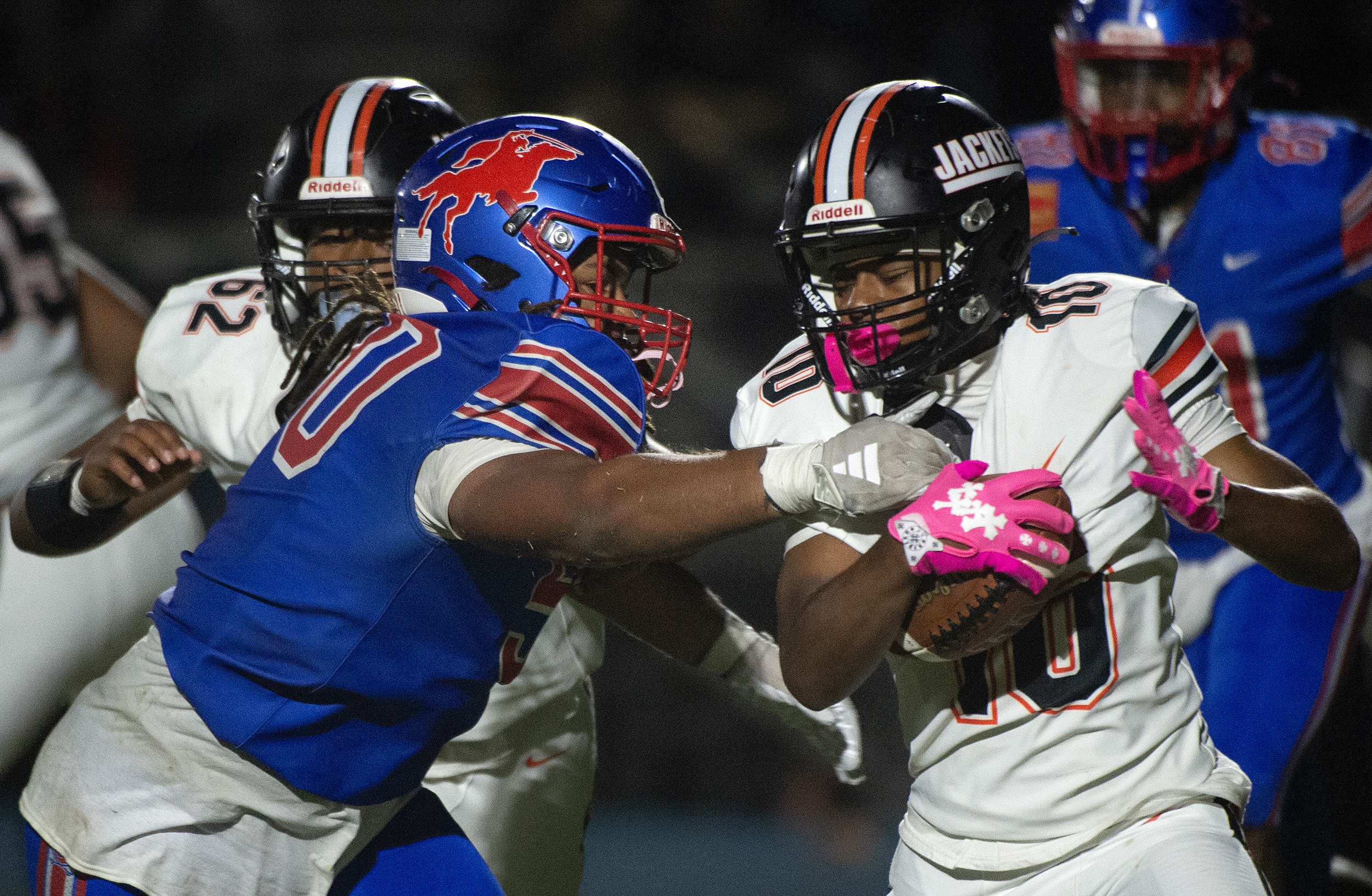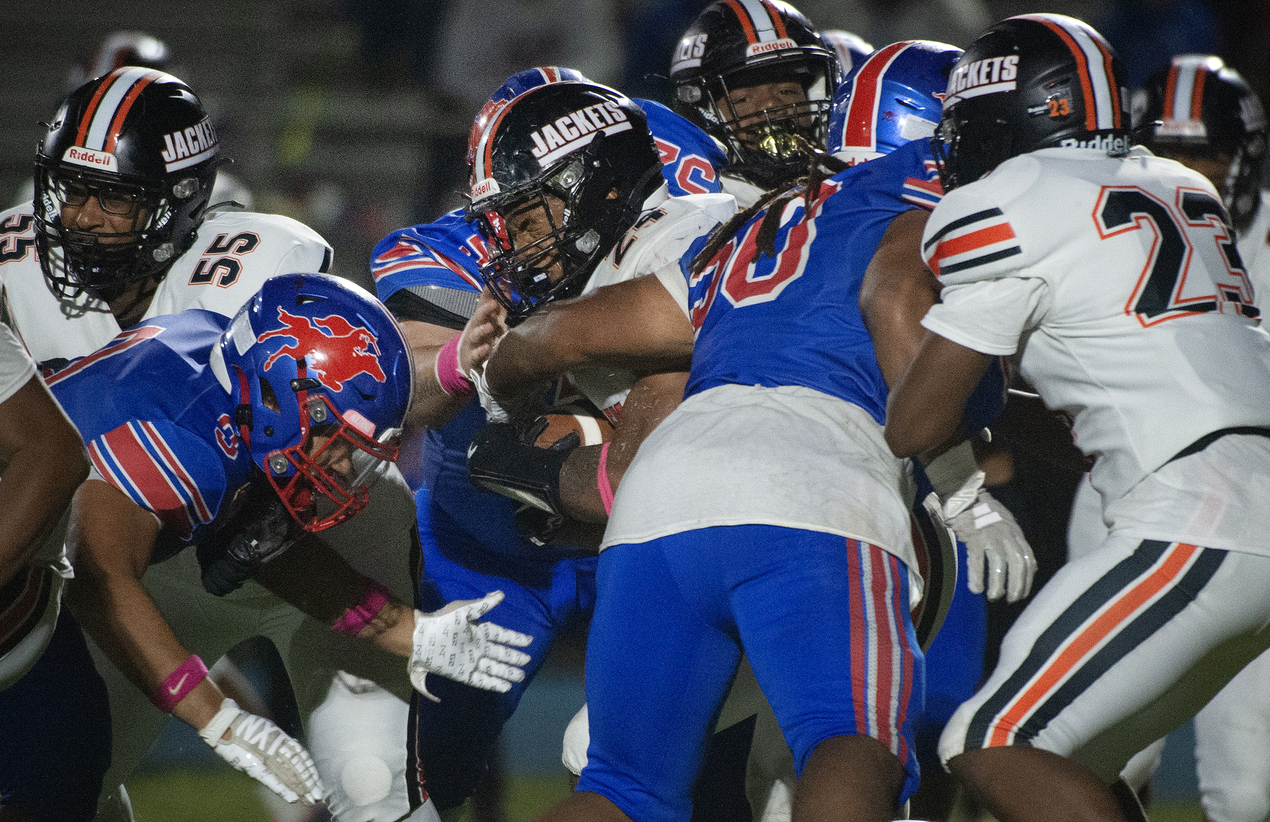 Yellow Jacket Jonathan Lee (24) feels the hole close around him during Jayem’s 43 – 7 loss to the Caroline Cavaliers Friday October 3, 2025. Photo by Jeff Kearney.
