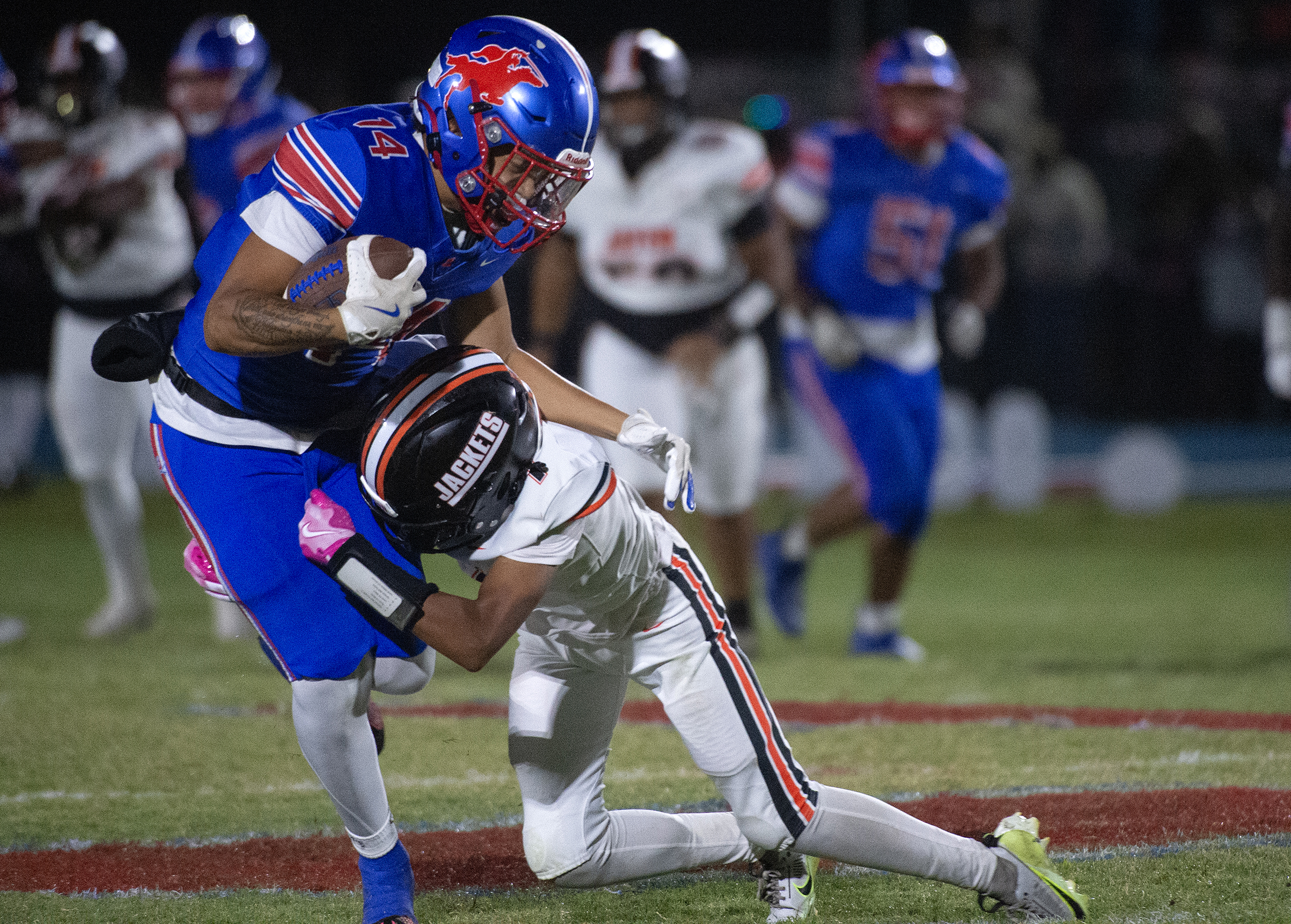 Jayem’s Jaylen Cunningham (10) meets Cavalier Angelo Toure (50) during a run as the Yellow Jackets fall to Caroline Friday October 3, 2025. Photo by Jeff Kearney.