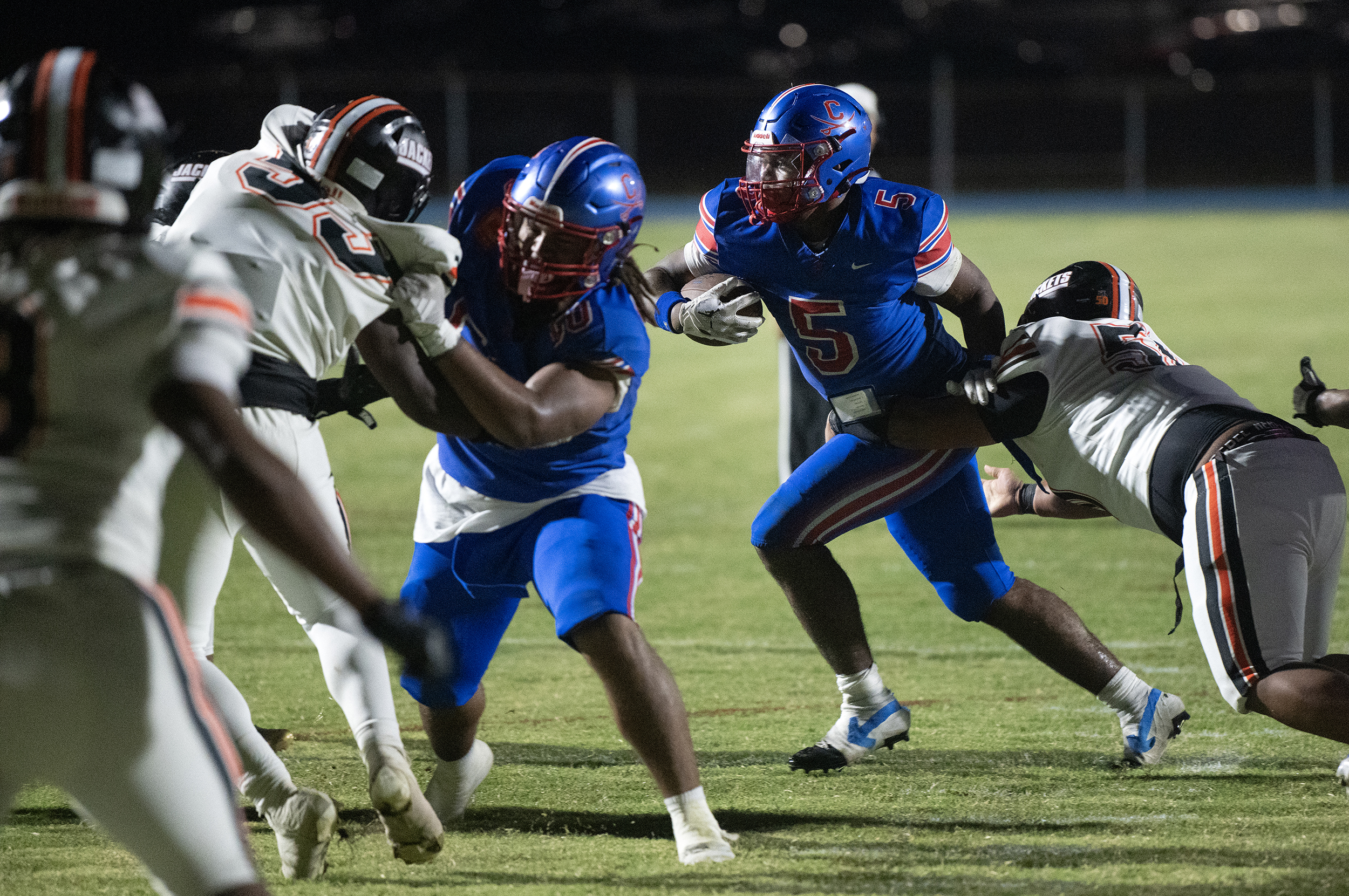 Keeping himself steady Cavalier Tre Coles (5) continues forward against the Yellow Jackets during Caroline’s win against Jayem Friday October 3, 2025. Photo by Jeff Kearney.