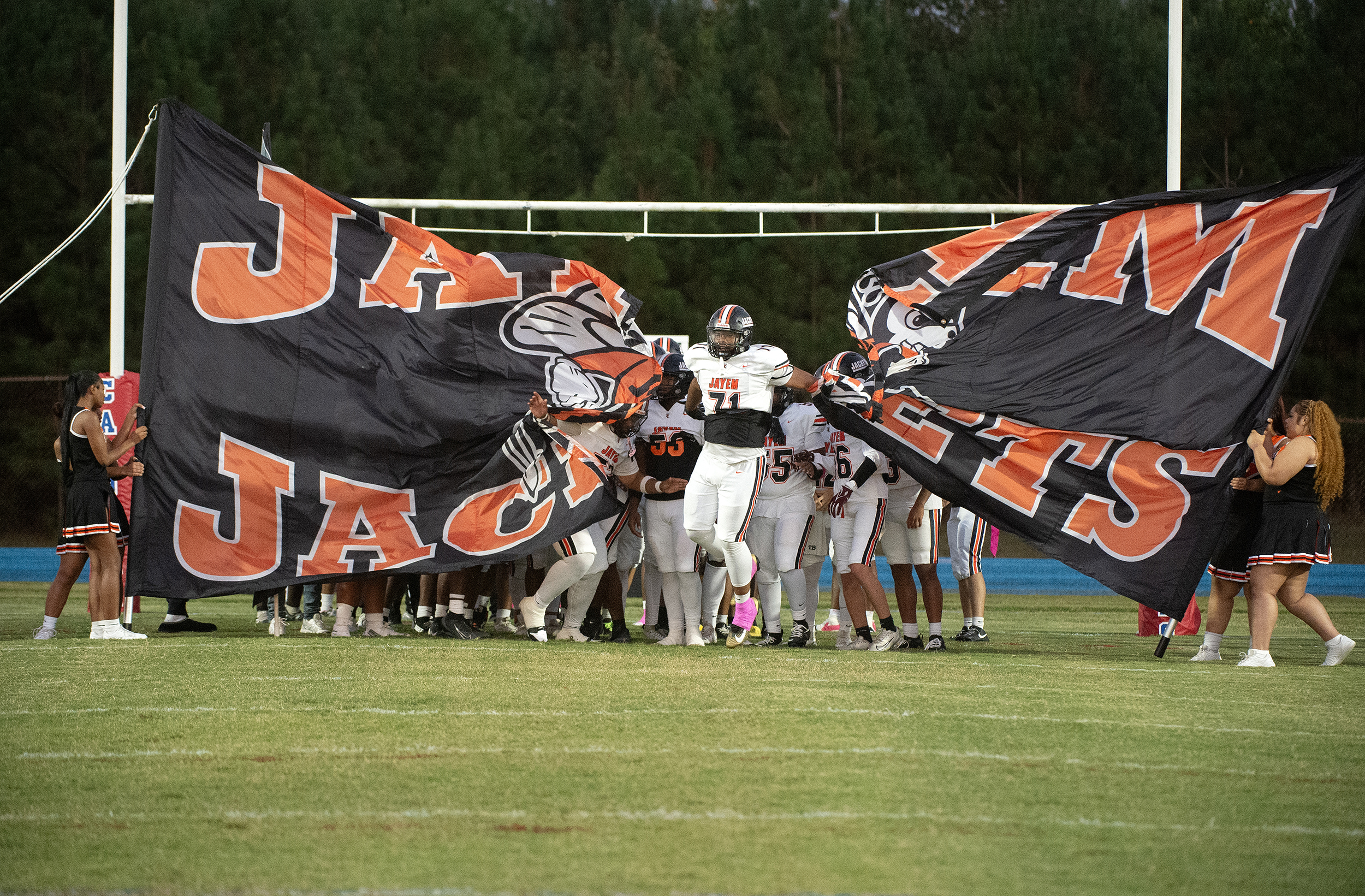 The Jayem Yellow Jackets break through their banner to enter the field agains the Caroline Cavaliers Friday October 3, 2025. Photo by Jeff Kearney.
