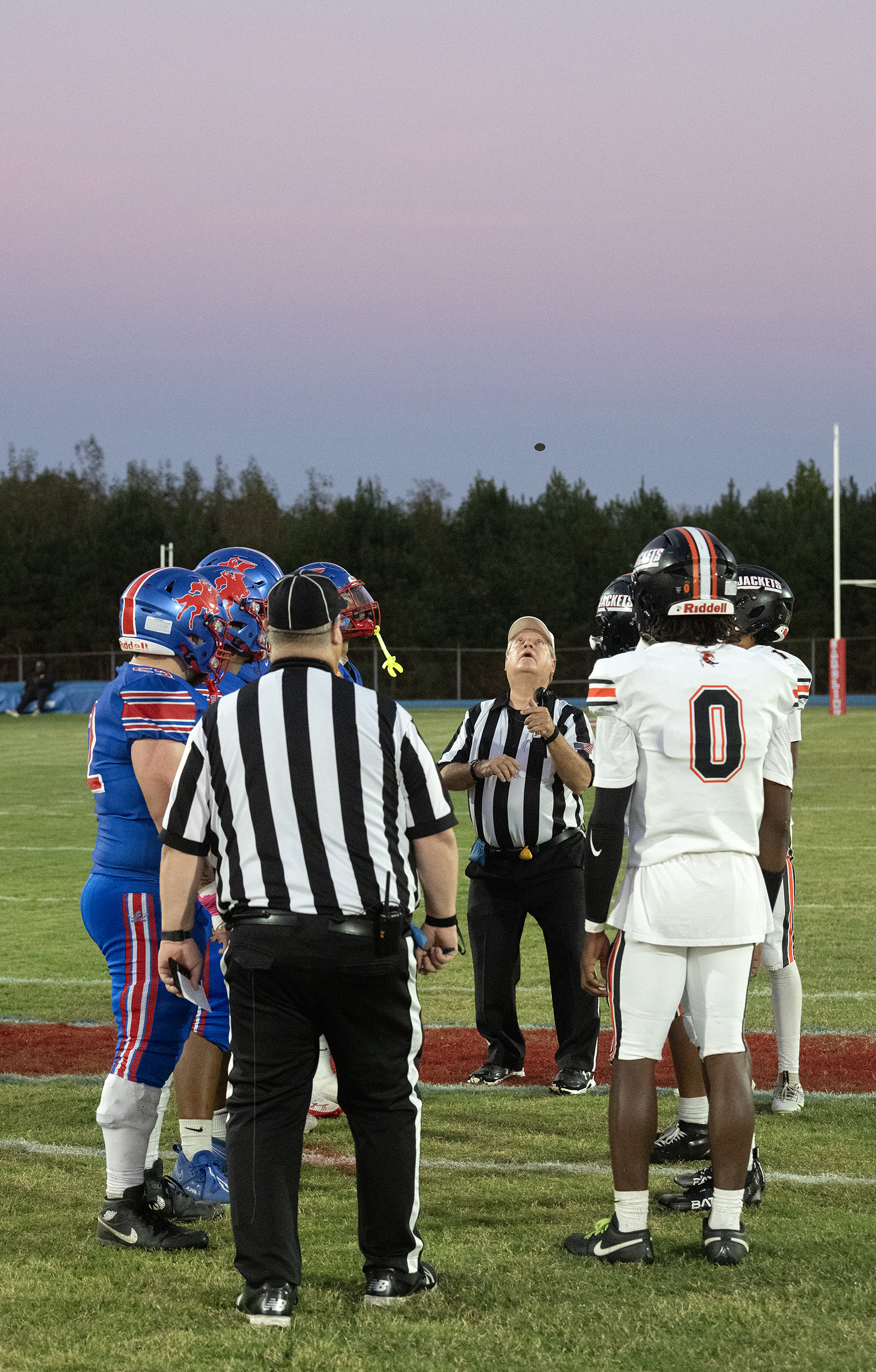 Captains for both the James Monroe Yellow Jackets and the Caroline Cavaliers meet at midfield for the coin toss Friday October 3, 2025. Photo by Jeff Kearney.