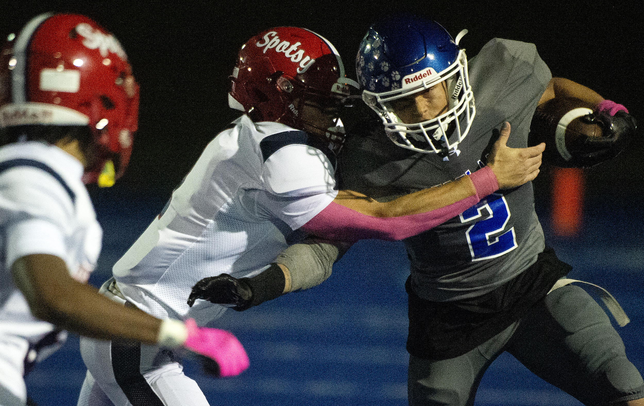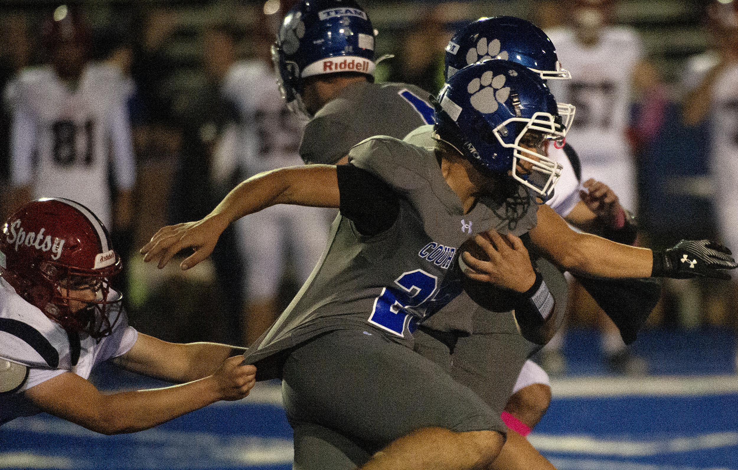 It’s not only Cougars that Spotsy’s Braylon Puller (7) has to avoid on the field Friday October 10, 2025. Photo by Jeff Kearney.
