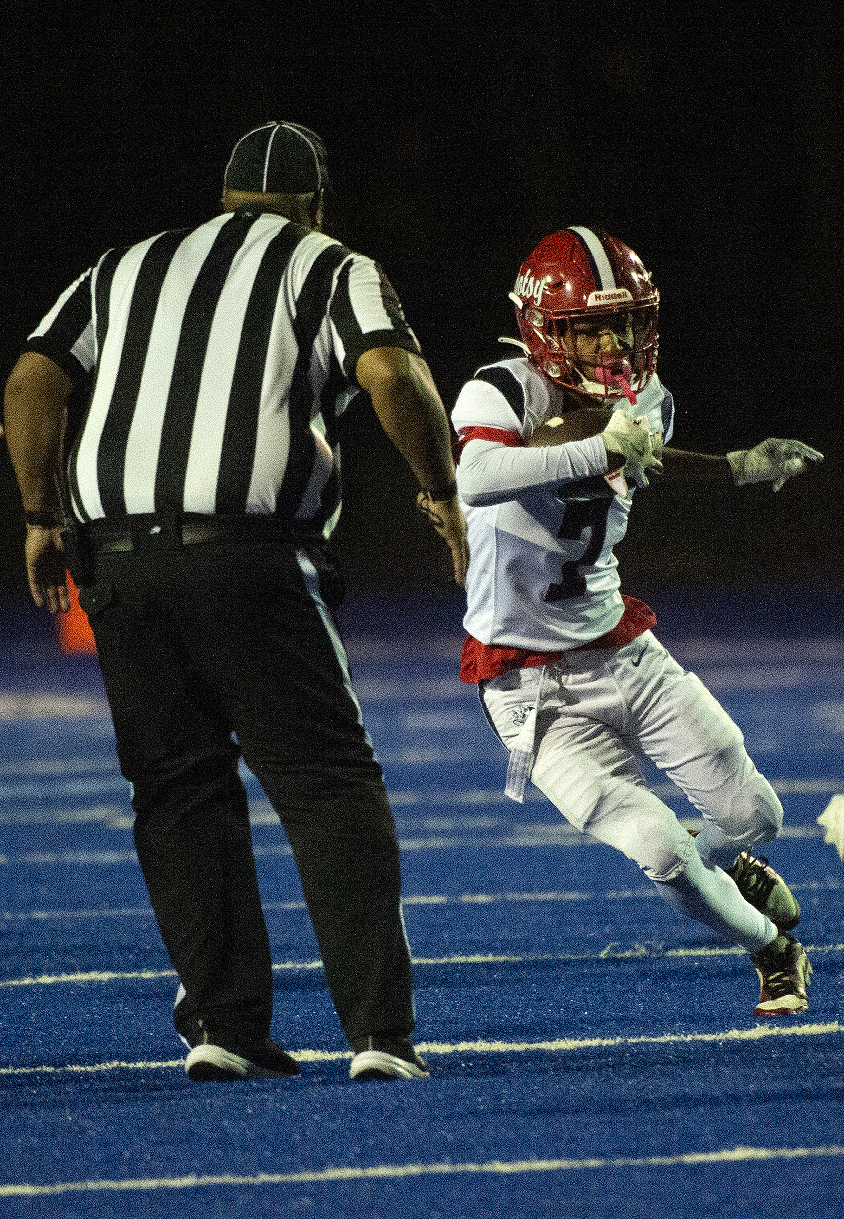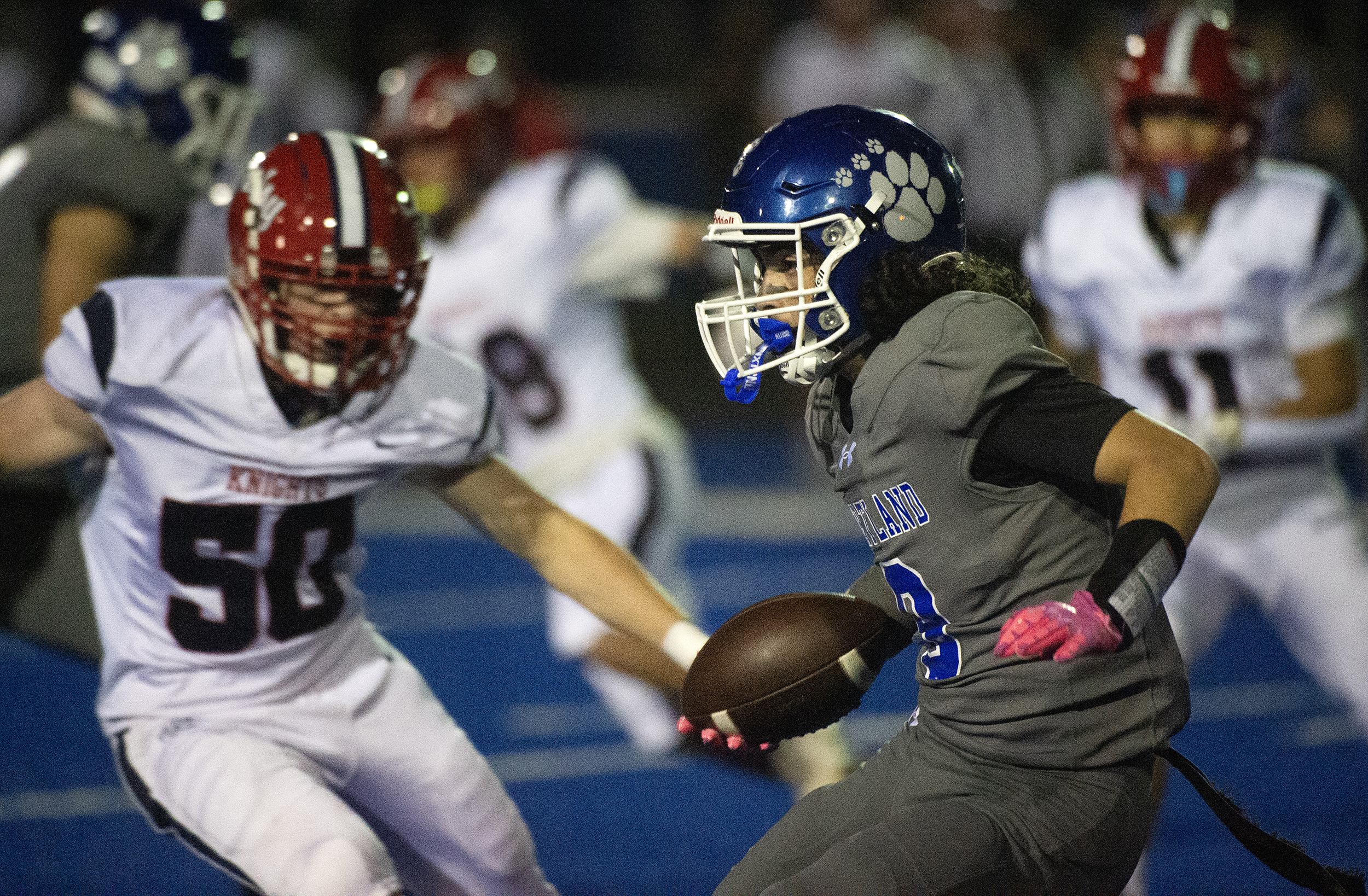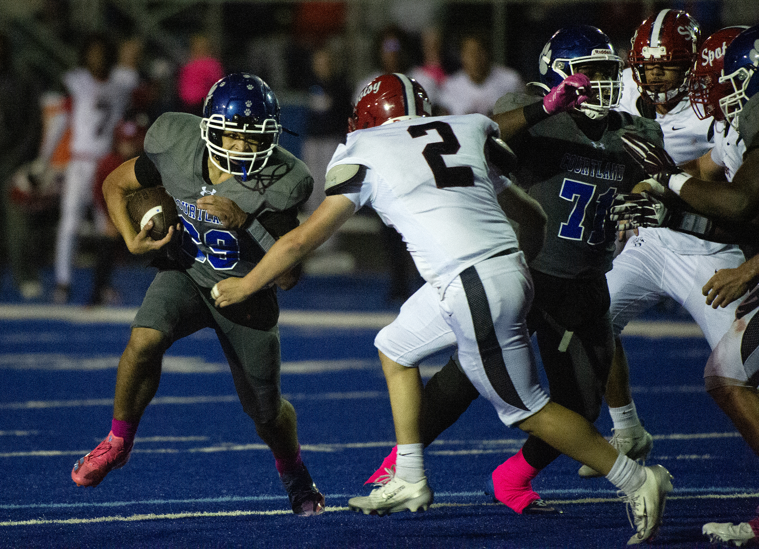 Courtland’s Tyrik Newman (29) keeps the Knights defense at arms length as the Cougars defeat Spotsy Friday October 10, 2025. Photo by Jeff Kearney.
