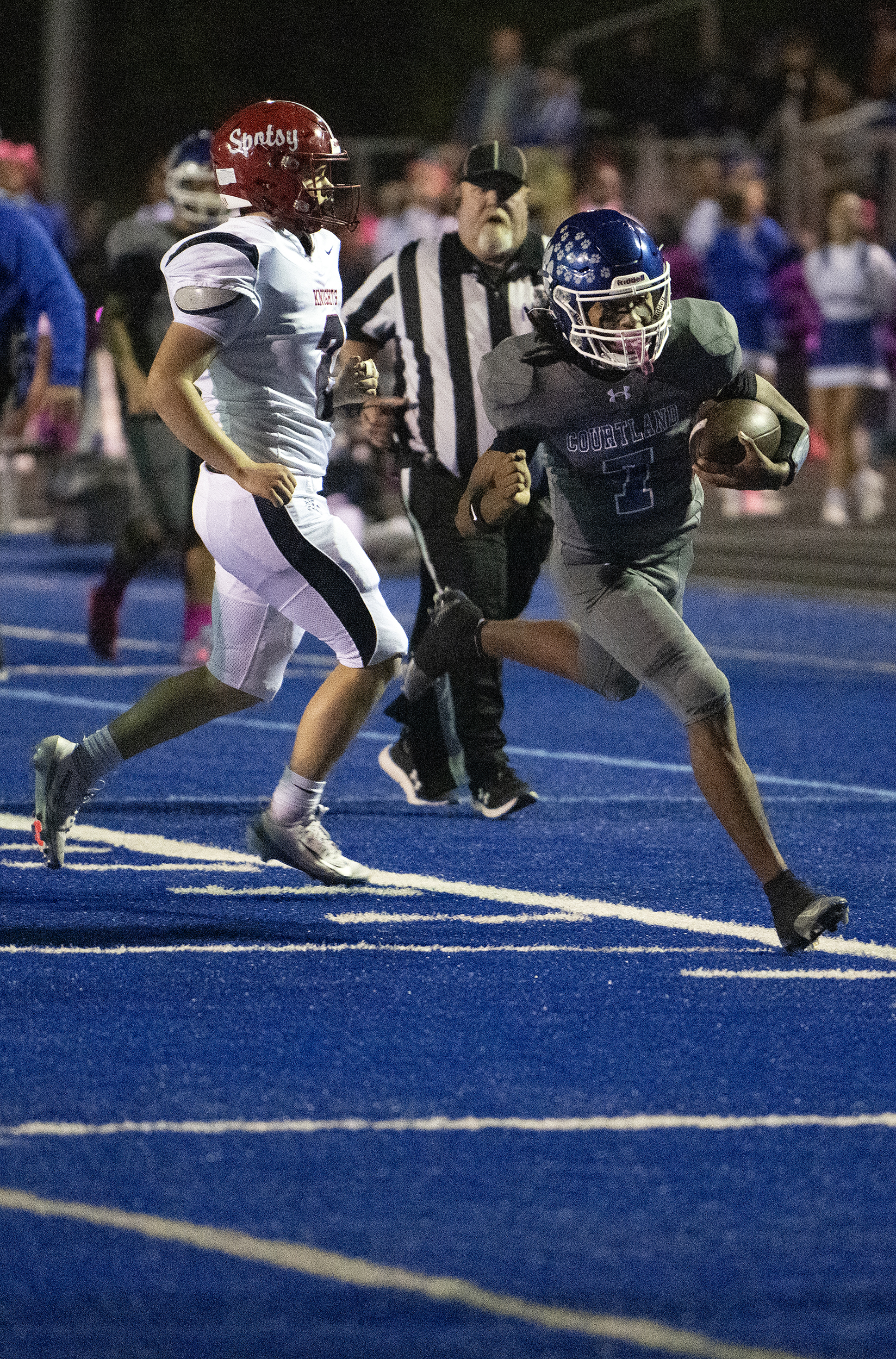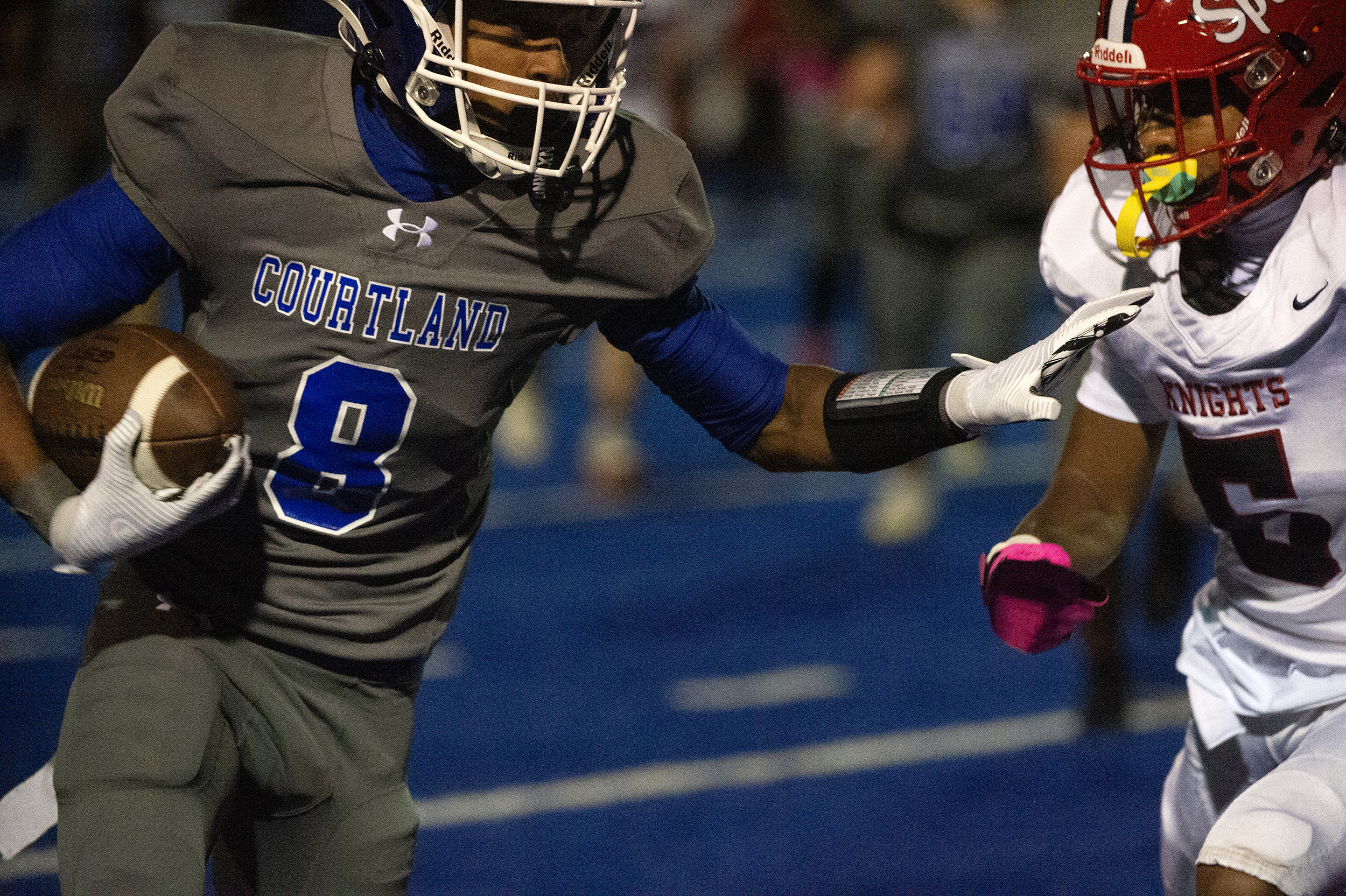 Courtland’s Ahmari Boxley (8) keeps a defensive Knight at arms distance as the Cougars are victorious over Spotsy 21 – 19 Friday October 10, 2025. Photo by Jeff Kearney.