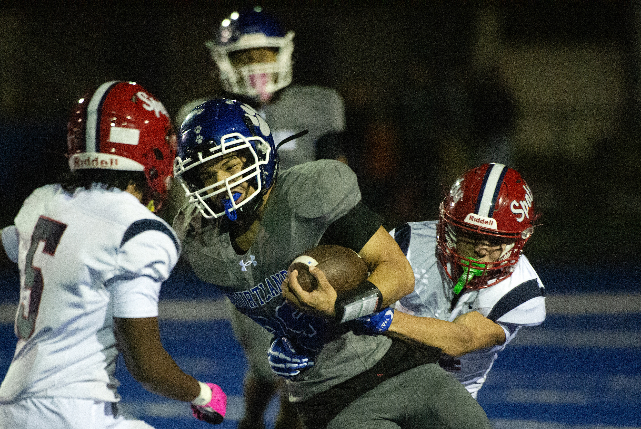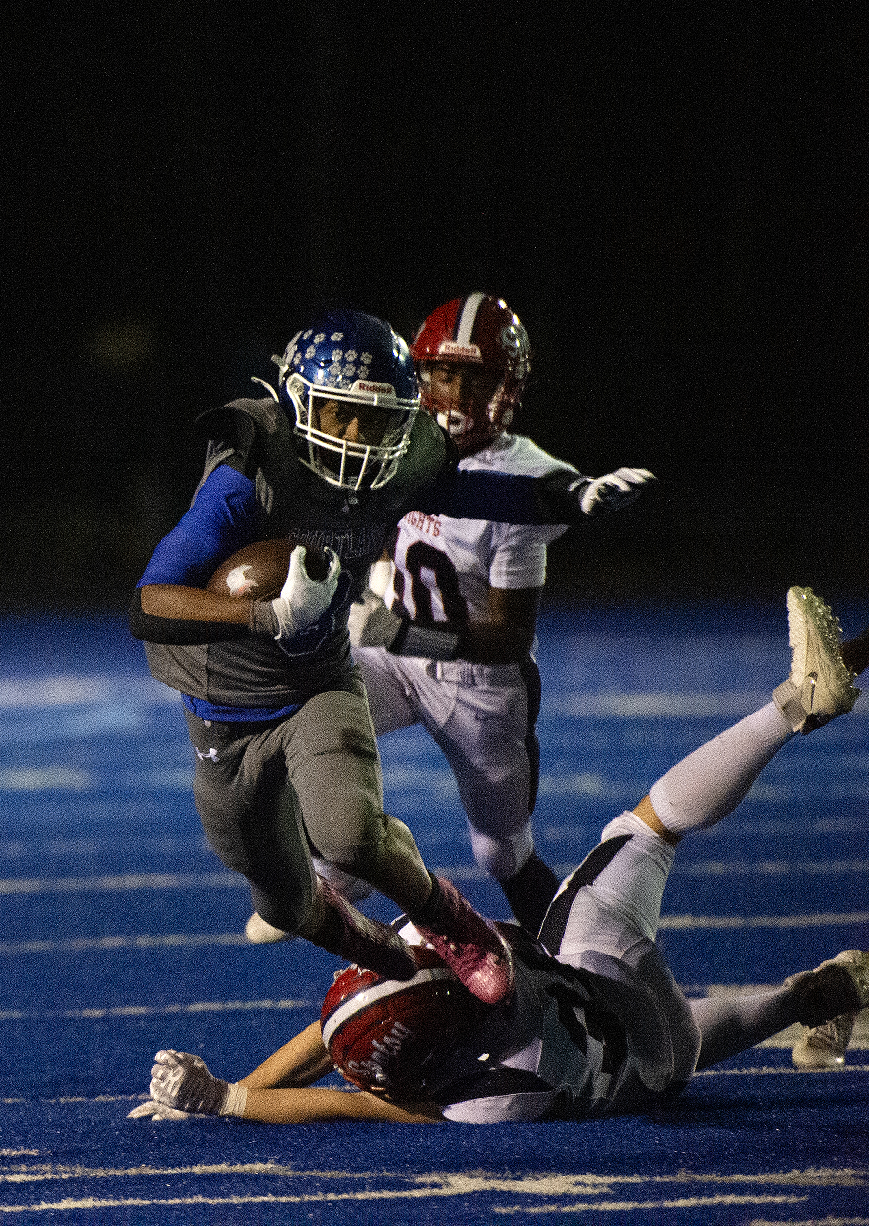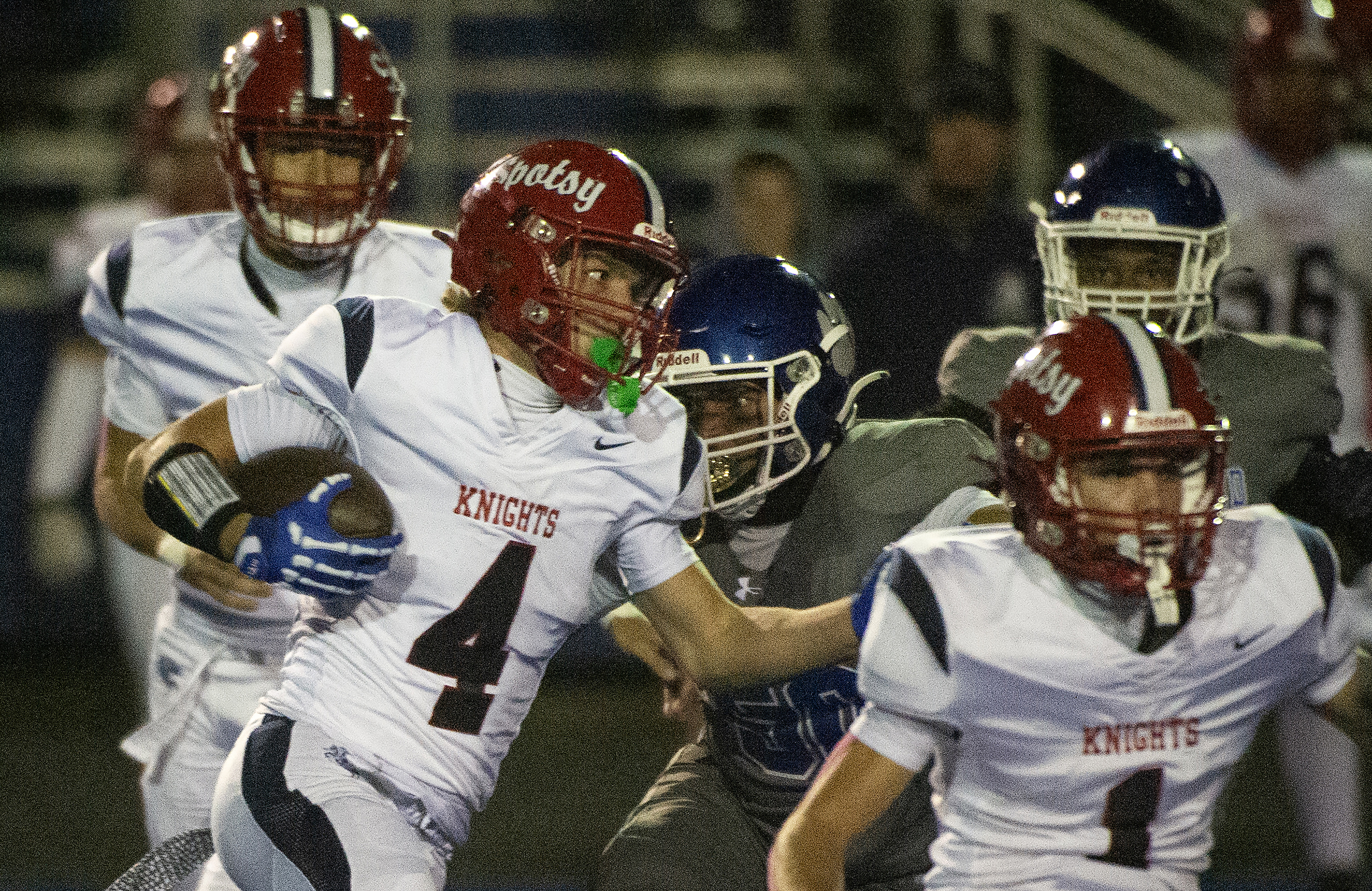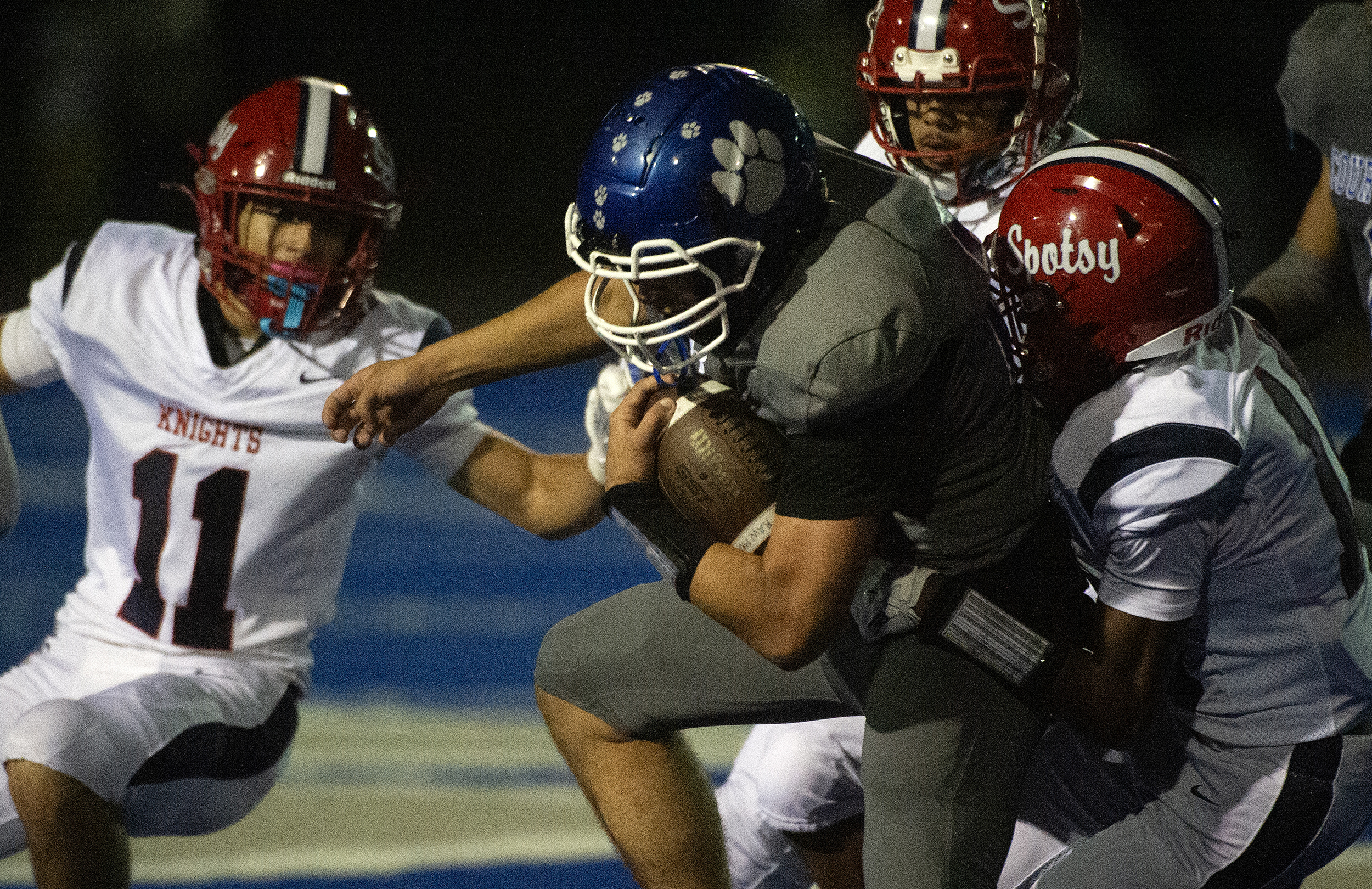Flanked by teammates, Spotsylvania’s Hudson Callahan (4) looks for an opening against the Courtland defensive during the Knights 21 – 19 loss to the Cougars Friday October 10, 2025. Photo by Jeff Kearney.