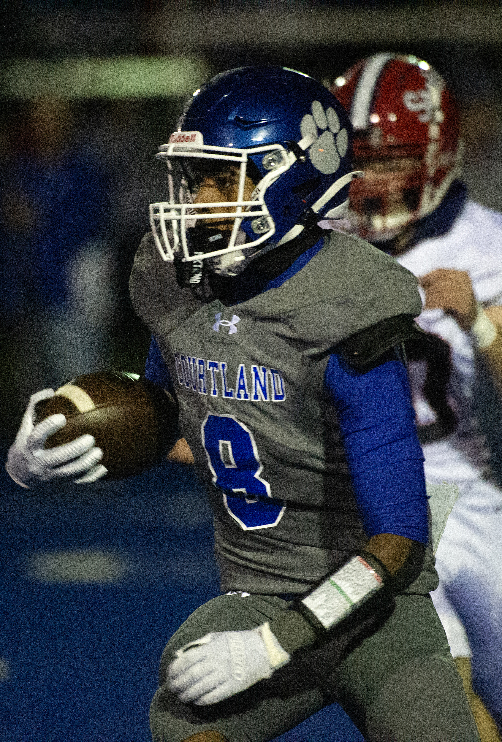 Ahmari Boxley (8) makes the most of his ball possession with a long yardage gain for the Cougars against the Knights as Courtland defeats Spotsy Friday October 10, 2025. Photo by Jeff Kearney.