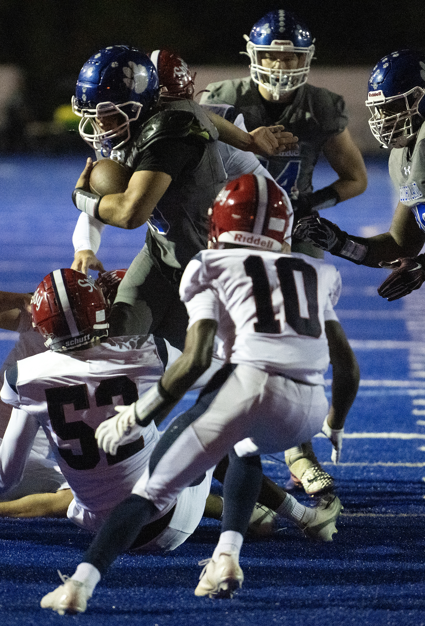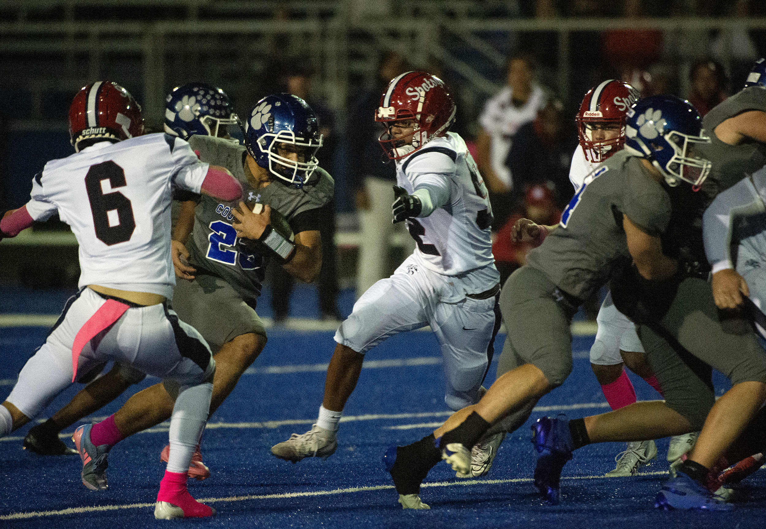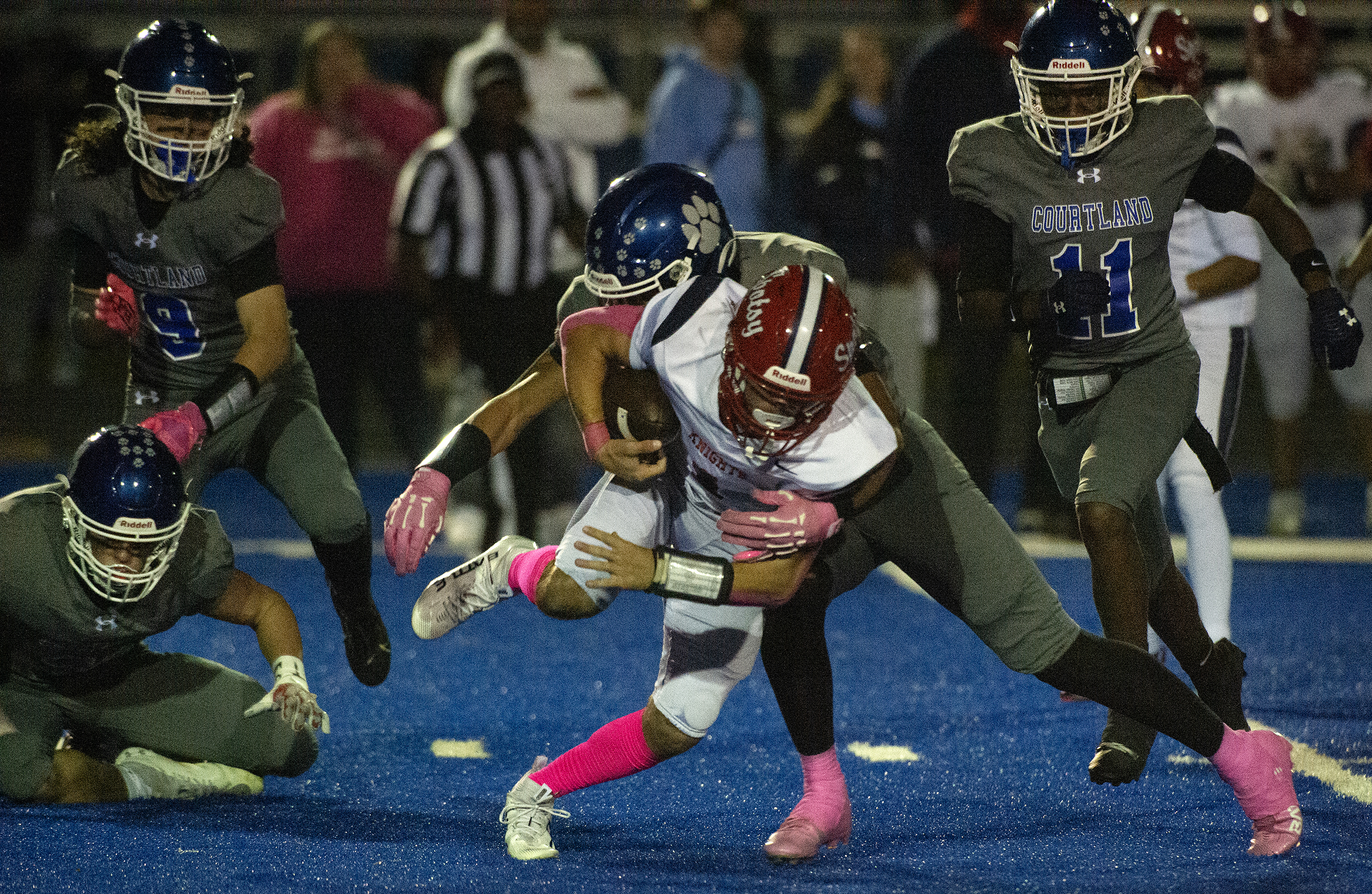As players swirl around him, Courtland’s Tyrik Newman (29) is only focused on forward momentum against the Knights as the Cougars go on to defeat Spotsy 21 to 19 Friday October 10, 2025. Photo by Jeff Kearney.