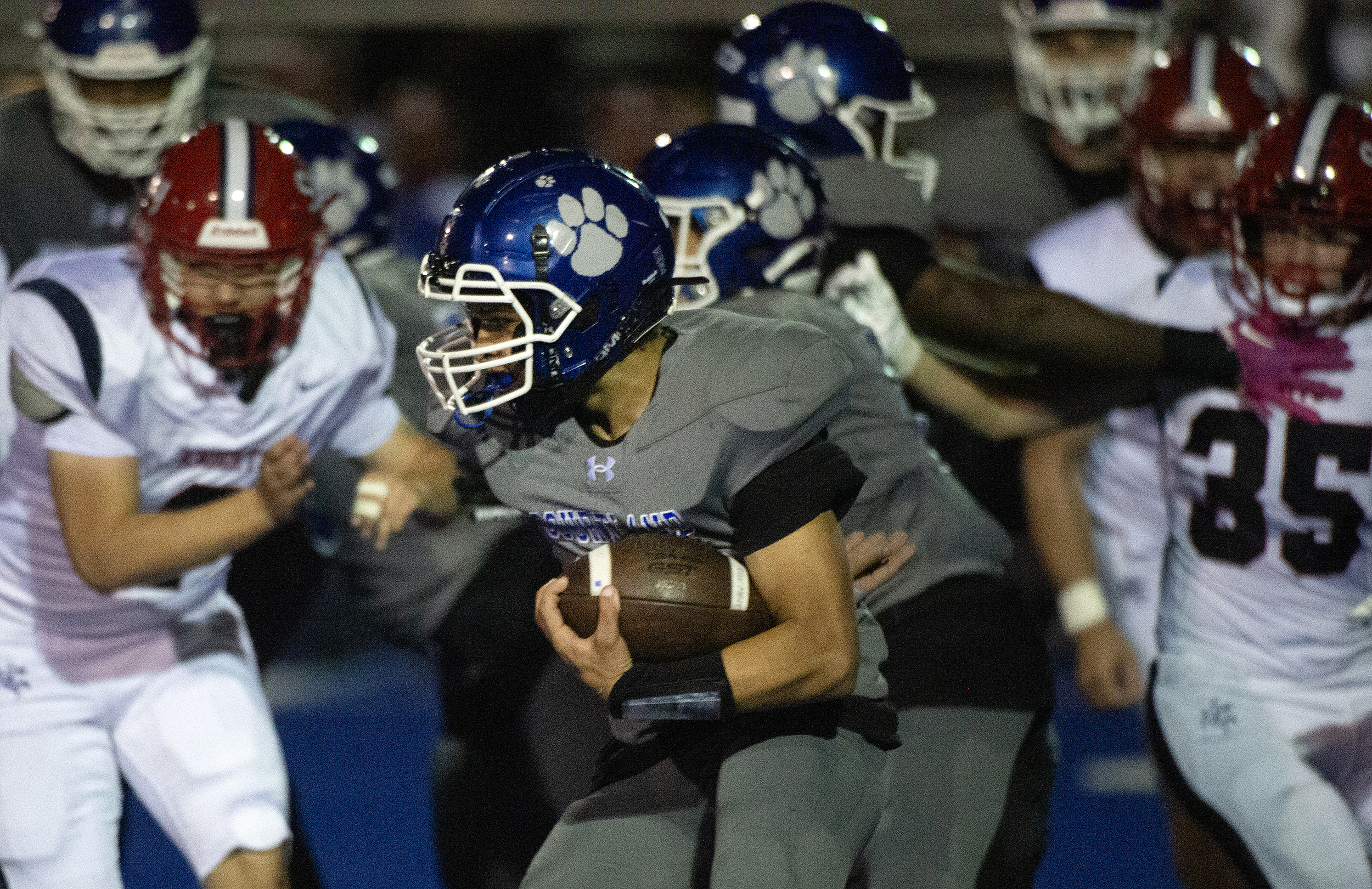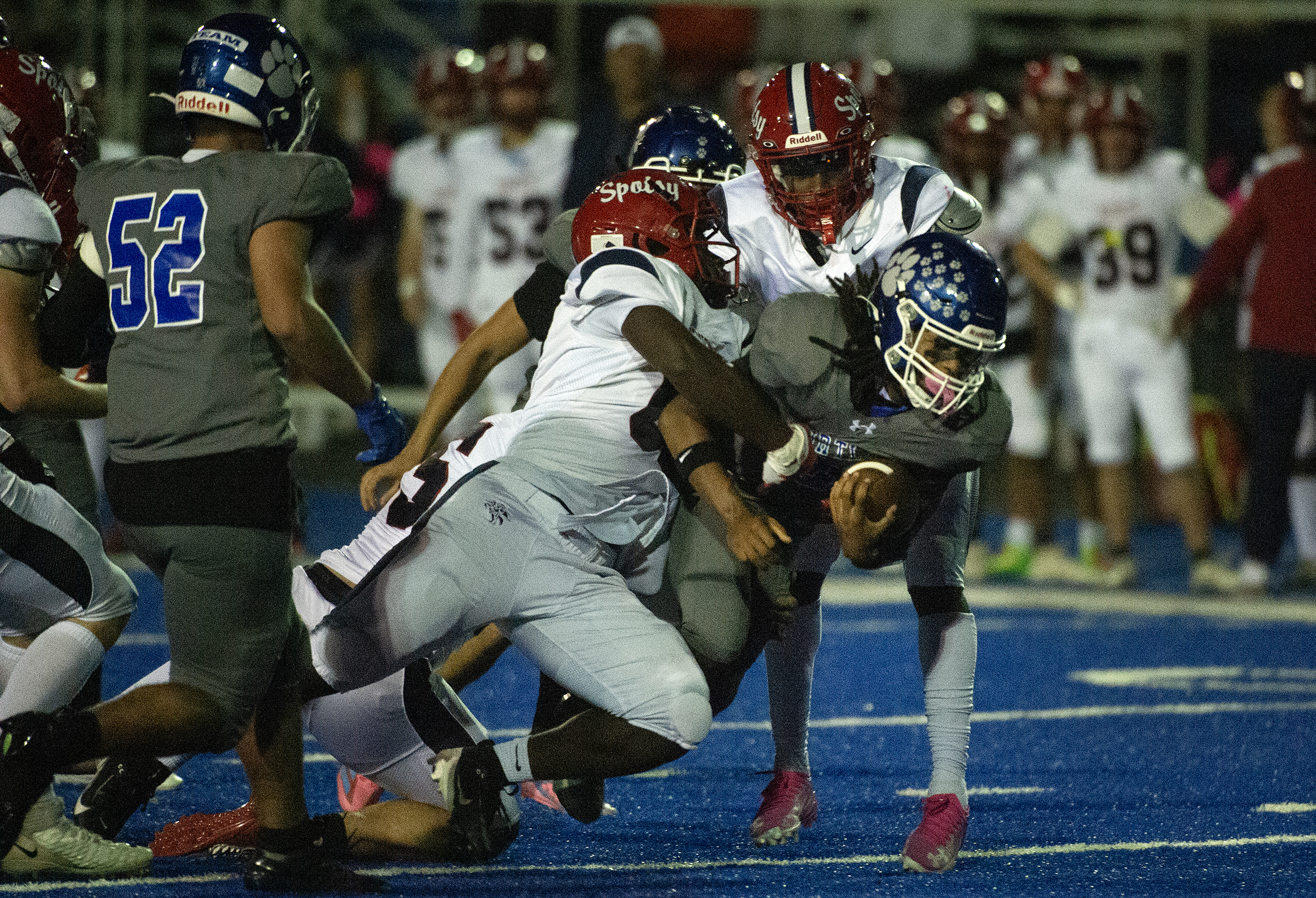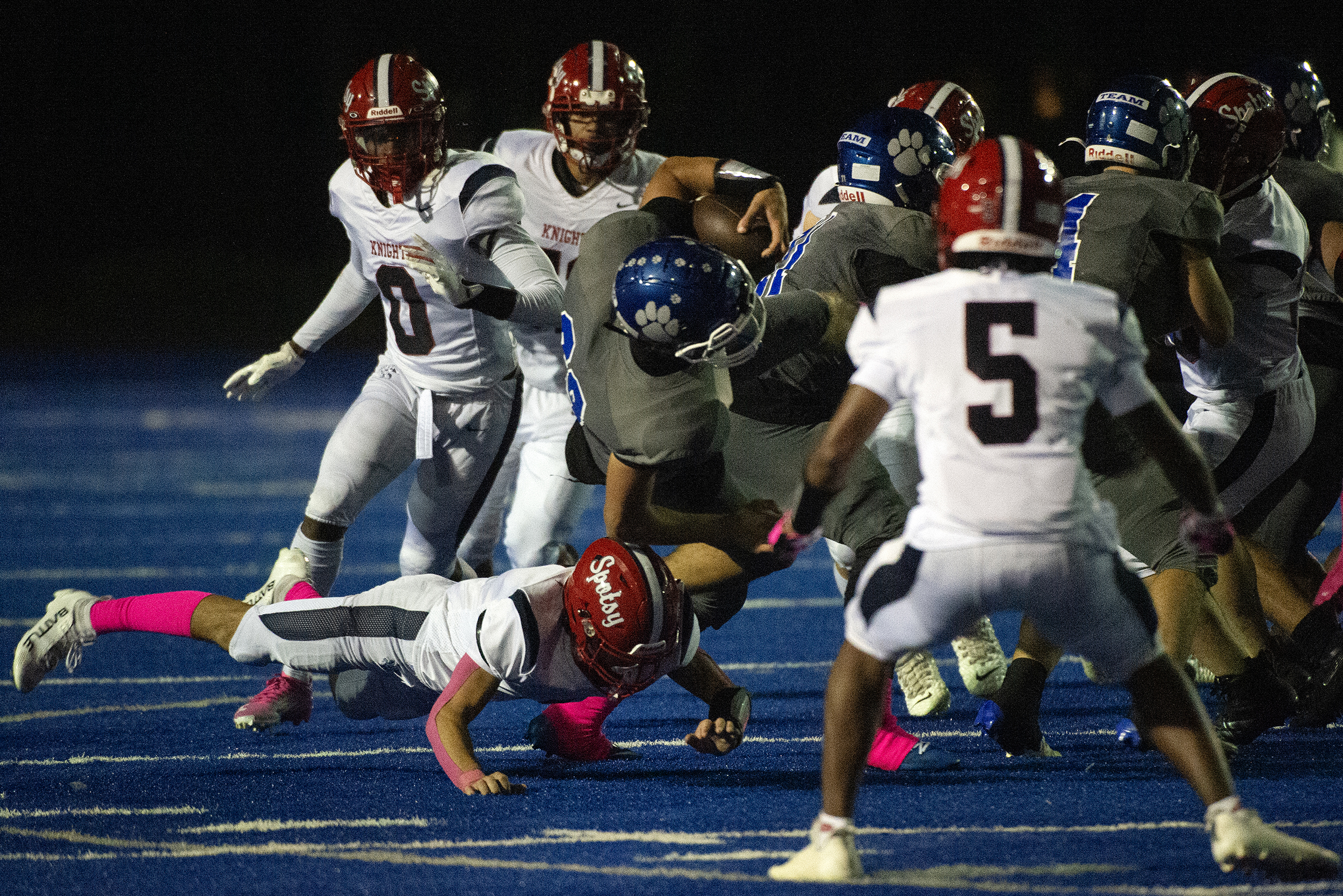 As players swirl around him, Courtland’s Tyrik Newman (29) is only focused on forward momentum against the Knights as the Cougars go on to defeat Spotsy 21 to 19 Friday October 10, 2025. Photo by Jeff Kearney.