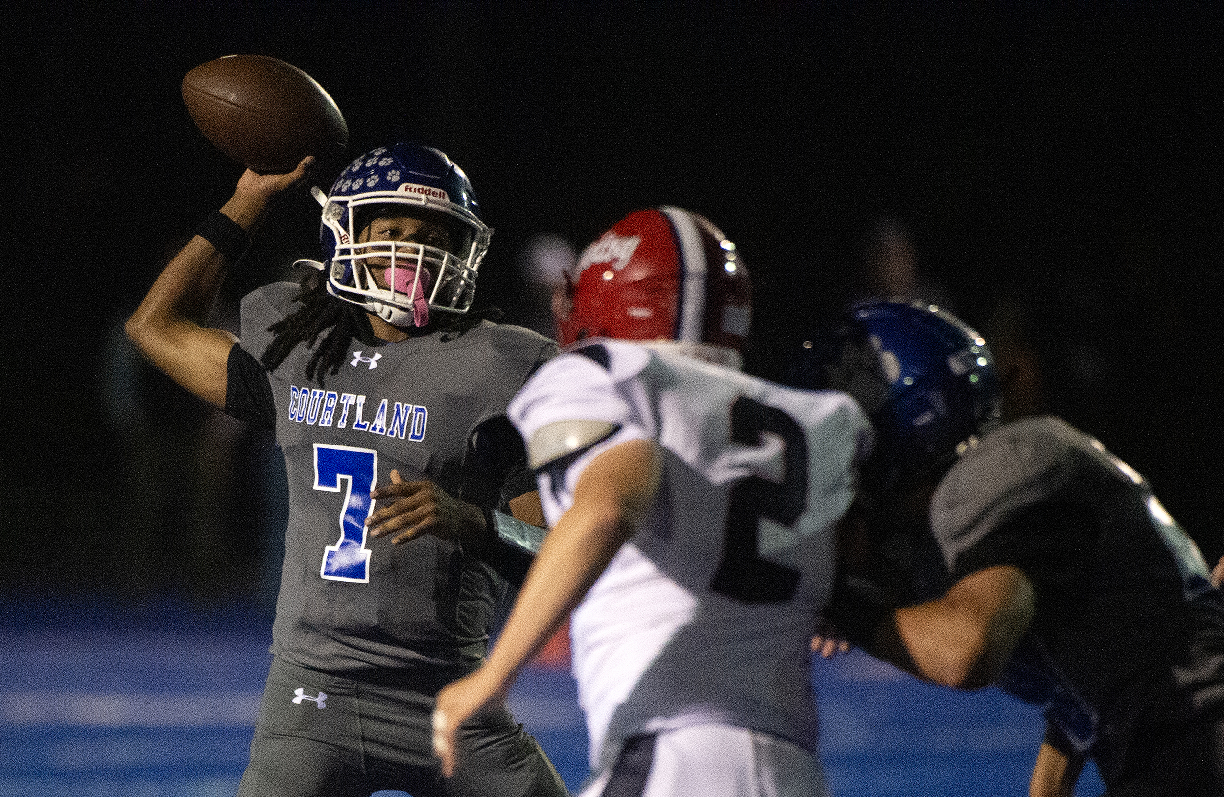 Cougar QB Chieftain Watson (7) stays calm as he prepares to release the ball under Spotsylvania defensive pressure as Courtland goes on to defeat the Knights Friday October 10, 2025. Photo by Jeff Kearney.