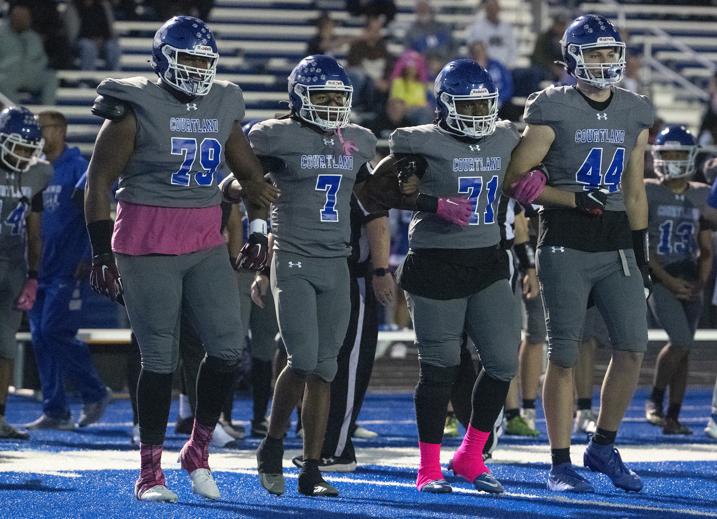 Courtland’s Jaiden Edwards (79) Chieftain Watson (7) Emmanuel Smith (71) Keegan Parker (44) walk towards midfield for the coin toss before the start of the game against Spotsylvania Friday October 10, 2025. Photo by Jeff Kearney.