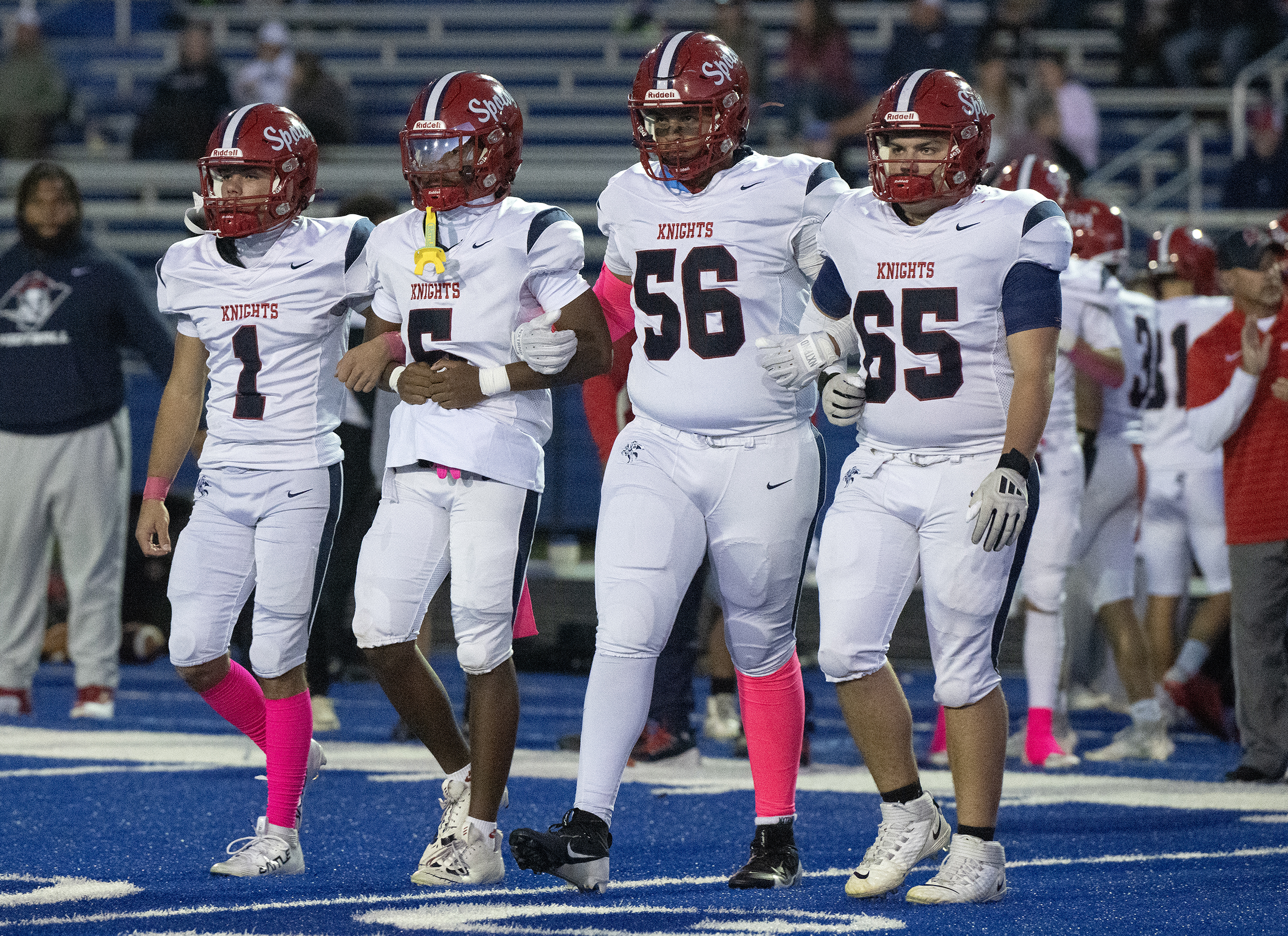 Spotsylvania’s Colton Jones (1) Jaiden Young (5) Ace Walcott (56) Matthew Nutter (65) walk towards midfield for the coin toss before the start of the game against Courtland Friday October 10, 2025. Photo by Jeff Kearney.