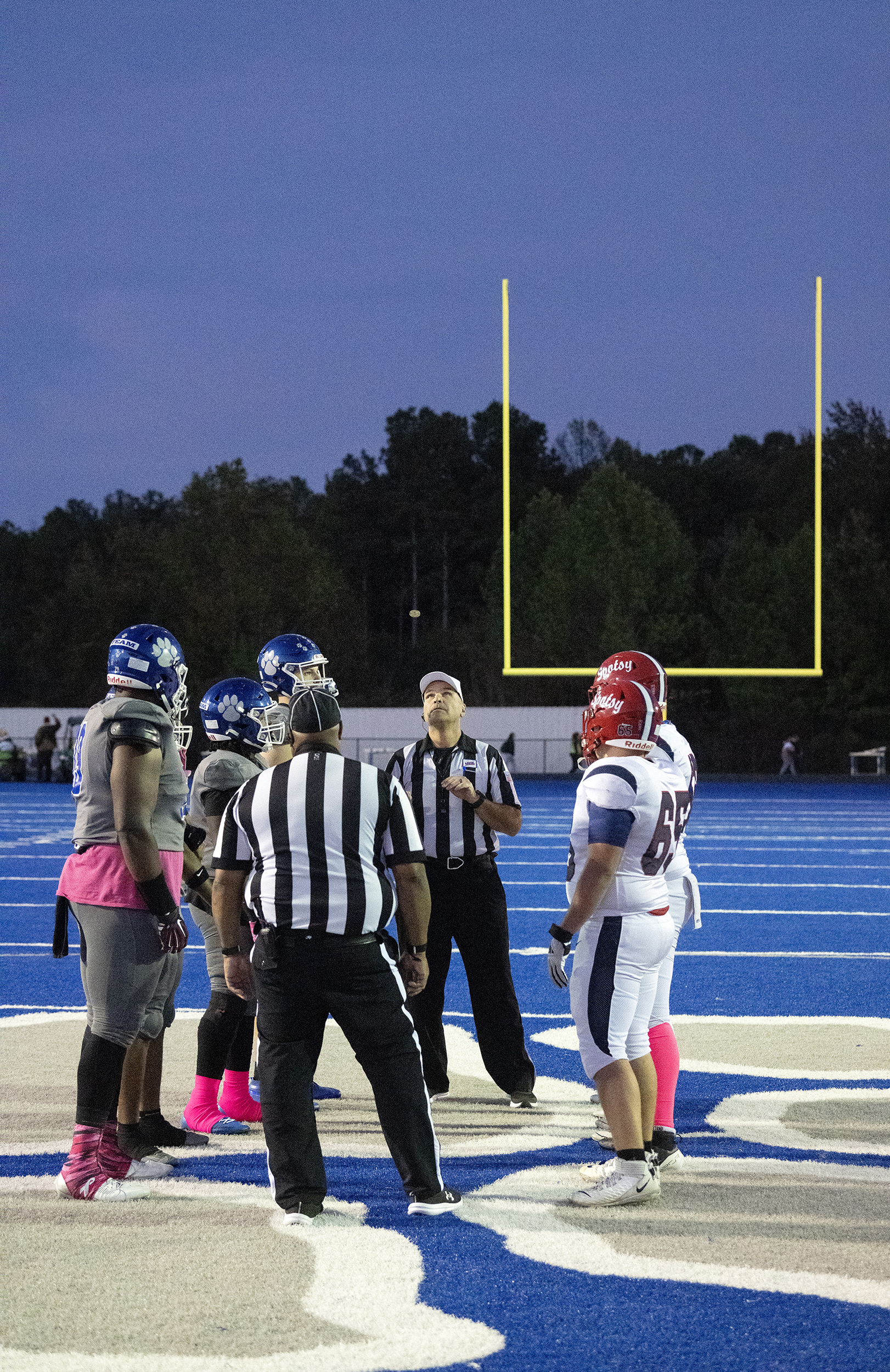 Players from the Courtland Cougars and Spotsylvania Knights meet at midfield for the coin toss before the start of their game Friday October 10, 2025. Photo by Jeff Kearney.