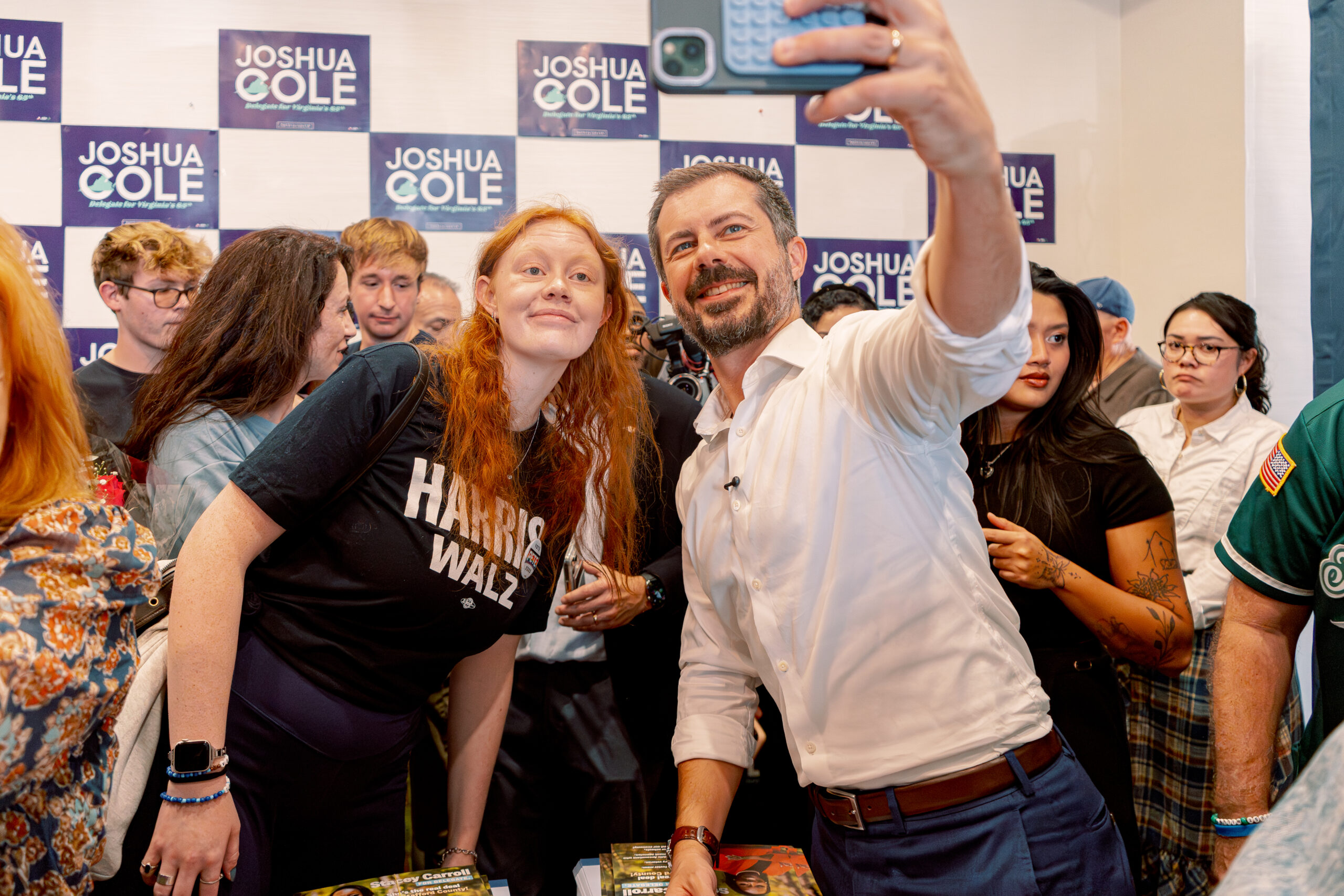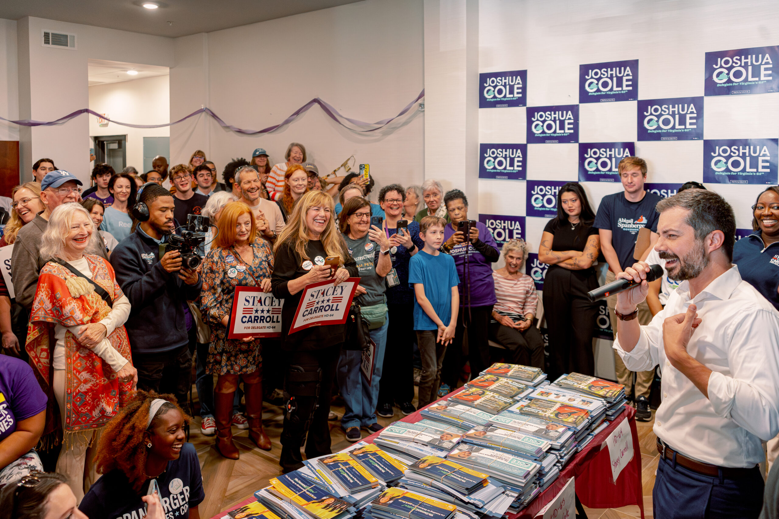 Former U.S. Transportation Secretary Pete Buttigieg came to Del. Joshua Cole’s office to root on volunteers for Cole, Spotsylvania School Board member Nicole Cole and Stacey Carroll, all Democratic nominees for the Virginia House of Delegates. Nicole Cole faces veteran Del. Bobby Orrock, a Republican, and Carroll, GOP Del. Paul Milde.