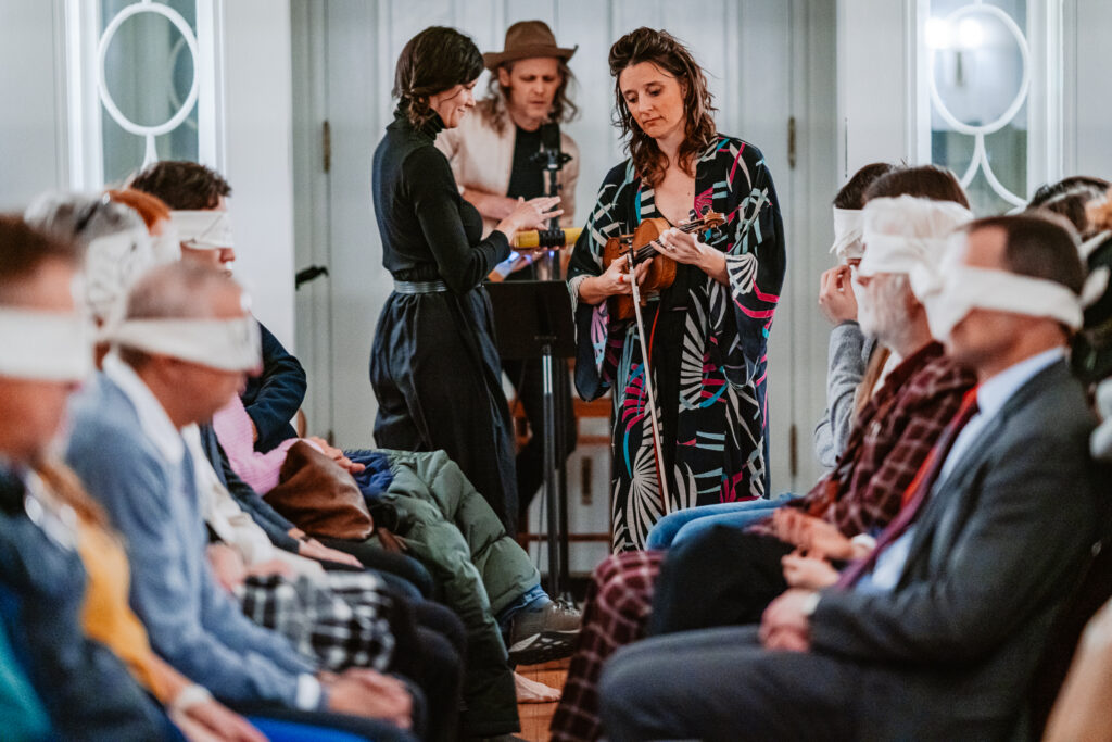 Wife and husband duos David Wax and Suz Slezak of David Wax Museum and Daniel and Lauren Goans of Lowland Hum will present Golden Hour at Fredericksburg’s River’s Edge Healing Arts in the Bowman Center. This performance involves blindfolding the audience so that they experience the music only through their sense of hearing.