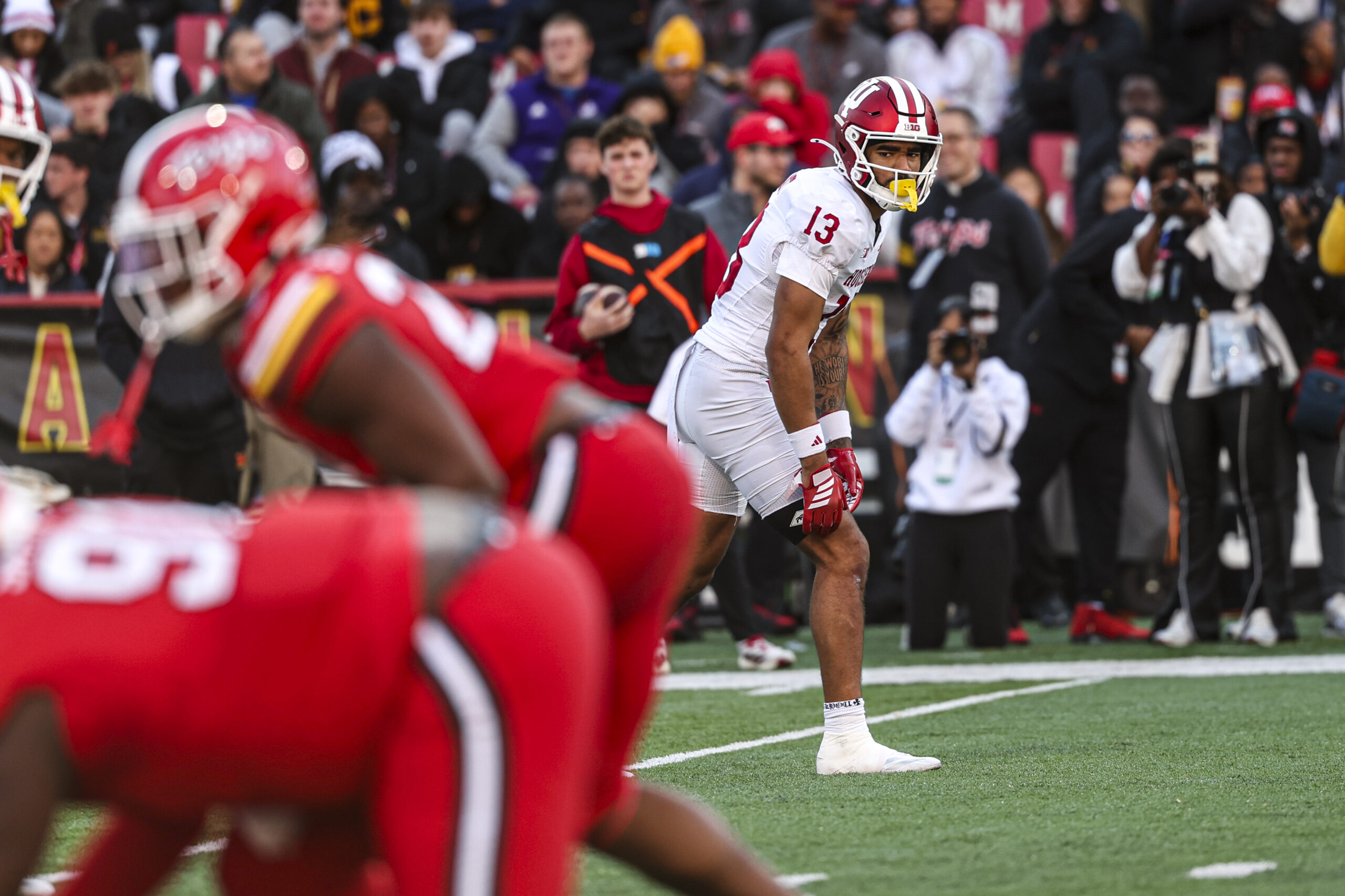 Elijah Sarratt (13), pictured here during a game in College Park, Md., followed coach Curt Cignetti from JMU to Indiana, where he has blossomed into one of the nation’s top receivers. (Photo By Dani Meersman/Indiana Athletics)