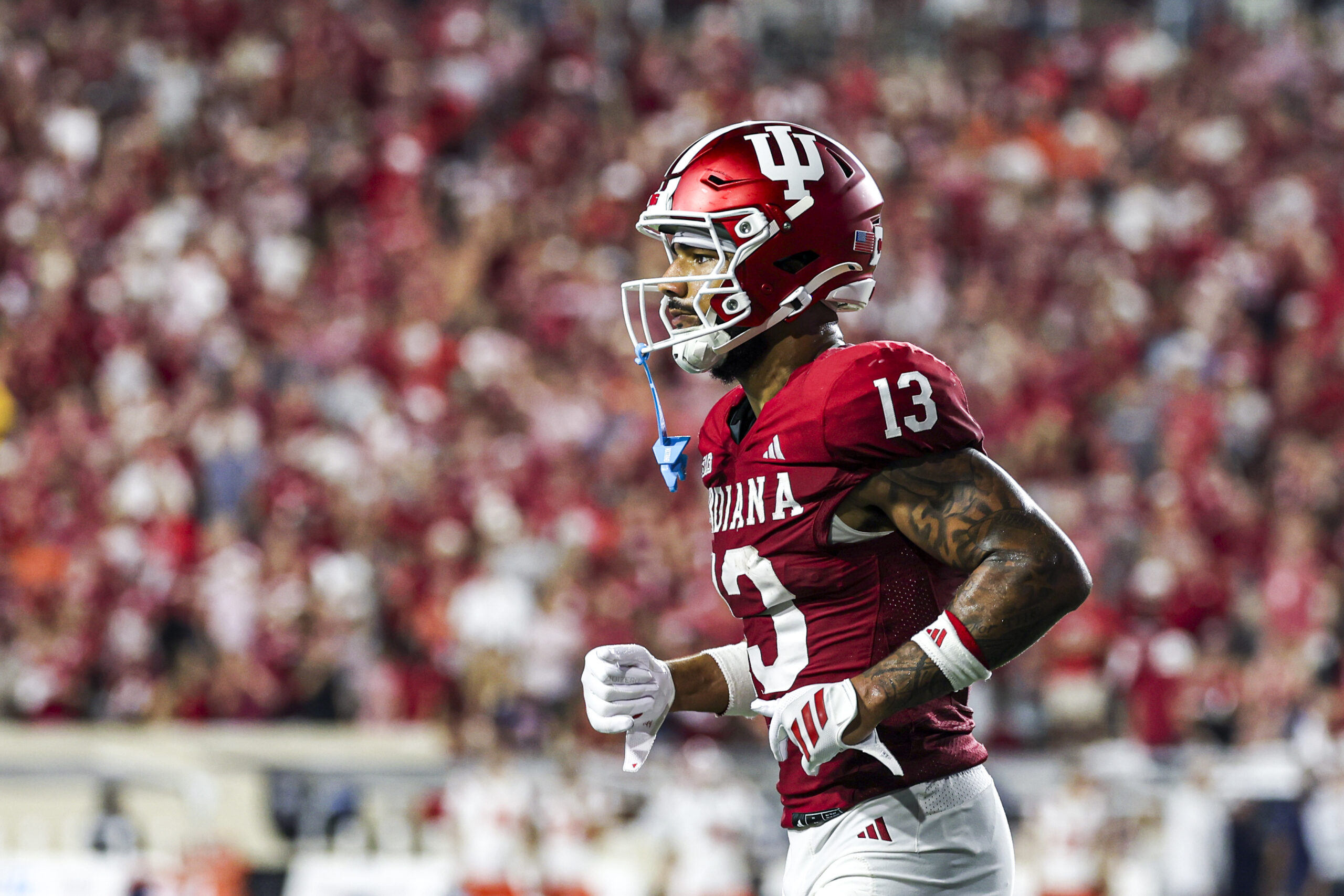 Receiver Elijah Sarratt (13), who also spent time at FCS St. Francis University and JMU, has made the third time a charm at Indiana. (Photo By Dani Meersman/Indiana Athletics)