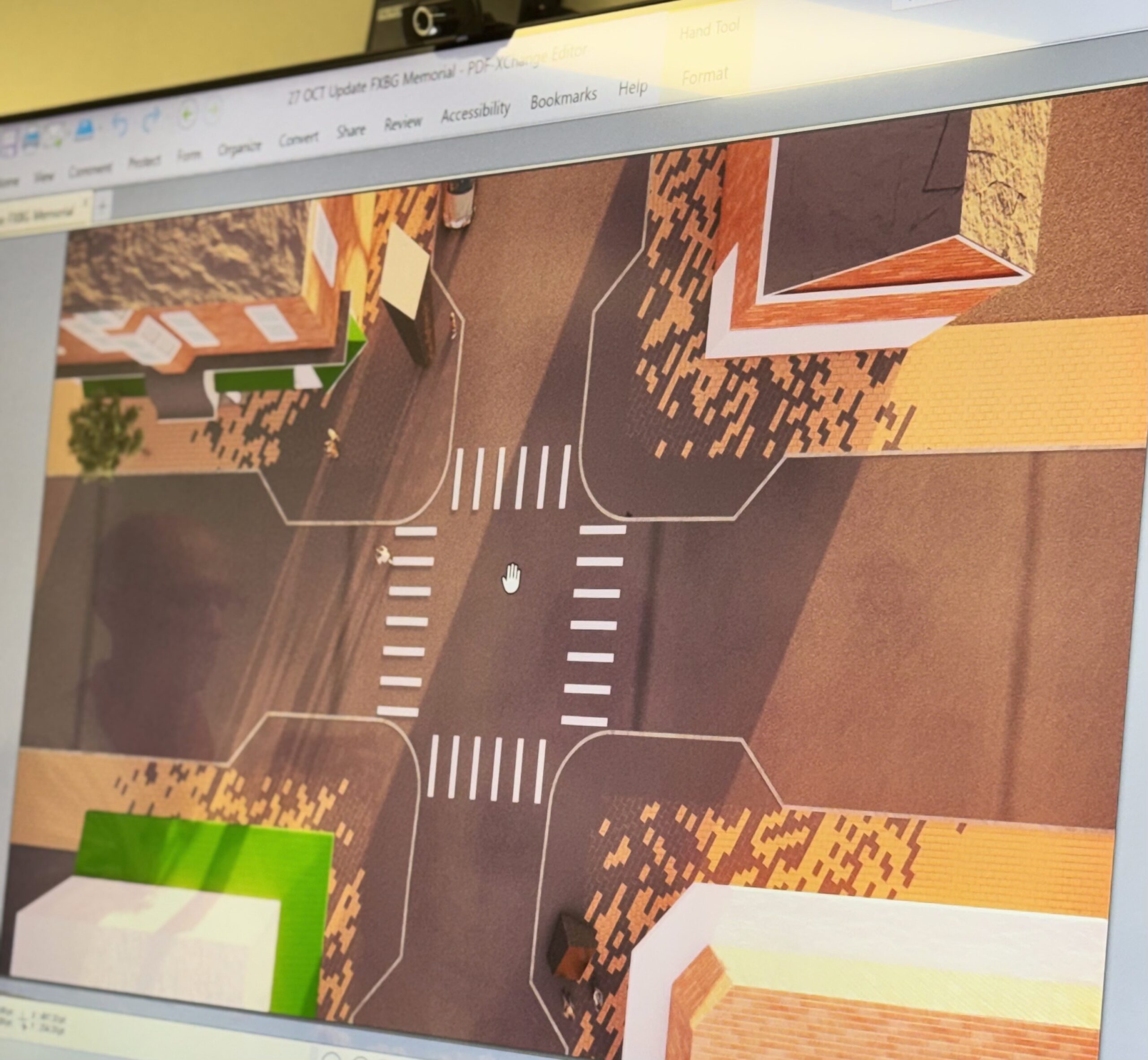The monument will be layered with bronze bricks, Otitigbe said, and will feature text detailing the memorial and the site. Black bricks will extend to the ground, which will also be finished in black.