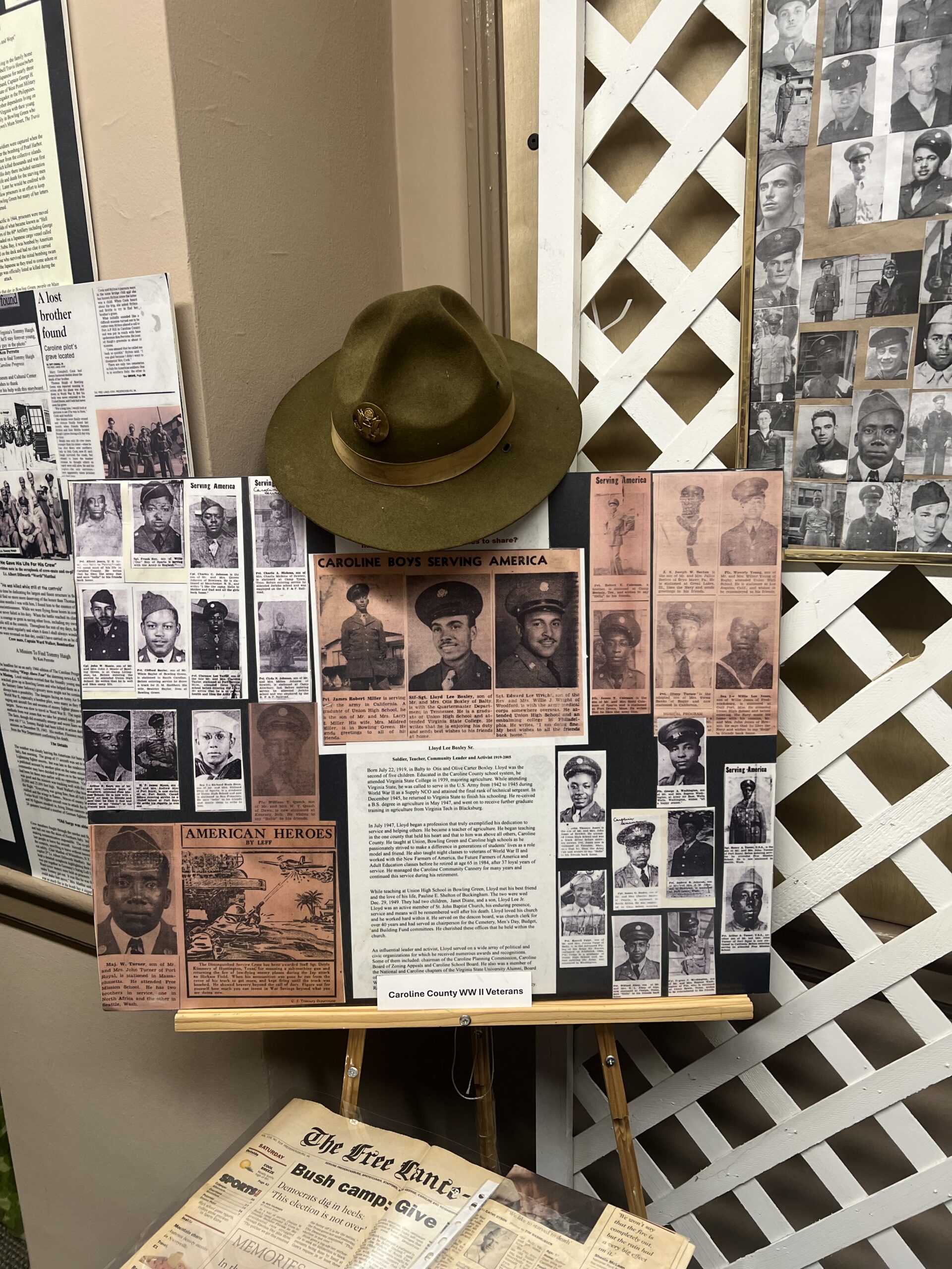 The exhibit includes military jackets, some worn by Caroline soldiers. It also tells the story of the United Service Organization (USO) buildings that were segregated in the county, with white service members and their families meeting at the Town Hall in Bowling Green and the Black soldiers and their families gathering at a building in front of the old Union High School. Brooks noted that, after the war, the county used the Black USO for recreation services before tearing it down in the late 1970s.