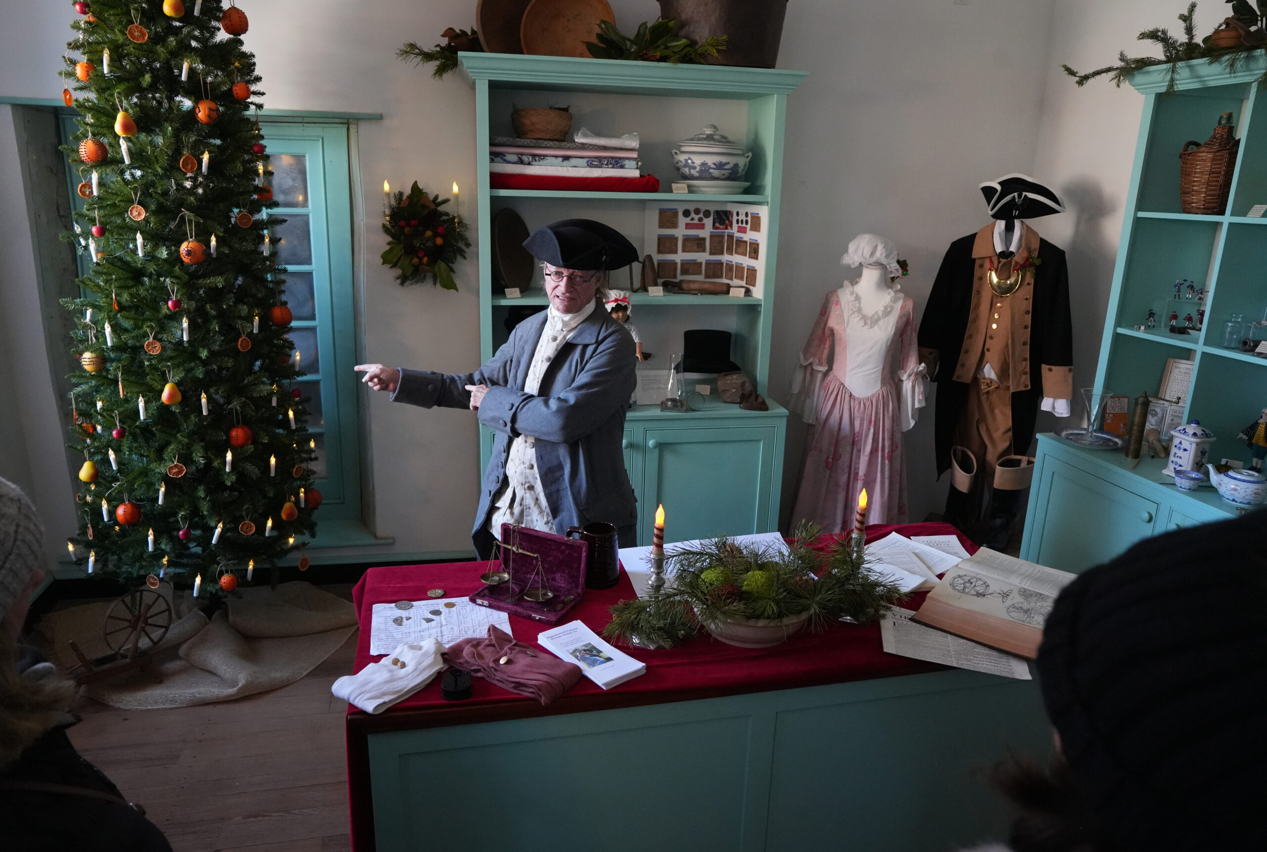 Local historian Tripp Wiggins of the Rappahannock Colonial Heritage Society talks with visitors to the Lewis Store during the 55th Annual Candlelight Tour ‘A Revolutionary Experience in Colonial Fredericksburg’. One story tells how George Washington wrote his mother, Mary Ball Washington, asking her to buy cloth, hose, and thread from Mr. Lewis’ store. He also made other purchases such as shoe buckles, salt, and mirrors for over 25 years.