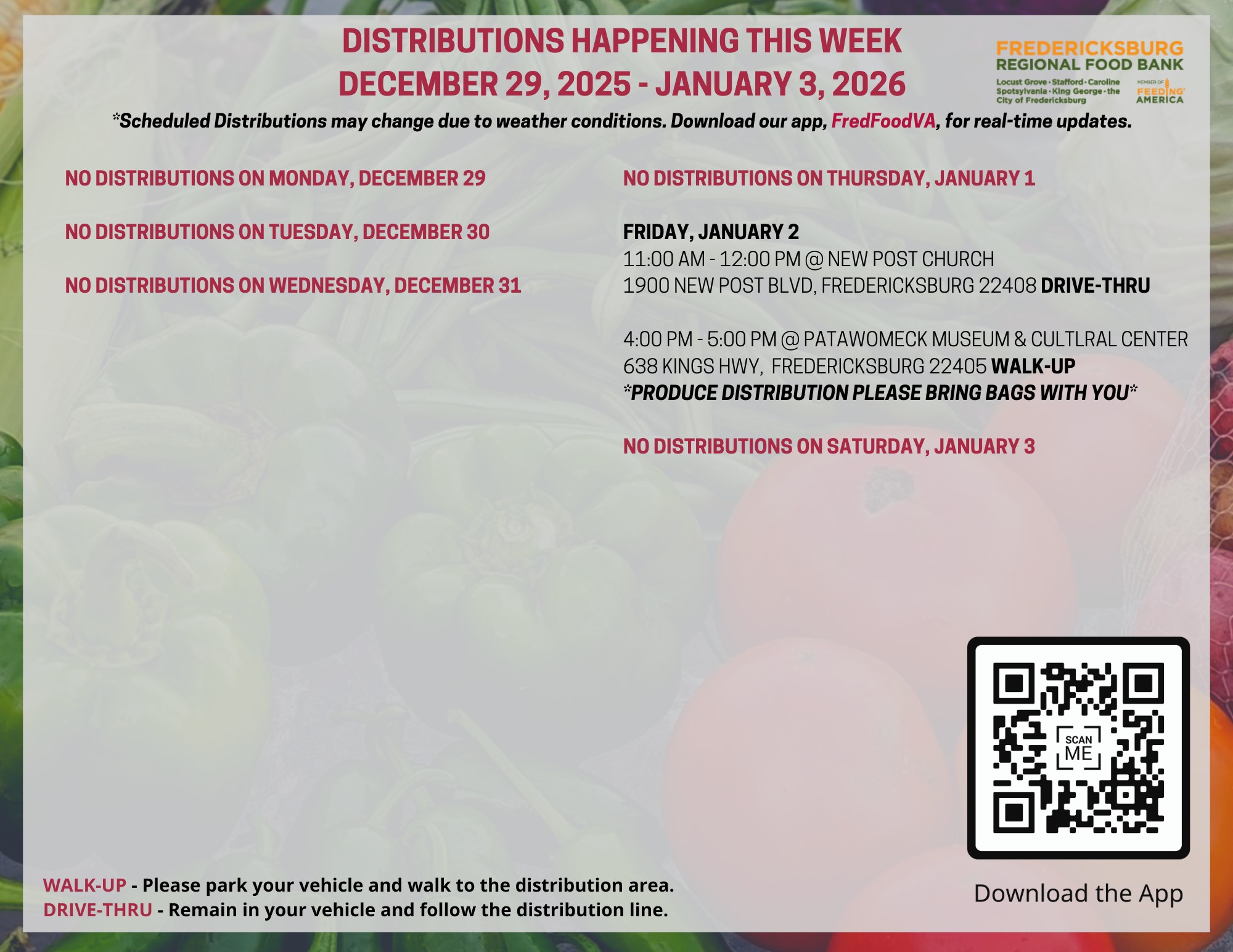 Drive-thru visitors are asked to leave space between vehicles and avoid blocking entrances and exits to keep traffic moving safely. No identification is required, though participants will be asked a few brief questions to help staff serve everyone efficiently.