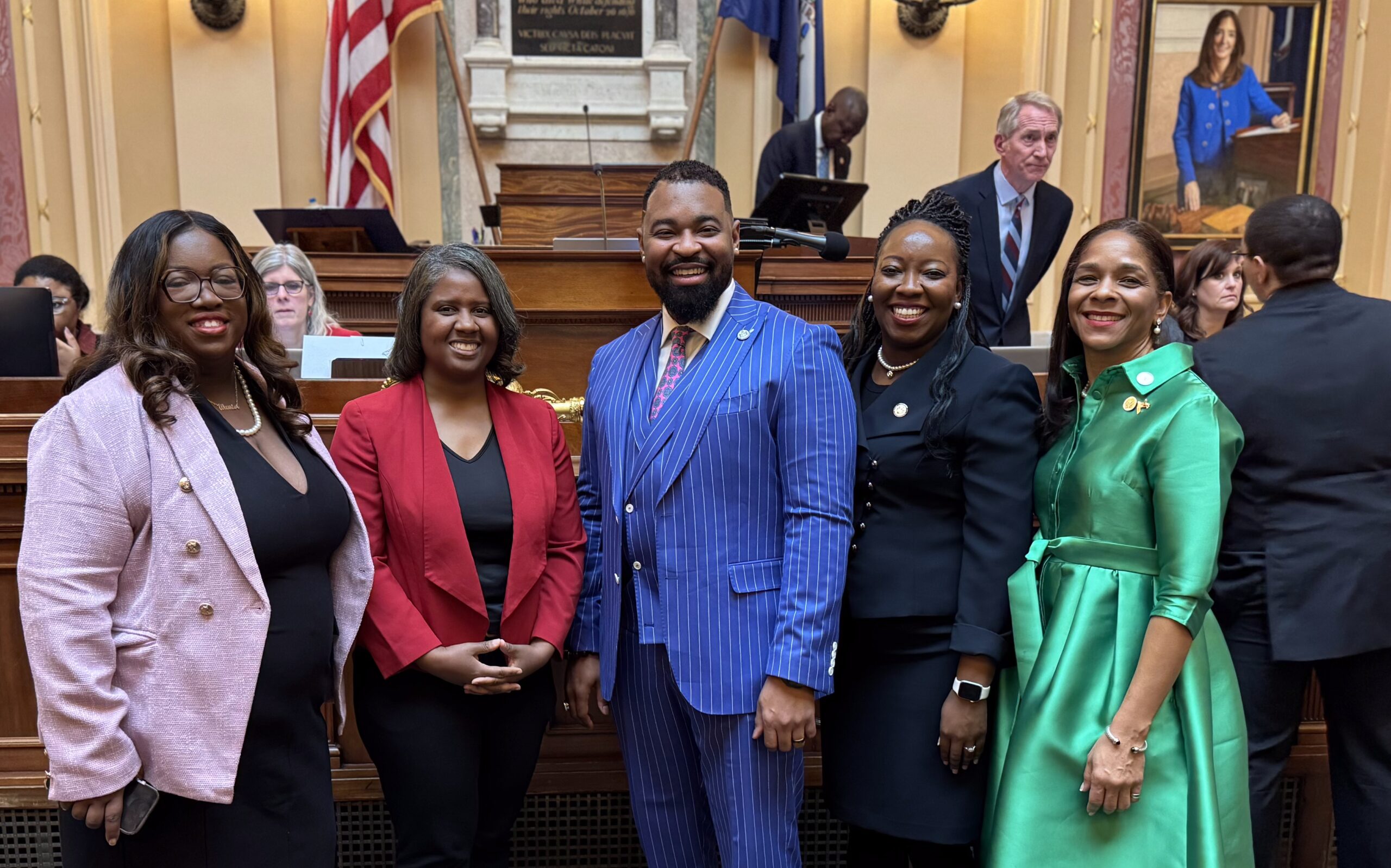 House Democrats representing the Fredericksburg area pose for a photo during a break in Wednesday’s General Assembly session. From left, Del. Candi Mundon King, Del.-elect Margaret Franklin, Del. Joshua Cole, Del. Stacey Carroll and Del. Nicole Cole. (Photo courtesy of Del. Joshua Cole)