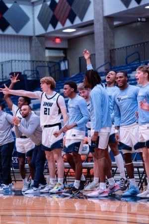 The University of Mary Washington men's basketball team's bench celebrates during a victory earlier this season. (Photo courtesy of UMW Athletics).
