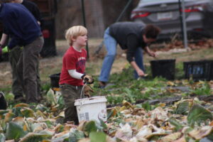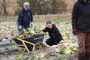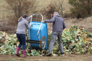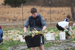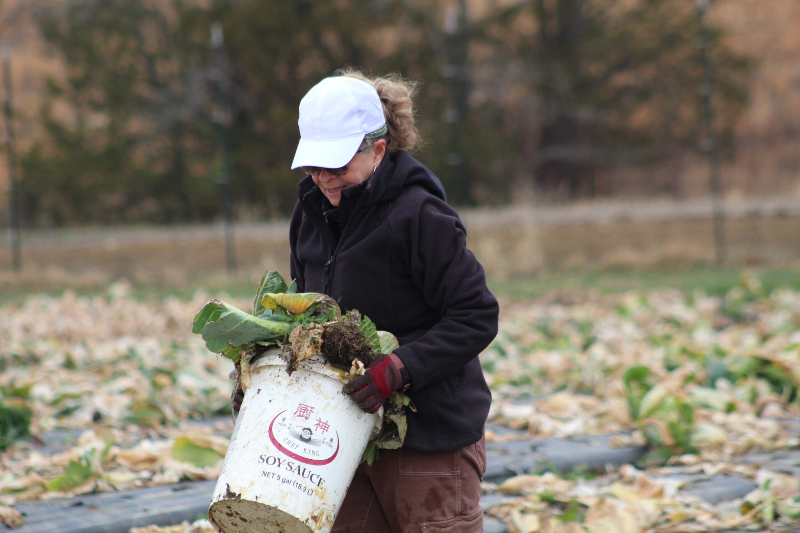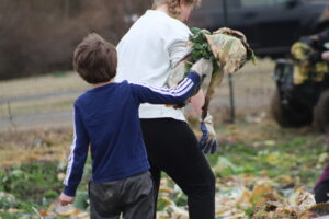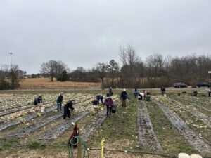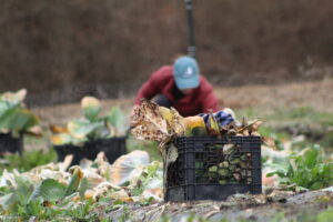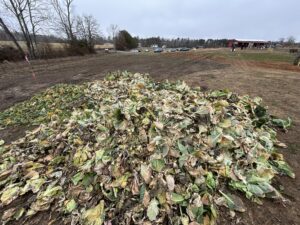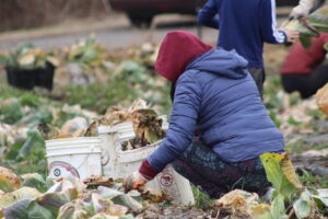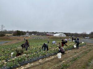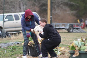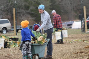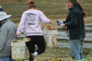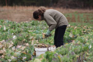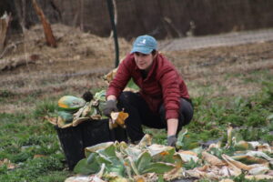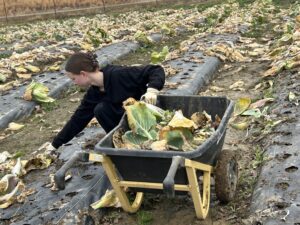 The crew pulled old cabbage and broccoli stalks to be composted and removed damaged collard leaves. It wasn’t planting or harvesting—just the important cleanup work that has to happen before spring crops go in.