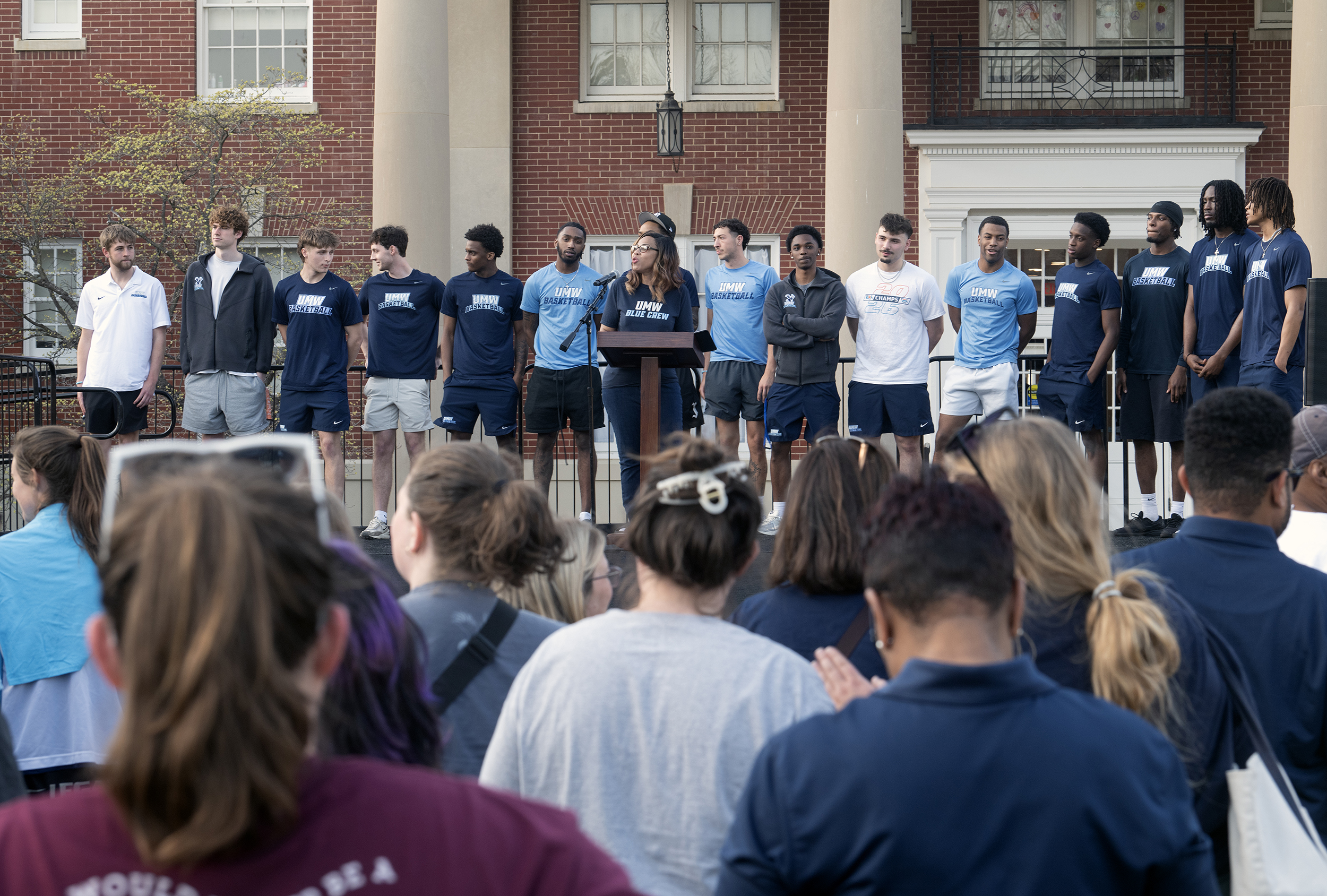 Students, faculty and alumni gathered in Ball Circle Tuesday night for UMW’s Soar & Roar Send-Off Rally as the Eagles' men’s basketball team headed to Indianapolis for the NCAA Division III championship game. (Photo by Jeff Kearney)