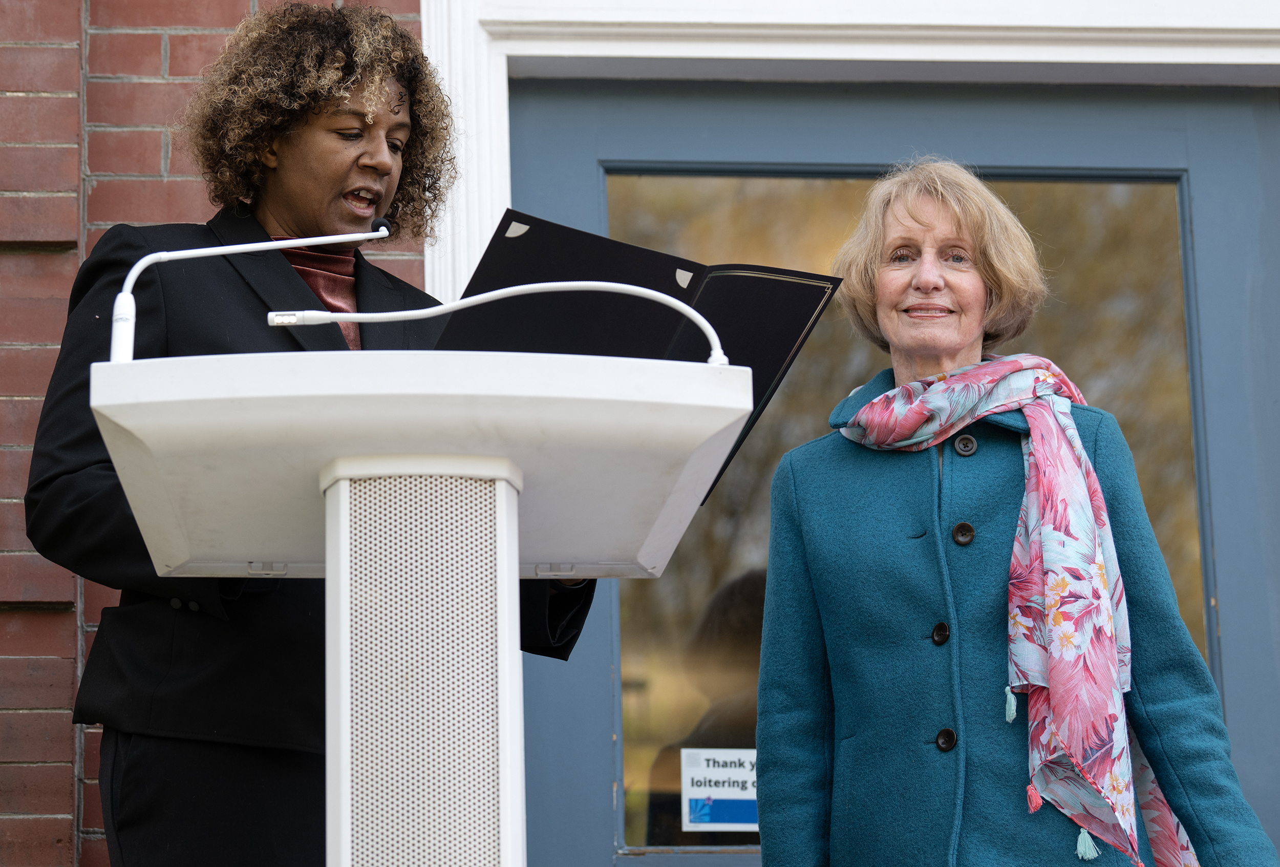 City councilor Joy Crump addresses the crowd at the Arbor Day celebration.