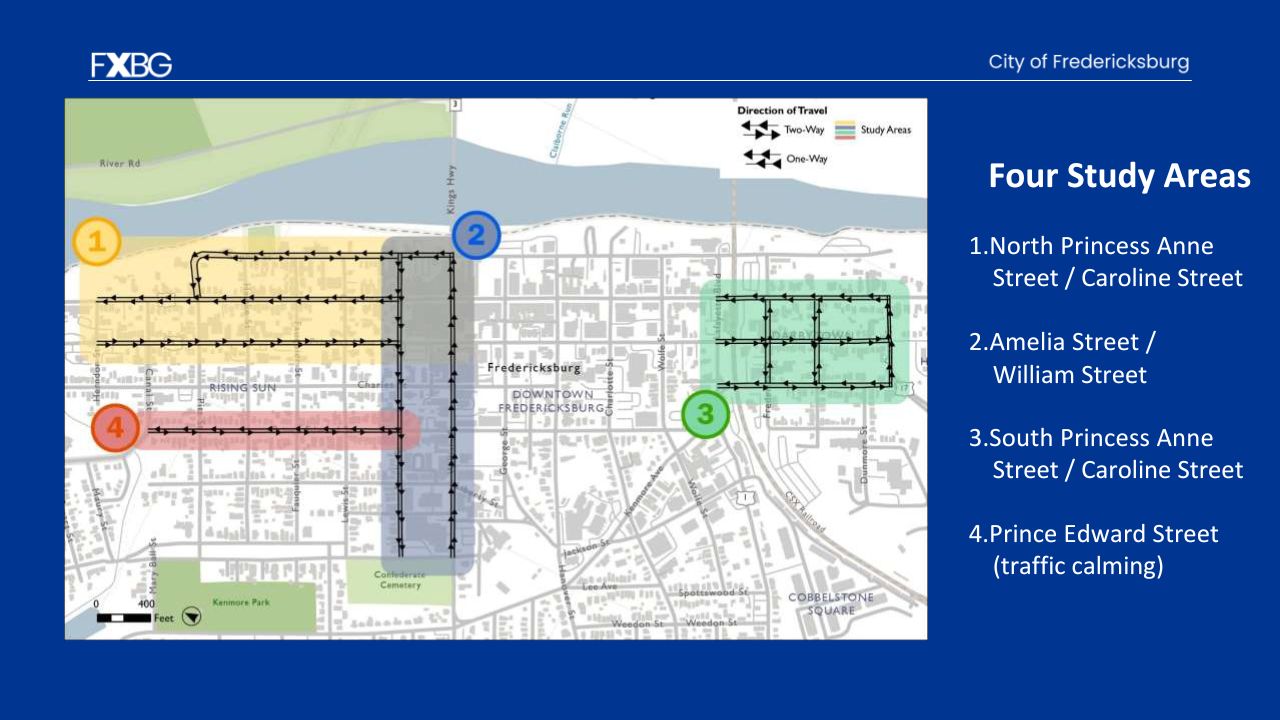 Other changes include converting the southern end of Princess Anne Street to two-way traffic and adding two-way bicycle lanes on Caroline Street in conjunction with the Dixon Connector Trail project. To compensate for changing traffic patterns, the study also calls for converting nearby Frederick and Princess Elizabeth streets to one-way traffic.