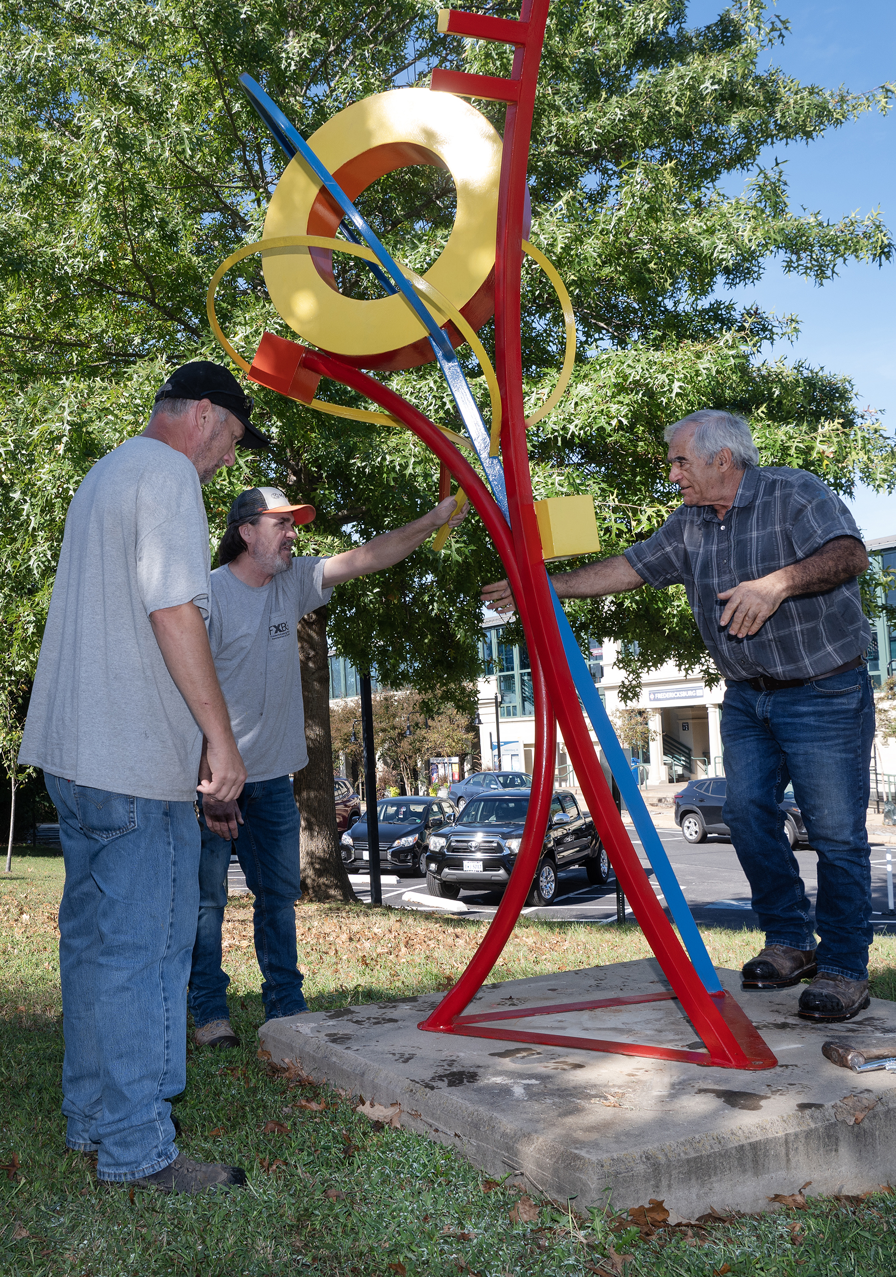 Artist Hanna Jubran coordinates with city parks workers to position his sculpture “In Motion” for installation at the VRE station as part of the Fredericksburg Public Sculpture Project.
