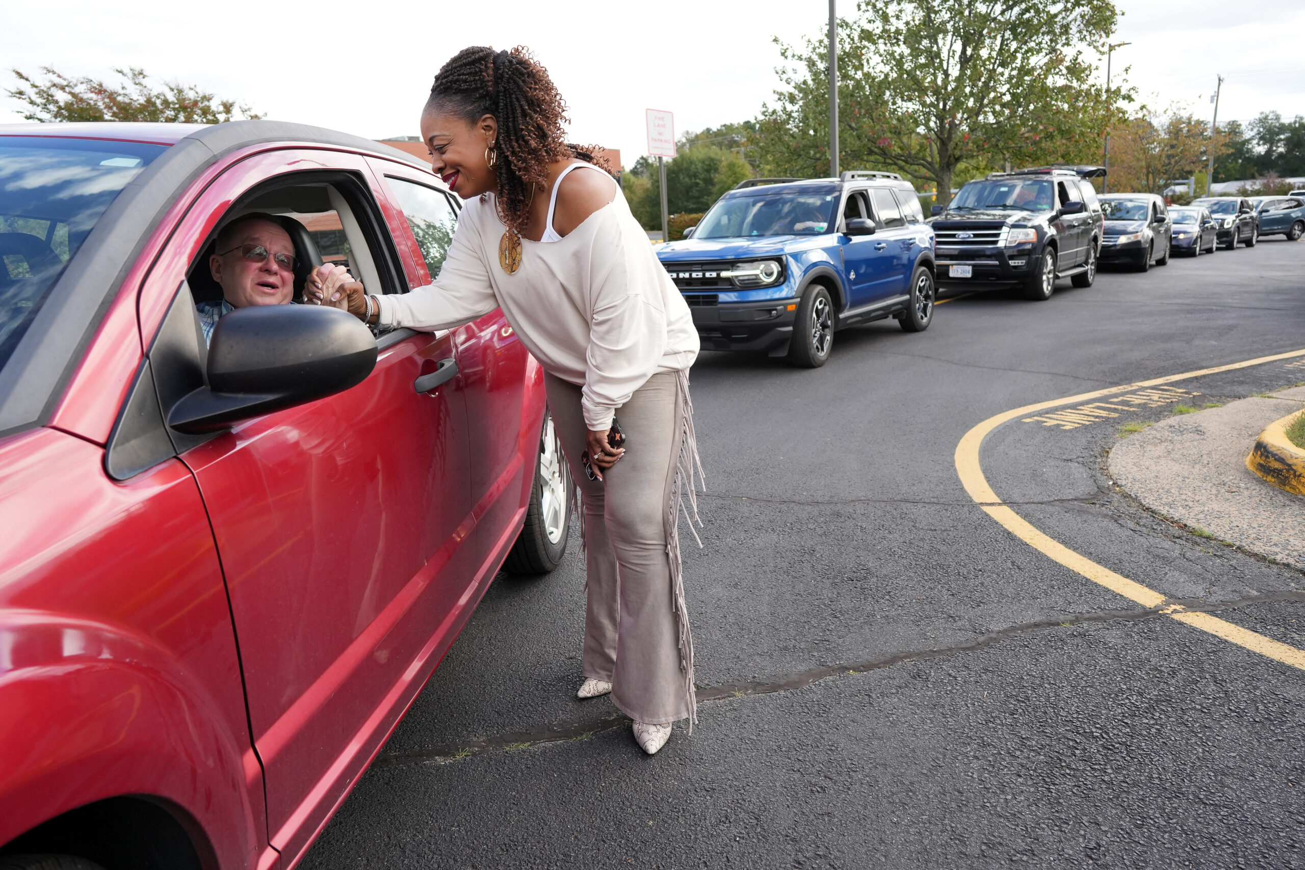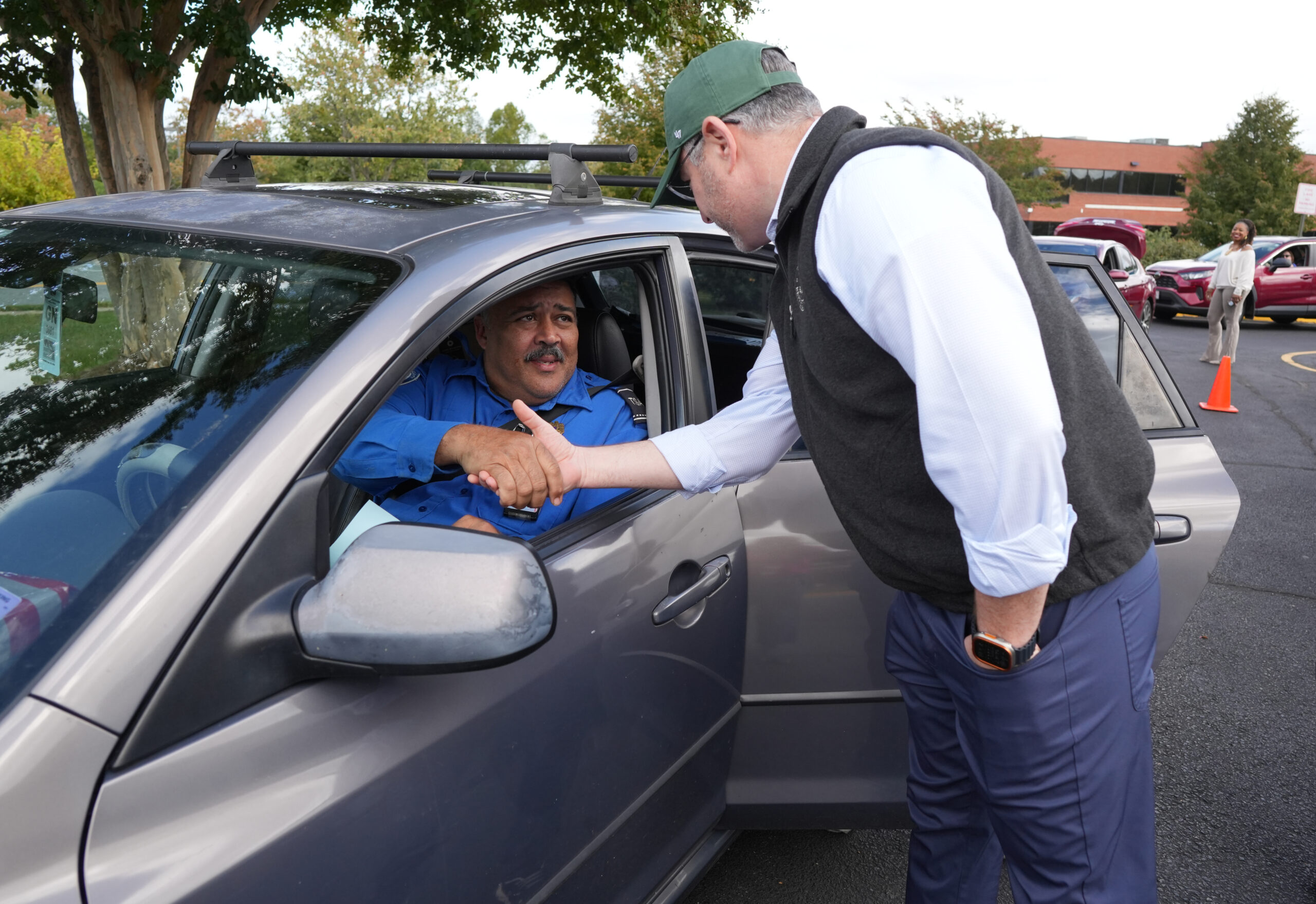 Vindman shakes hands with a TSA employee in line to receive food aid during a pop-up event hosted by the Fredericksburg Food Bank at the Stafford campus of Germanna Community College on Friday afternoon.
