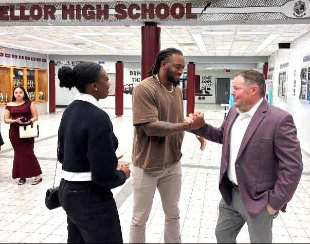 EJ Jenkins (center) shakes hands with Brett Gibbons, one of his former high school coaches. (Photo by Jamar Billingsley)