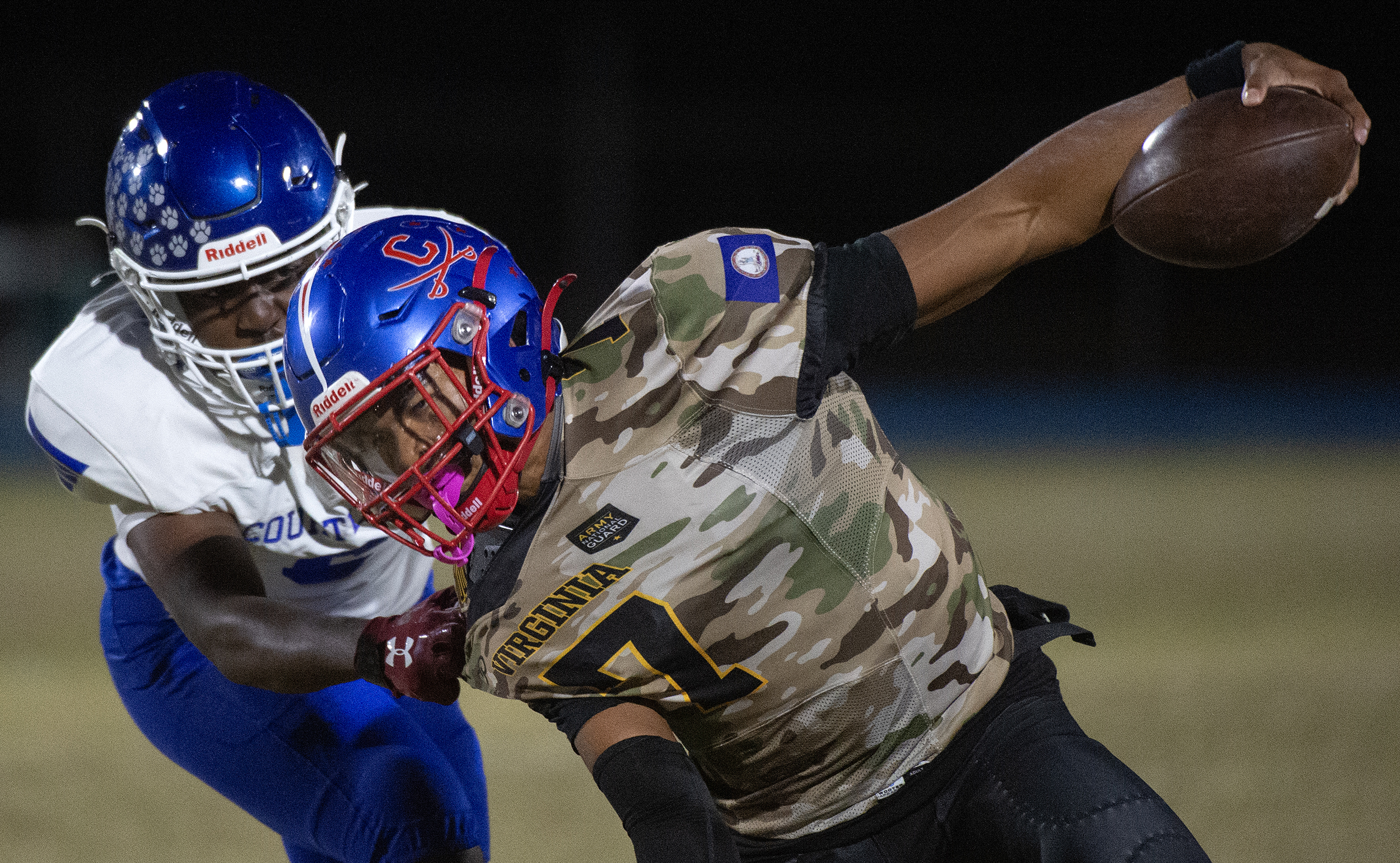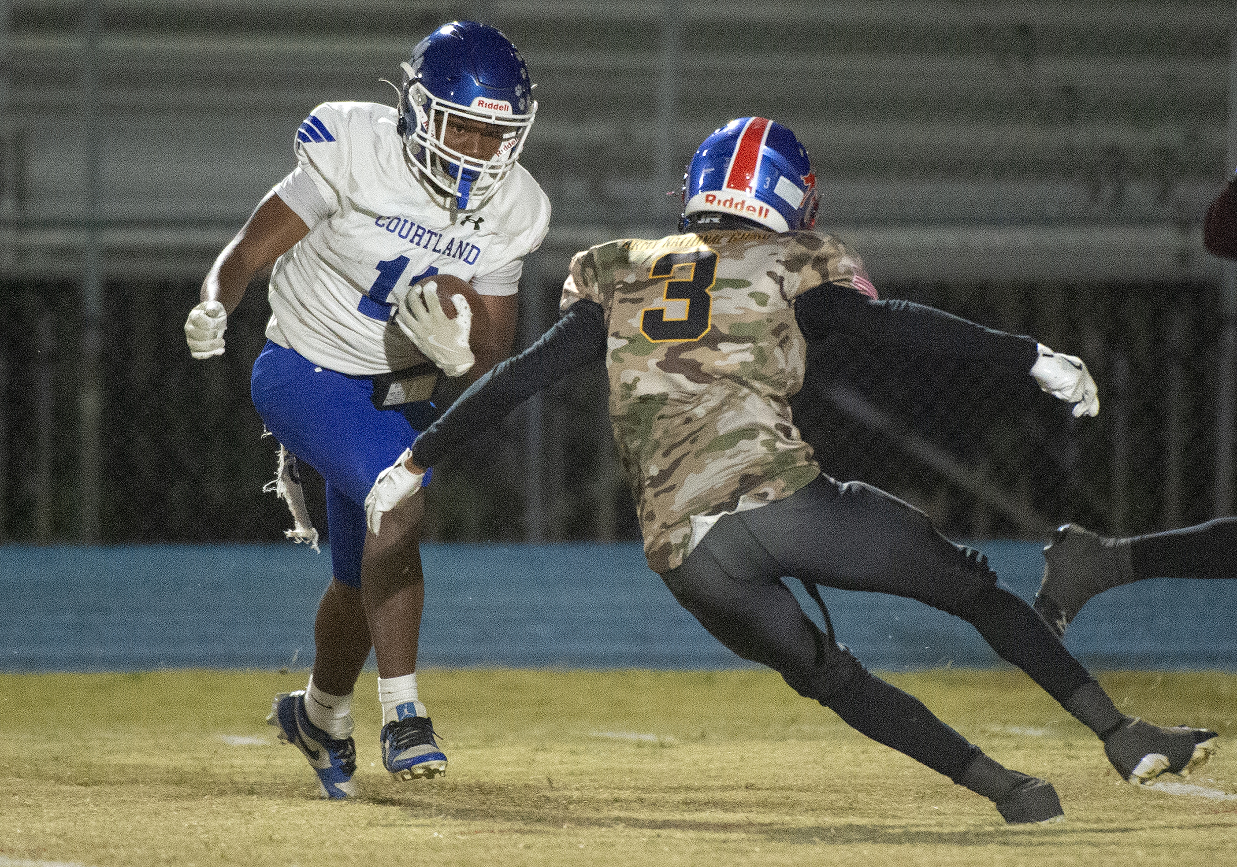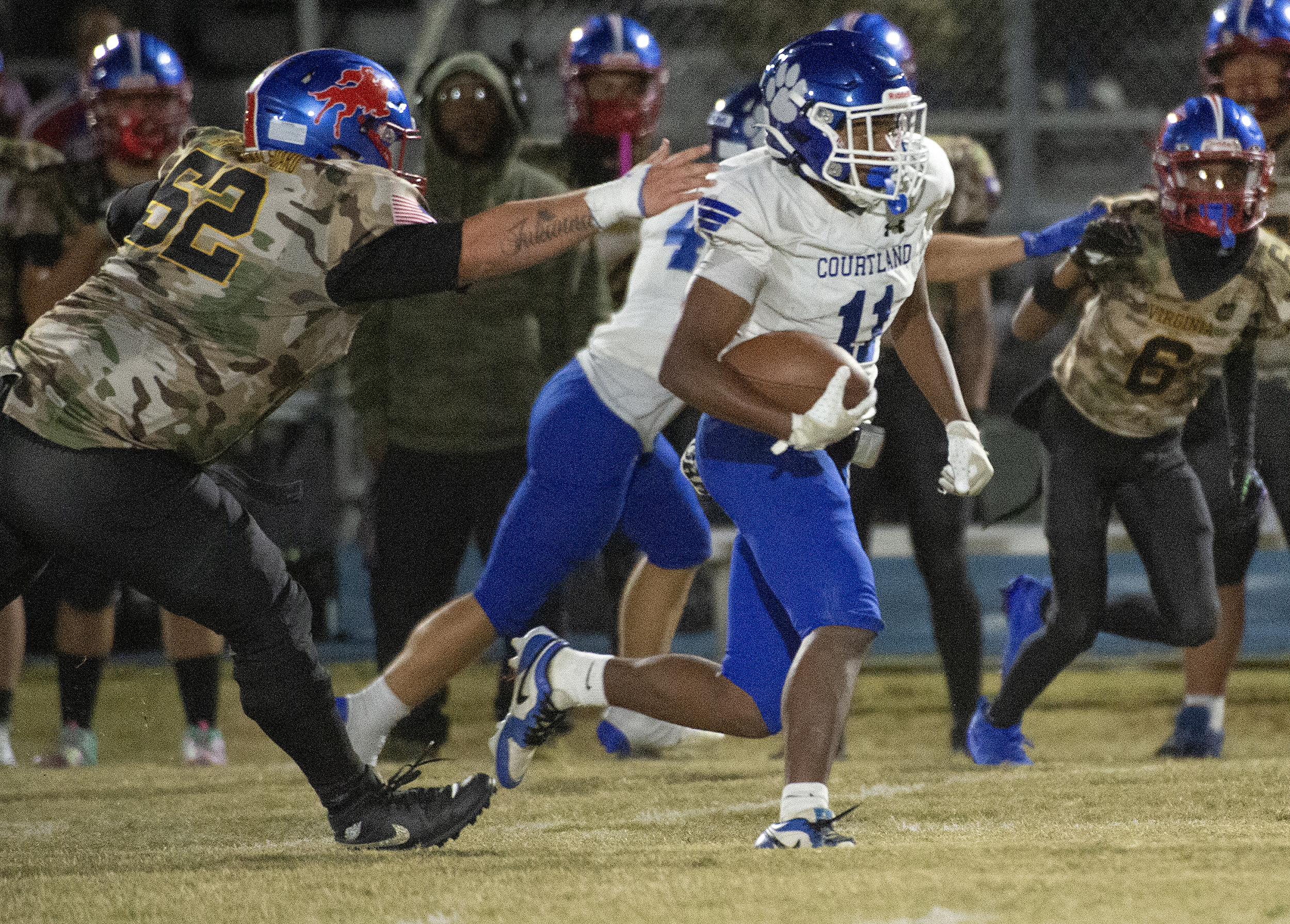 Cougar Princeton Watson (11) looks to zig before Cavalier Christopher Giles (3) can zag during Courtland’s win over Caroline Friday October 24, 2025. Photo by Jeff Kearney.