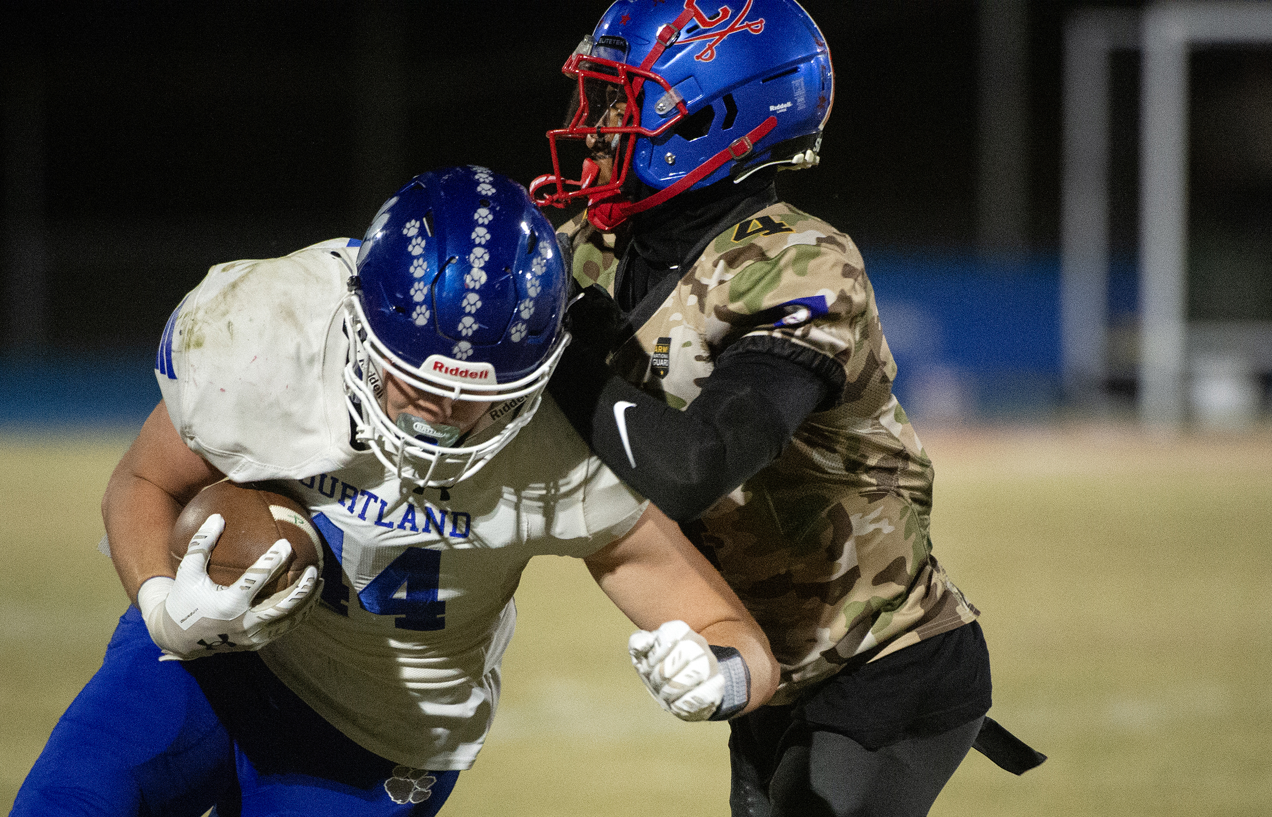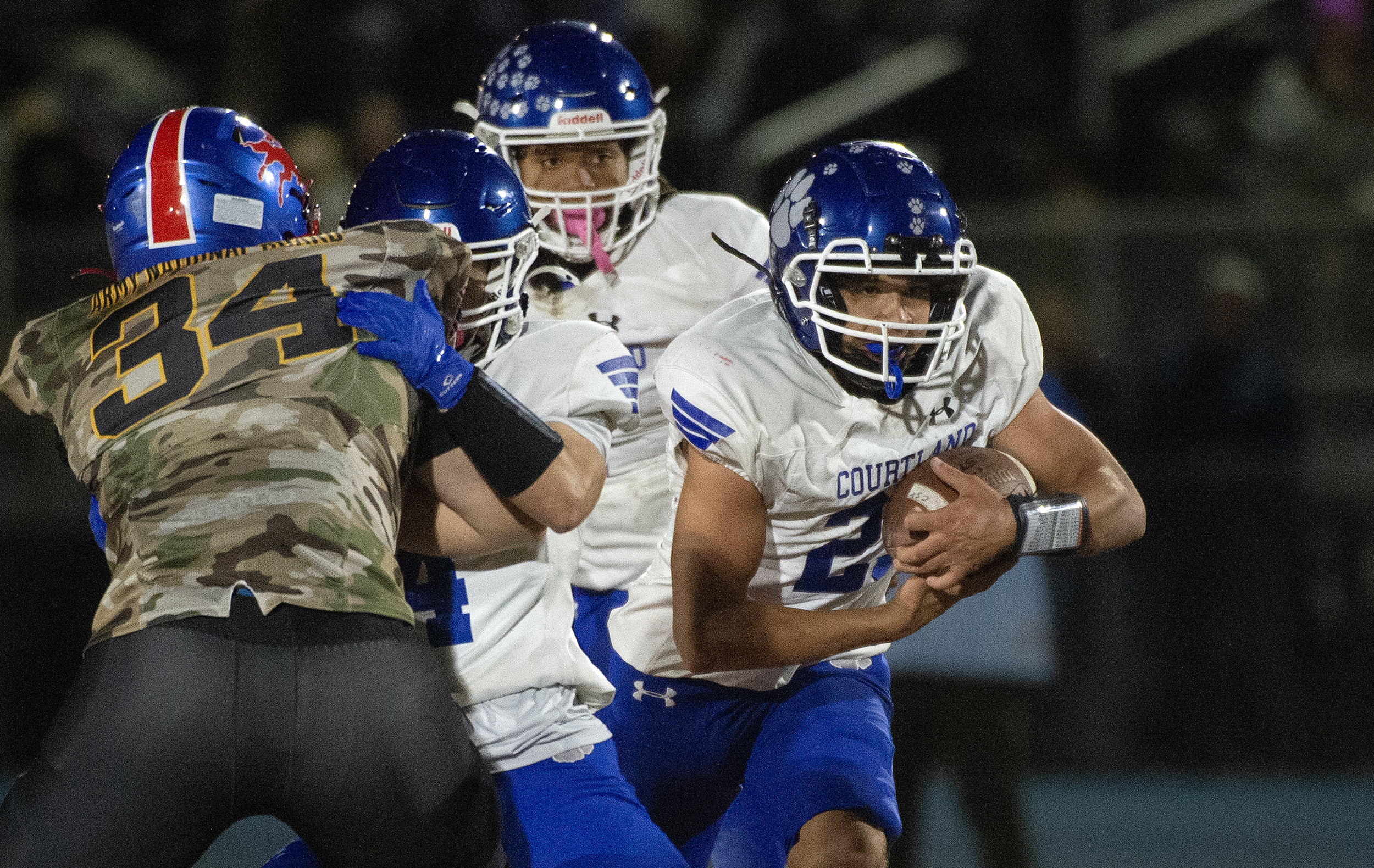 After receiving the ball Cougar Keegan Parker (44) keeps his head down and powers forward against Cavalier Blair Morris (4) as Courtland upends Caroline’s perfect season Friday October 24, 2025. Photo by Jeff Kearney.