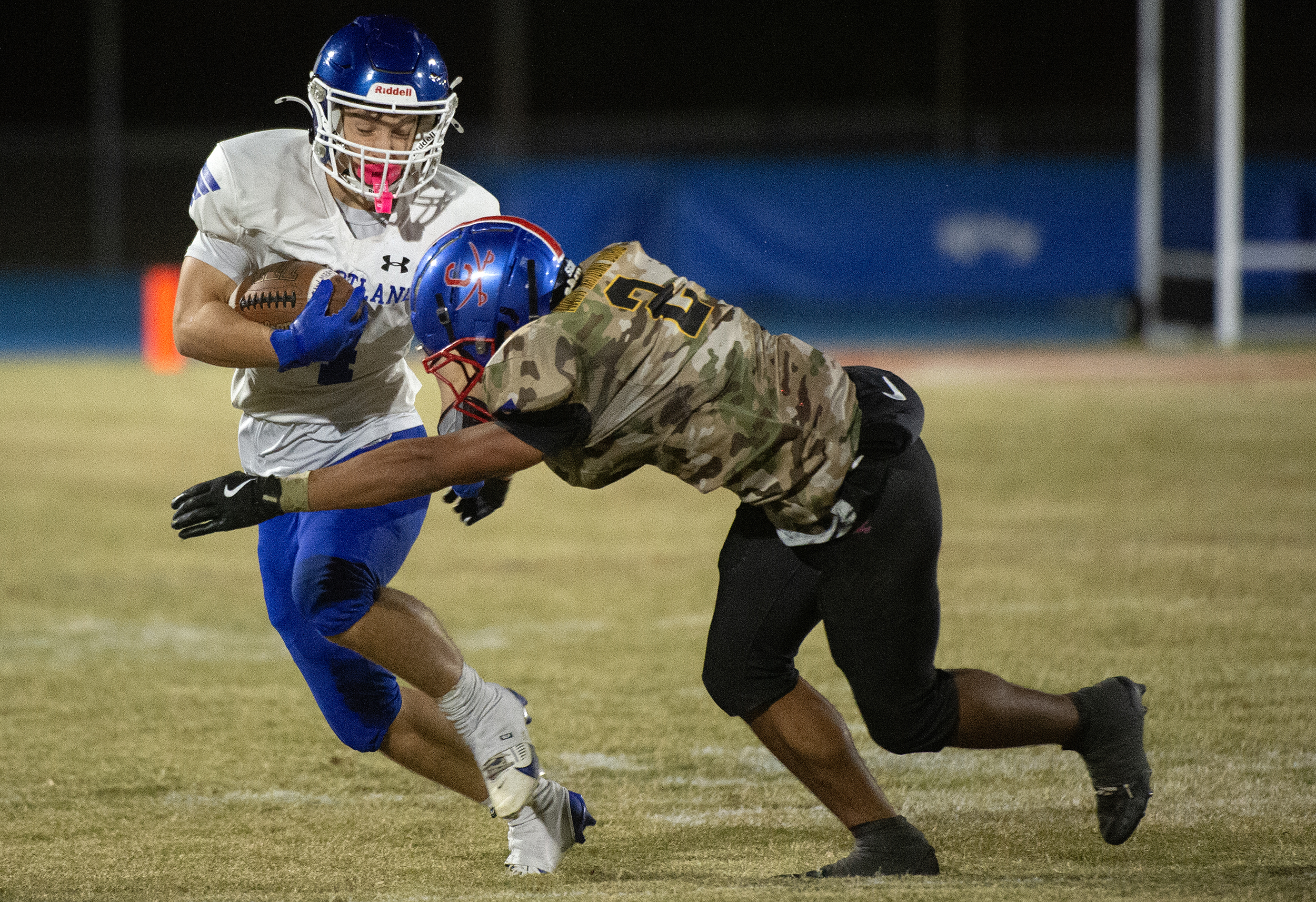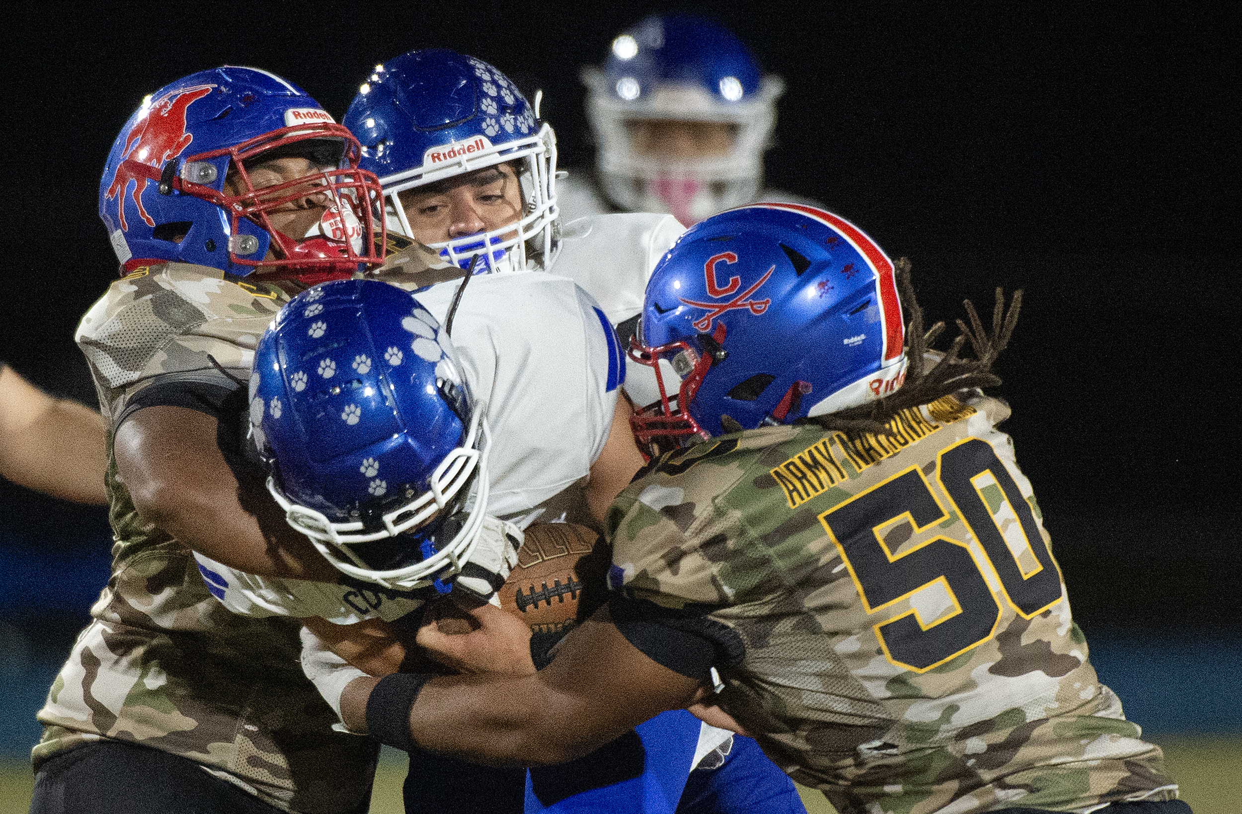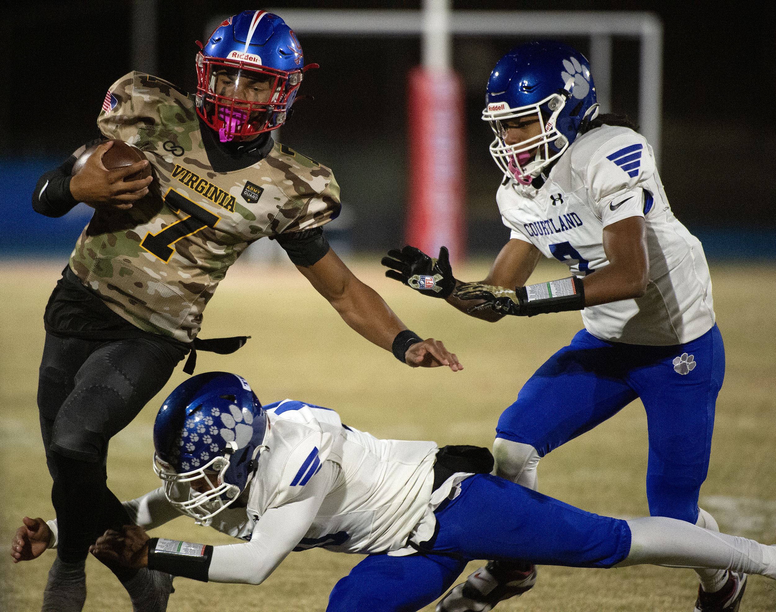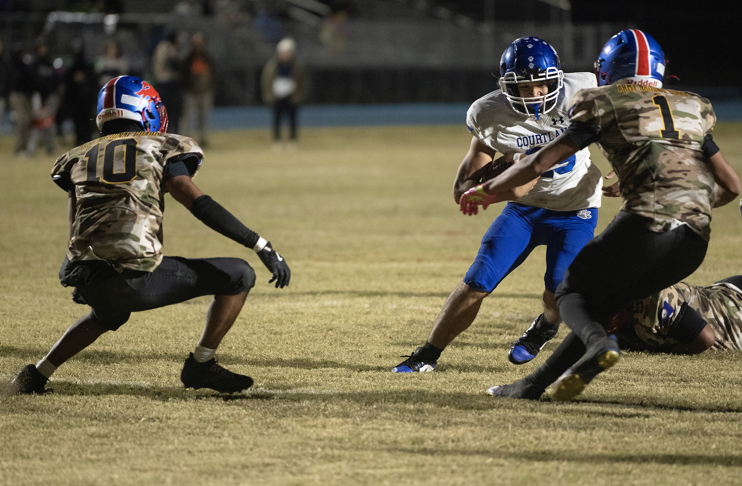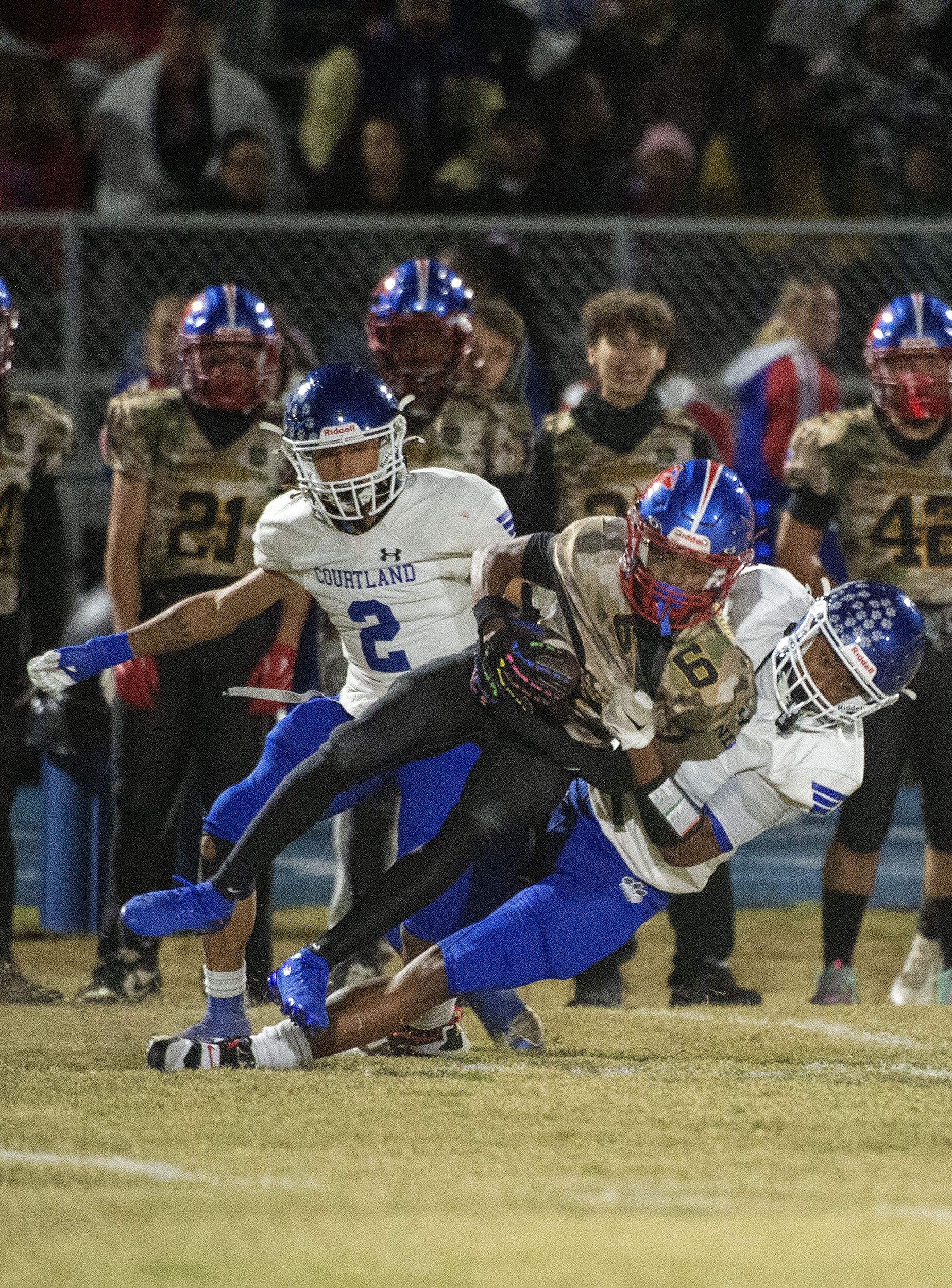 Caroline’s Ethan Sablan (10) Zayvion Tompkins (1) look for a way to stop Cougar Tyrik Newman (29) from making it into the end zone again during Courtland’s win over the Cavaliers Friday October 24, 2025. Photo by Jeff Kearney.